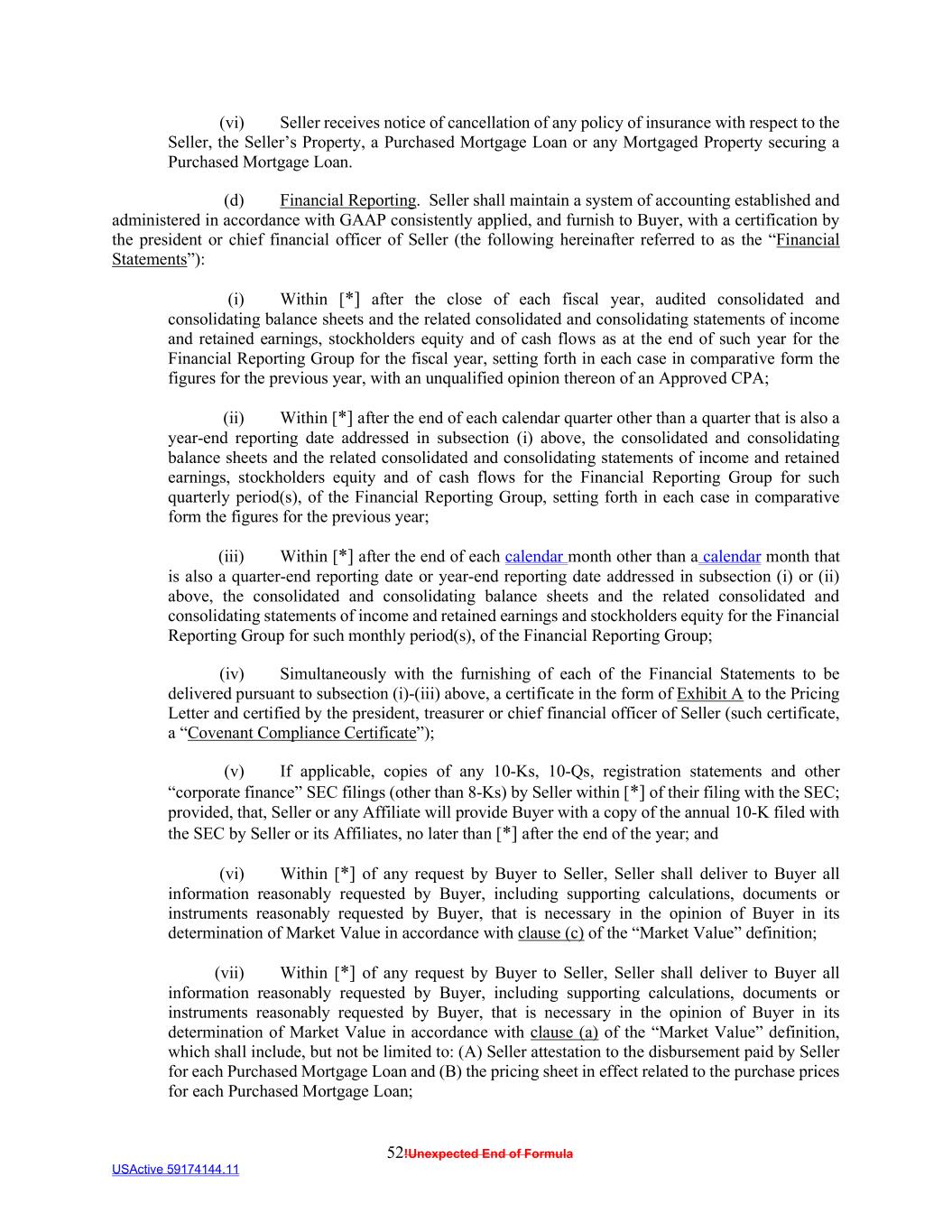52!Unexpected End of Formula USActive 59174144.11 (vi) Seller receives notice of cancellation of any policy of insurance with respect to the Seller, the Seller’s Property, a Purchased Mortgage Loan or any Mortgaged Property securing a Purchased Mortgage Loan. (d) Financial Reporting. Seller shall maintain a system of accounting established and administered in accordance with GAAP consistently applied, and furnish to Buyer, with a certification by the president or chief financial officer of Seller (the following hereinafter referred to as the “Financial Statements”): (i) Within [*] after the close of each fiscal year, audited consolidated and consolidating balance sheets and the related consolidated and consolidating statements of income and retained earnings, stockholders equity and of cash flows as at the end of such year for the Financial Reporting Group for the fiscal year, setting forth in each case in comparative form the figures for the previous year, with an unqualified opinion thereon of an Approved CPA; (ii) Within [*] after the end of each calendar quarter other than a quarter that is also a year-end reporting date addressed in subsection (i) above, the consolidated and consolidating balance sheets and the related consolidated and consolidating statements of income and retained earnings, stockholders equity and of cash flows for the Financial Reporting Group for such quarterly period(s), of the Financial Reporting Group, setting forth in each case in comparative form the figures for the previous year; (iii) Within [*] after the end of each calendar month other than a calendar month that is also a quarter-end reporting date or year-end reporting date addressed in subsection (i) or (ii) above, the consolidated and consolidating balance sheets and the related consolidated and consolidating statements of income and retained earnings and stockholders equity for the Financial Reporting Group for such monthly period(s), of the Financial Reporting Group; (iv) Simultaneously with the furnishing of each of the Financial Statements to be delivered pursuant to subsection (i)-(iii) above, a certificate in the form of Exhibit A to the Pricing Letter and certified by the president, treasurer or chief financial officer of Seller (such certificate, a “Covenant Compliance Certificate”); (v) If applicable, copies of any 10-Ks, 10-Qs, registration statements and other “corporate finance” SEC filings (other than 8-Ks) by Seller within [*] of their filing with the SEC; provided, that, Seller or any Affiliate will provide Buyer with a copy of the annual 10-K filed with the SEC by Seller or its Affiliates, no later than [*] after the end of the year; and (vi) Within [*] of any request by Buyer to Seller, Seller shall deliver to Buyer all information reasonably requested by Buyer, including supporting calculations, documents or instruments reasonably requested by Buyer, that is necessary in the opinion of Buyer in its determination of Market Value in accordance with clause (c) of the “Market Value” definition; (vii) Within [*] of any request by Buyer to Seller, Seller shall deliver to Buyer all information reasonably requested by Buyer, including supporting calculations, documents or instruments reasonably requested by Buyer, that is necessary in the opinion of Buyer in its determination of Market Value in accordance with clause (a) of the “Market Value” definition, which shall include, but not be limited to: (A) Seller attestation to the disbursement paid by Seller for each Purchased Mortgage Loan and (B) the pricing sheet in effect related to the purchase prices for each Purchased Mortgage Loan;