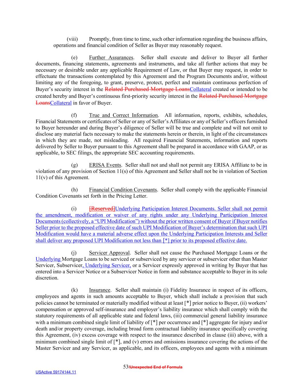 53!Unexpected End of Formula USActive 59174144.11 (viii) Promptly, from time to time, such other information regarding the business affairs, operations and financial condition of Seller as Buyer may reasonably request. (e) Further Assurances. Seller shall execute and deliver to Buyer all further documents, financing statements, agreements and instruments, and take all further actions that may be necessary or desirable under any applicable Requirement of Law, or that Buyer may request, in order to effectuate the transactions contemplated by this Agreement and the Program Documents and/or, without limiting any of the foregoing, to grant, preserve, protect, perfect and maintain continuous perfection of Buyer’s security interest in the Related Purchased Mortgage LoansCollateral created or intended to be created hereby and Buyer’s continuous first-priority security interest in the Related Purchased Mortgage LoansCollateral in favor of Buyer. (f) True and Correct Information. All information, reports, exhibits, schedules, Financial Statements or certificates of Seller or any of Seller’s Affiliates or any of Seller’s officers furnished to Buyer hereunder and during Buyer’s diligence of Seller will be true and complete and will not omit to disclose any material facts necessary to make the statements herein or therein, in light of the circumstances in which they are made, not misleading. All required Financial Statements, information and reports delivered by Seller to Buyer pursuant to this Agreement shall be prepared in accordance with GAAP, or as applicable, to SEC filings, the appropriate SEC accounting requirements. (g) ERISA Events. Seller shall not and shall not permit any ERISA Affiliate to be in violation of any provision of Section 11(s) of this Agreement and Seller shall not be in violation of Section 11(v) of this Agreement. (h) Financial Condition Covenants. Seller shall comply with the applicable Financial Condition Covenants set forth in the Pricing Letter. (i) [Reserved]Underlying Participation Interest Documents. Seller shall not permit the amendment, modification or waiver of any rights under any Underlying Participation Interest Documents (collectively, a “UPI Modification”) without the prior written consent of Buyer if Buyer notifies Seller prior to the proposed effective date of such UPI Modification of Buyer’s determination that such UPI Modification would have a material adverse effect upon the Underlying Participation Interests and Seller shall deliver any proposed UPI Modification not less than [*] prior to its proposed effective date. (j) Servicer Approval. Seller shall not cause the Purchased Mortgage Loans or the Underlying Mortgage Loans to be serviced or subserviced by any servicer or subservicer other than Master Servicer, Subservicer, Underlying Servicer, or a Servicer expressly approved in writing by Buyer that has entered into a Servicer Notice or a Subservicer Notice in form and substance acceptable to Buyer in its sole discretion. (k) Insurance. Seller shall maintain (i) Fidelity Insurance in respect of its officers, employees and agents in such amounts acceptable to Buyer, which shall include a provision that such policies cannot be terminated or materially modified without at least [*] prior notice to Buyer, (ii) workers’ compensation or approved self-insurance and employer’s liability insurance which shall comply with the statutory requirements of all applicable state and federal laws, (iii) commercial general liability insurance with a minimum combined single limit of liability of [*] per occurrence and [*] aggregate for injury and/or death and/or property coverage, including broad form contractual liability insurance specifically covering this Agreement, (iv) excess coverage with respect to the insurance described in clause (iii) above, with a minimum combined single limit of [*], and (v) errors and omissions insurance covering the actions of the Master Servicer and any Servicer, as applicable, and its officers, employees and agents with a minimum