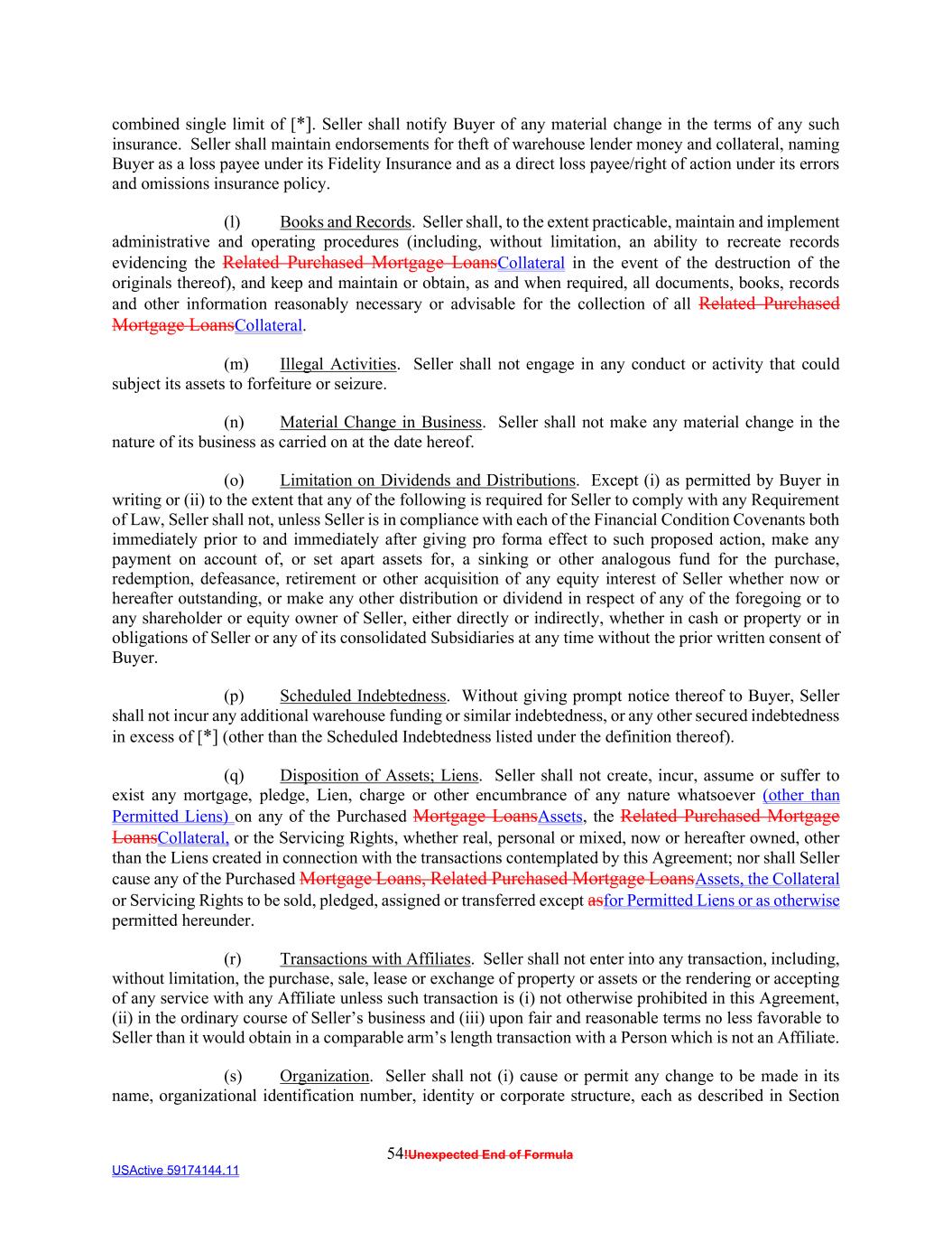 54!Unexpected End of Formula USActive 59174144.11 combined single limit of [*]. Seller shall notify Buyer of any material change in the terms of any such insurance. Seller shall maintain endorsements for theft of warehouse lender money and collateral, naming Buyer as a loss payee under its Fidelity Insurance and as a direct loss payee/right of action under its errors and omissions insurance policy. (l) Books and Records. Seller shall, to the extent practicable, maintain and implement administrative and operating procedures (including, without limitation, an ability to recreate records evidencing the Related Purchased Mortgage LoansCollateral in the event of the destruction of the originals thereof), and keep and maintain or obtain, as and when required, all documents, books, records and other information reasonably necessary or advisable for the collection of all Related Purchased Mortgage LoansCollateral. (m) Illegal Activities. Seller shall not engage in any conduct or activity that could subject its assets to forfeiture or seizure. (n) Material Change in Business. Seller shall not make any material change in the nature of its business as carried on at the date hereof. (o) Limitation on Dividends and Distributions. Except (i) as permitted by Buyer in writing or (ii) to the extent that any of the following is required for Seller to comply with any Requirement of Law, Seller shall not, unless Seller is in compliance with each of the Financial Condition Covenants both immediately prior to and immediately after giving pro forma effect to such proposed action, make any payment on account of, or set apart assets for, a sinking or other analogous fund for the purchase, redemption, defeasance, retirement or other acquisition of any equity interest of Seller whether now or hereafter outstanding, or make any other distribution or dividend in respect of any of the foregoing or to any shareholder or equity owner of Seller, either directly or indirectly, whether in cash or property or in obligations of Seller or any of its consolidated Subsidiaries at any time without the prior written consent of Buyer. (p) Scheduled Indebtedness. Without giving prompt notice thereof to Buyer, Seller shall not incur any additional warehouse funding or similar indebtedness, or any other secured indebtedness in excess of [*] (other than the Scheduled Indebtedness listed under the definition thereof). (q) Disposition of Assets; Liens. Seller shall not create, incur, assume or suffer to exist any mortgage, pledge, Lien, charge or other encumbrance of any nature whatsoever (other than Permitted Liens) on any of the Purchased Mortgage LoansAssets, the Related Purchased Mortgage LoansCollateral, or the Servicing Rights, whether real, personal or mixed, now or hereafter owned, other than the Liens created in connection with the transactions contemplated by this Agreement; nor shall Seller cause any of the Purchased Mortgage Loans, Related Purchased Mortgage LoansAssets, the Collateral or Servicing Rights to be sold, pledged, assigned or transferred except asfor Permitted Liens or as otherwise permitted hereunder. (r) Transactions with Affiliates. Seller shall not enter into any transaction, including, without limitation, the purchase, sale, lease or exchange of property or assets or the rendering or accepting of any service with any Affiliate unless such transaction is (i) not otherwise prohibited in this Agreement, (ii) in the ordinary course of Seller’s business and (iii) upon fair and reasonable terms no less favorable to Seller than it would obtain in a comparable arm’s length transaction with a Person which is not an Affiliate. (s) Organization. Seller shall not (i) cause or permit any change to be made in its name, organizational identification number, identity or corporate structure, each as described in Section