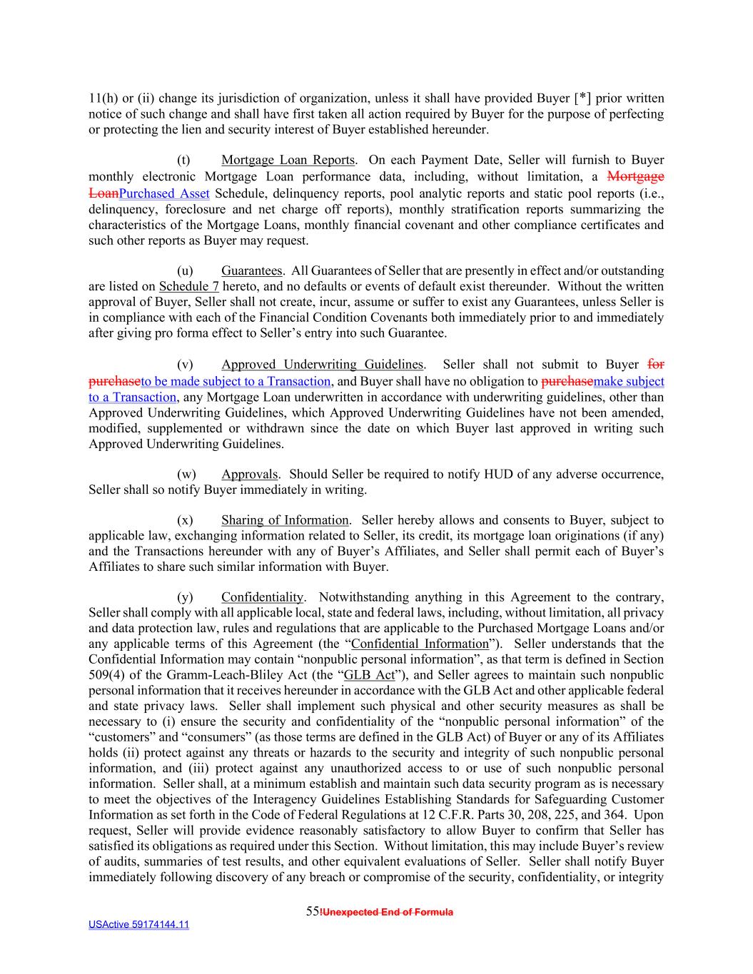 55!Unexpected End of Formula USActive 59174144.11 11(h) or (ii) change its jurisdiction of organization, unless it shall have provided Buyer [*] prior written notice of such change and shall have first taken all action required by Buyer for the purpose of perfecting or protecting the lien and security interest of Buyer established hereunder. (t) Mortgage Loan Reports. On each Payment Date, Seller will furnish to Buyer monthly electronic Mortgage Loan performance data, including, without limitation, a Mortgage LoanPurchased Asset Schedule, delinquency reports, pool analytic reports and static pool reports (i.e., delinquency, foreclosure and net charge off reports), monthly stratification reports summarizing the characteristics of the Mortgage Loans, monthly financial covenant and other compliance certificates and such other reports as Buyer may request. (u) Guarantees. All Guarantees of Seller that are presently in effect and/or outstanding are listed on Schedule 7 hereto, and no defaults or events of default exist thereunder. Without the written approval of Buyer, Seller shall not create, incur, assume or suffer to exist any Guarantees, unless Seller is in compliance with each of the Financial Condition Covenants both immediately prior to and immediately after giving pro forma effect to Seller’s entry into such Guarantee. (v) Approved Underwriting Guidelines. Seller shall not submit to Buyer for purchaseto be made subject to a Transaction, and Buyer shall have no obligation to purchasemake subject to a Transaction, any Mortgage Loan underwritten in accordance with underwriting guidelines, other than Approved Underwriting Guidelines, which Approved Underwriting Guidelines have not been amended, modified, supplemented or withdrawn since the date on which Buyer last approved in writing such Approved Underwriting Guidelines. (w) Approvals. Should Seller be required to notify HUD of any adverse occurrence, Seller shall so notify Buyer immediately in writing. (x) Sharing of Information. Seller hereby allows and consents to Buyer, subject to applicable law, exchanging information related to Seller, its credit, its mortgage loan originations (if any) and the Transactions hereunder with any of Buyer’s Affiliates, and Seller shall permit each of Buyer’s Affiliates to share such similar information with Buyer. (y) Confidentiality. Notwithstanding anything in this Agreement to the contrary, Seller shall comply with all applicable local, state and federal laws, including, without limitation, all privacy and data protection law, rules and regulations that are applicable to the Purchased Mortgage Loans and/or any applicable terms of this Agreement (the “Confidential Information”). Seller understands that the Confidential Information may contain “nonpublic personal information”, as that term is defined in Section 509(4) of the Gramm-Leach-Bliley Act (the “GLB Act”), and Seller agrees to maintain such nonpublic personal information that it receives hereunder in accordance with the GLB Act and other applicable federal and state privacy laws. Seller shall implement such physical and other security measures as shall be necessary to (i) ensure the security and confidentiality of the “nonpublic personal information” of the “customers” and “consumers” (as those terms are defined in the GLB Act) of Buyer or any of its Affiliates holds (ii) protect against any threats or hazards to the security and integrity of such nonpublic personal information, and (iii) protect against any unauthorized access to or use of such nonpublic personal information. Seller shall, at a minimum establish and maintain such data security program as is necessary to meet the objectives of the Interagency Guidelines Establishing Standards for Safeguarding Customer Information as set forth in the Code of Federal Regulations at 12 C.F.R. Parts 30, 208, 225, and 364. Upon request, Seller will provide evidence reasonably satisfactory to allow Buyer to confirm that Seller has satisfied its obligations as required under this Section. Without limitation, this may include Buyer’s review of audits, summaries of test results, and other equivalent evaluations of Seller. Seller shall notify Buyer immediately following discovery of any breach or compromise of the security, confidentiality, or integrity