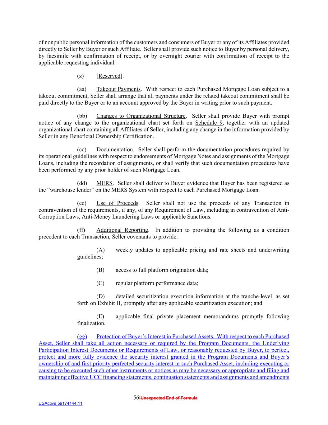 56!Unexpected End of Formula USActive 59174144.11 of nonpublic personal information of the customers and consumers of Buyer or any of its Affiliates provided directly to Seller by Buyer or such Affiliate. Seller shall provide such notice to Buyer by personal delivery, by facsimile with confirmation of receipt, or by overnight courier with confirmation of receipt to the applicable requesting individual. (z) [Reserved]. (aa) Takeout Payments. With respect to each Purchased Mortgage Loan subject to a takeout commitment, Seller shall arrange that all payments under the related takeout commitment shall be paid directly to the Buyer or to an account approved by the Buyer in writing prior to such payment. (bb) Changes to Organizational Structure. Seller shall provide Buyer with prompt notice of any change to the organizational chart set forth on Schedule 9, together with an updated organizational chart containing all Affiliates of Seller, including any change in the information provided by Seller in any Beneficial Ownership Certification. (cc) Documentation. Seller shall perform the documentation procedures required by its operational guidelines with respect to endorsements of Mortgage Notes and assignments of the Mortgage Loans, including the recordation of assignments, or shall verify that such documentation procedures have been performed by any prior holder of such Mortgage Loan. (dd) MERS. Seller shall deliver to Buyer evidence that Buyer has been registered as the “warehouse lender” on the MERS System with respect to each Purchased Mortgage Loan. (ee) Use of Proceeds. Seller shall not use the proceeds of any Transaction in contravention of the requirements, if any, of any Requirement of Law, including in contravention of Anti- Corruption Laws, Anti-Money Laundering Laws or applicable Sanctions. (ff) Additional Reporting. In addition to providing the following as a condition precedent to each Transaction, Seller covenants to provide: (A) weekly updates to applicable pricing and rate sheets and underwriting guidelines; (B) access to full platform origination data; (C) regular platform performance data; (D) detailed securitization execution information at the tranche-level, as set forth on Exhibit H, promptly after any applicable securitization execution; and (E) applicable final private placement memorandums promptly following finalization. (gg) Protection of Buyer’s Interest in Purchased Assets. With respect to each Purchased Asset, Seller shall take all action necessary or required by the Program Documents, the Underlying Participation Interest Documents or Requirements of Law, or reasonably requested by Buyer, to perfect, protect and more fully evidence the security interest granted in the Program Documents and Buyer’s ownership of and first priority perfected security interest in such Purchased Asset, including executing or causing to be executed such other instruments or notices as may be necessary or appropriate and filing and maintaining effective UCC financing statements, continuation statements and assignments and amendments