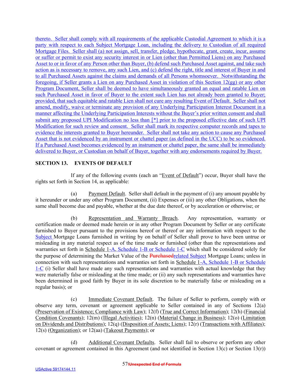 57!Unexpected End of Formula USActive 59174144.11 thereto. Seller shall comply with all requirements of the applicable Custodial Agreement to which it is a party with respect to each Subject Mortgage Loan, including the delivery to Custodian of all required Mortgage Files. Seller shall (a) not assign, sell, transfer, pledge, hypothecate, grant, create, incur, assume or suffer or permit to exist any security interest in or Lien (other than Permitted Liens) on any Purchased Asset to or in favor of any Person other than Buyer, (b) defend such Purchased Asset against, and take such action as is necessary to remove, any such Lien, and (c) defend the right, title and interest of Buyer in and to all Purchased Assets against the claims and demands of all Persons whomsoever. Notwithstanding the foregoing, if Seller grants a Lien on any Purchased Asset in violation of this Section 12(gg) or any other Program Document, Seller shall be deemed to have simultaneously granted an equal and ratable Lien on such Purchased Asset in favor of Buyer to the extent such Lien has not already been granted to Buyer; provided, that such equitable and ratable Lien shall not cure any resulting Event of Default. Seller shall not amend, modify, waive or terminate any provision of any Underlying Participation Interest Document in a manner affecting the Underlying Participation Interests without the Buyer’s prior written consent and shall submit any proposed UPI Modification no less than [*] prior to the proposed effective date of such UPI Modification for such review and consent. Seller shall mark its respective computer records and tapes to evidence the interests granted to Buyer hereunder. Seller shall not take any action to cause any Purchased Asset that is not evidenced by an instrument or chattel paper (as defined in the UCC) to be so evidenced. If a Purchased Asset becomes evidenced by an instrument or chattel paper, the same shall be immediately delivered to Buyer, or Custodian on behalf of Buyer, together with any endorsements required by Buyer. SECTION 13. EVENTS OF DEFAULT If any of the following events (each an “Event of Default”) occur, Buyer shall have the rights set forth in Section 14, as applicable: (a) Payment Default. Seller shall default in the payment of (i) any amount payable by it hereunder or under any other Program Document, (ii) Expenses or (iii) any other Obligations, when the same shall become due and payable, whether at the due date thereof, or by acceleration or otherwise; or (b) Representation and Warranty Breach. Any representation, warranty or certification made or deemed made herein or in any other Program Document by Seller or any certificate furnished to Buyer pursuant to the provisions hereof or thereof or any information with respect to the Subject Mortgage Loans furnished in writing by on behalf of Seller shall prove to have been untrue or misleading in any material respect as of the time made or furnished (other than the representations and warranties set forth in Schedule 1-A, Schedule 1-B or Schedule 1-C which shall be considered solely for the purpose of determining the Market Value of the Purchasedrelated Subject Mortgage Loans; unless in connection with such representations and warranties set forth in Schedule 1-A, Schedule 1-B or Schedule 1-C (i) Seller shall have made any such representations and warranties with actual knowledge that they were materially false or misleading at the time made; or (ii) any such representations and warranties have been determined in good faith by Buyer in its sole discretion to be materially false or misleading on a regular basis); or (c) Immediate Covenant Default. The failure of Seller to perform, comply with or observe any term, covenant or agreement applicable to Seller contained in any of Sections 12(a) (Preservation of Existence; Compliance with Law); 12(f) (True and Correct Information); 12(h) (Financial Condition Covenants); 12(m) (Illegal Activities); 12(n) (Material Change in Business); 12(o) (Limitation on Dividends and Distributions); 12(q) (Disposition of Assets; Liens); 12(r) (Transactions with Affiliates); 12(s) (Organization); or 12(aa) (Takeout Payments); or (d) Additional Covenant Defaults. Seller shall fail to observe or perform any other covenant or agreement contained in this Agreement (and not identified in Section 13(c) or Section 13(r))