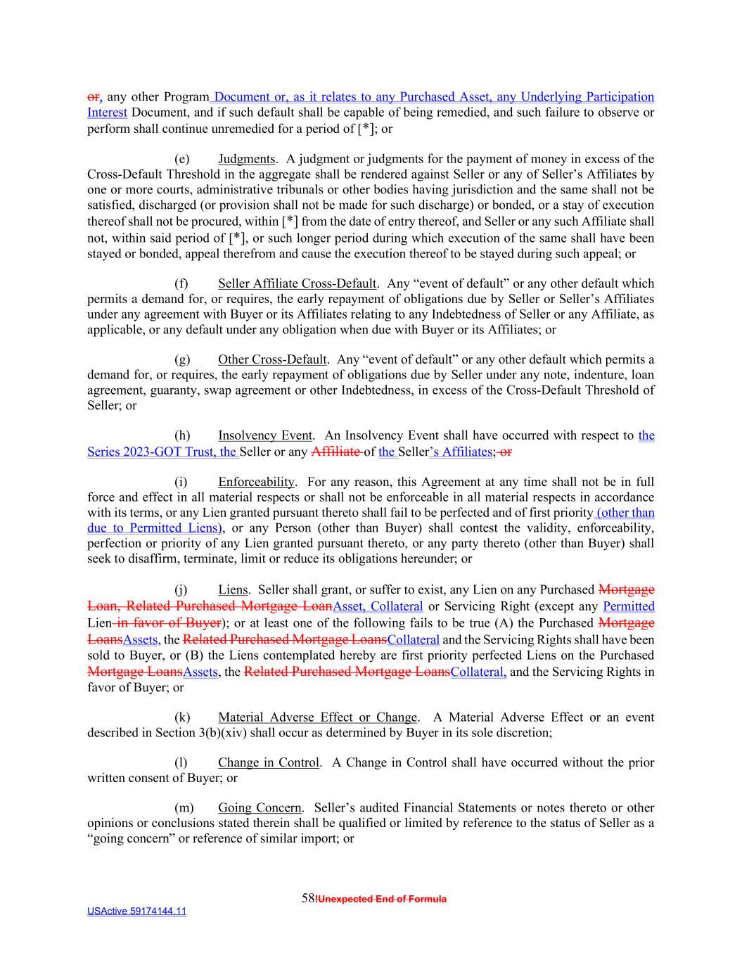 58!Unexpected End of Formula USActive 59174144.11 or, any other Program Document or, as it relates to any Purchased Asset, any Underlying Participation Interest Document, and if such default shall be capable of being remedied, and such failure to observe or perform shall continue unremedied for a period of [*]; or (e) Judgments. A judgment or judgments for the payment of money in excess of the Cross-Default Threshold in the aggregate shall be rendered against Seller or any of Seller’s Affiliates by one or more courts, administrative tribunals or other bodies having jurisdiction and the same shall not be satisfied, discharged (or provision shall not be made for such discharge) or bonded, or a stay of execution thereof shall not be procured, within [*] from the date of entry thereof, and Seller or any such Affiliate shall not, within said period of [*], or such longer period during which execution of the same shall have been stayed or bonded, appeal therefrom and cause the execution thereof to be stayed during such appeal; or (f) Seller Affiliate Cross-Default. Any “event of default” or any other default which permits a demand for, or requires, the early repayment of obligations due by Seller or Seller’s Affiliates under any agreement with Buyer or its Affiliates relating to any Indebtedness of Seller or any Affiliate, as applicable, or any default under any obligation when due with Buyer or its Affiliates; or (g) Other Cross-Default. Any “event of default” or any other default which permits a demand for, or requires, the early repayment of obligations due by Seller under any note, indenture, loan agreement, guaranty, swap agreement or other Indebtedness, in excess of the Cross-Default Threshold of Seller; or (h) Insolvency Event. An Insolvency Event shall have occurred with respect to the Series 2023-GOT Trust, the Seller or any Affiliate of the Seller’s Affiliates; or (i) Enforceability. For any reason, this Agreement at any time shall not be in full force and effect in all material respects or shall not be enforceable in all material respects in accordance with its terms, or any Lien granted pursuant thereto shall fail to be perfected and of first priority (other than due to Permitted Liens), or any Person (other than Buyer) shall contest the validity, enforceability, perfection or priority of any Lien granted pursuant thereto, or any party thereto (other than Buyer) shall seek to disaffirm, terminate, limit or reduce its obligations hereunder; or (j) Liens. Seller shall grant, or suffer to exist, any Lien on any Purchased Mortgage Loan, Related Purchased Mortgage LoanAsset, Collateral or Servicing Right (except any Permitted Lien in favor of Buyer); or at least one of the following fails to be true (A) the Purchased Mortgage LoansAssets, the Related Purchased Mortgage LoansCollateral and the Servicing Rights shall have been sold to Buyer, or (B) the Liens contemplated hereby are first priority perfected Liens on the Purchased Mortgage LoansAssets, the Related Purchased Mortgage LoansCollateral, and the Servicing Rights in favor of Buyer; or (k) Material Adverse Effect or Change. A Material Adverse Effect or an event described in Section 3(b)(xiv) shall occur as determined by Buyer in its sole discretion; (l) Change in Control. A Change in Control shall have occurred without the prior written consent of Buyer; or (m) Going Concern. Seller’s audited Financial Statements or notes thereto or other opinions or conclusions stated therein shall be qualified or limited by reference to the status of Seller as a “going concern” or reference of similar import; or