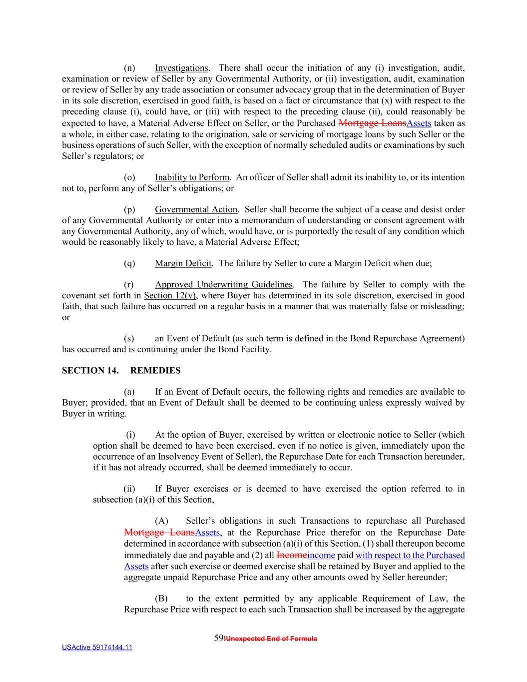 59!Unexpected End of Formula USActive 59174144.11 (n) Investigations. There shall occur the initiation of any (i) investigation, audit, examination or review of Seller by any Governmental Authority, or (ii) investigation, audit, examination or review of Seller by any trade association or consumer advocacy group that in the determination of Buyer in its sole discretion, exercised in good faith, is based on a fact or circumstance that (x) with respect to the preceding clause (i), could have, or (iii) with respect to the preceding clause (ii), could reasonably be expected to have, a Material Adverse Effect on Seller, or the Purchased Mortgage LoansAssets taken as a whole, in either case, relating to the origination, sale or servicing of mortgage loans by such Seller or the business operations of such Seller, with the exception of normally scheduled audits or examinations by such Seller’s regulators; or (o) Inability to Perform. An officer of Seller shall admit its inability to, or its intention not to, perform any of Seller’s obligations; or (p) Governmental Action. Seller shall become the subject of a cease and desist order of any Governmental Authority or enter into a memorandum of understanding or consent agreement with any Governmental Authority, any of which, would have, or is purportedly the result of any condition which would be reasonably likely to have, a Material Adverse Effect; (q) Margin Deficit. The failure by Seller to cure a Margin Deficit when due; (r) Approved Underwriting Guidelines. The failure by Seller to comply with the covenant set forth in Section 12(v), where Buyer has determined in its sole discretion, exercised in good faith, that such failure has occurred on a regular basis in a manner that was materially false or misleading; or (s) an Event of Default (as such term is defined in the Bond Repurchase Agreement) has occurred and is continuing under the Bond Facility. SECTION 14. REMEDIES (a) If an Event of Default occurs, the following rights and remedies are available to Buyer; provided, that an Event of Default shall be deemed to be continuing unless expressly waived by Buyer in writing. (i) At the option of Buyer, exercised by written or electronic notice to Seller (which option shall be deemed to have been exercised, even if no notice is given, immediately upon the occurrence of an Insolvency Event of Seller), the Repurchase Date for each Transaction hereunder, if it has not already occurred, shall be deemed immediately to occur. (ii) If Buyer exercises or is deemed to have exercised the option referred to in subsection (a)(i) of this Section, (A) Seller’s obligations in such Transactions to repurchase all Purchased Mortgage LoansAssets, at the Repurchase Price therefor on the Repurchase Date determined in accordance with subsection (a)(i) of this Section, (1) shall thereupon become immediately due and payable and (2) all Incomeincome paid with respect to the Purchased Assets after such exercise or deemed exercise shall be retained by Buyer and applied to the aggregate unpaid Repurchase Price and any other amounts owed by Seller hereunder; (B) to the extent permitted by any applicable Requirement of Law, the Repurchase Price with respect to each such Transaction shall be increased by the aggregate
