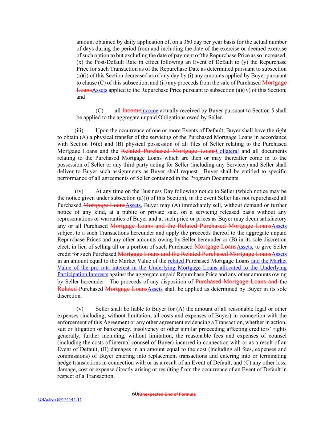 60!Unexpected End of Formula USActive 59174144.11 amount obtained by daily application of, on a 360 day per year basis for the actual number of days during the period from and including the date of the exercise or deemed exercise of such option to but excluding the date of payment of the Repurchase Price as so increased, (x) the Post-Default Rate in effect following an Event of Default to (y) the Repurchase Price for such Transaction as of the Repurchase Date as determined pursuant to subsection (a)(i) of this Section decreased as of any day by (i) any amounts applied by Buyer pursuant to clause (C) of this subsection, and (ii) any proceeds from the sale of Purchased Mortgage LoansAssets applied to the Repurchase Price pursuant to subsection (a)(iv) of this Section; and (C) all Incomeincome actually received by Buyer pursuant to Section 5 shall be applied to the aggregate unpaid Obligations owed by Seller. (iii) Upon the occurrence of one or more Events of Default, Buyer shall have the right to obtain (A) a physical transfer of the servicing of the Purchased Mortgage Loans in accordance with Section 16(c) and (B) physical possession of all files of Seller relating to the Purchased Mortgage Loans and the Related Purchased Mortgage LoansCollateral and all documents relating to the Purchased Mortgage Loans which are then or may thereafter come in to the possession of Seller or any third party acting for Seller (including any Servicer) and Seller shall deliver to Buyer such assignments as Buyer shall request. Buyer shall be entitled to specific performance of all agreements of Seller contained in the Program Documents. (iv) At any time on the Business Day following notice to Seller (which notice may be the notice given under subsection (a)(i) of this Section), in the event Seller has not repurchased all Purchased Mortgage LoansAssets, Buyer may (A) immediately sell, without demand or further notice of any kind, at a public or private sale, on a servicing released basis without any representations or warranties of Buyer and at such price or prices as Buyer may deem satisfactory any or all Purchased Mortgage Loans and the Related Purchased Mortgage LoansAssets subject to a such Transactions hereunder and apply the proceeds thereof to the aggregate unpaid Repurchase Prices and any other amounts owing by Seller hereunder or (B) in its sole discretion elect, in lieu of selling all or a portion of such Purchased Mortgage LoansAssets, to give Seller credit for such Purchased Mortgage Loans and the Related Purchased Mortgage LoansAssets in an amount equal to the Market Value of the related Purchased Mortgage Loans and the Market Value of the pro rata interest in the Underlying Mortgage Loans allocated to the Underlying Participation Interests against the aggregate unpaid Repurchase Price and any other amounts owing by Seller hereunder. The proceeds of any disposition of Purchased Mortgage Loans and the Related Purchased Mortgage LoansAssets shall be applied as determined by Buyer in its sole discretion. (v) Seller shall be liable to Buyer for (A) the amount of all reasonable legal or other expenses (including, without limitation, all costs and expenses of Buyer) in connection with the enforcement of this Agreement or any other agreement evidencing a Transaction, whether in action, suit or litigation or bankruptcy, insolvency or other similar proceeding affecting creditors’ rights generally, further including, without limitation, the reasonable fees and expenses of counsel (including the costs of internal counsel of Buyer) incurred in connection with or as a result of an Event of Default, (B) damages in an amount equal to the cost (including all fees, expenses and commissions) of Buyer entering into replacement transactions and entering into or terminating hedge transactions in connection with or as a result of an Event of Default, and (C) any other loss, damage, cost or expense directly arising or resulting from the occurrence of an Event of Default in respect of a Transaction.