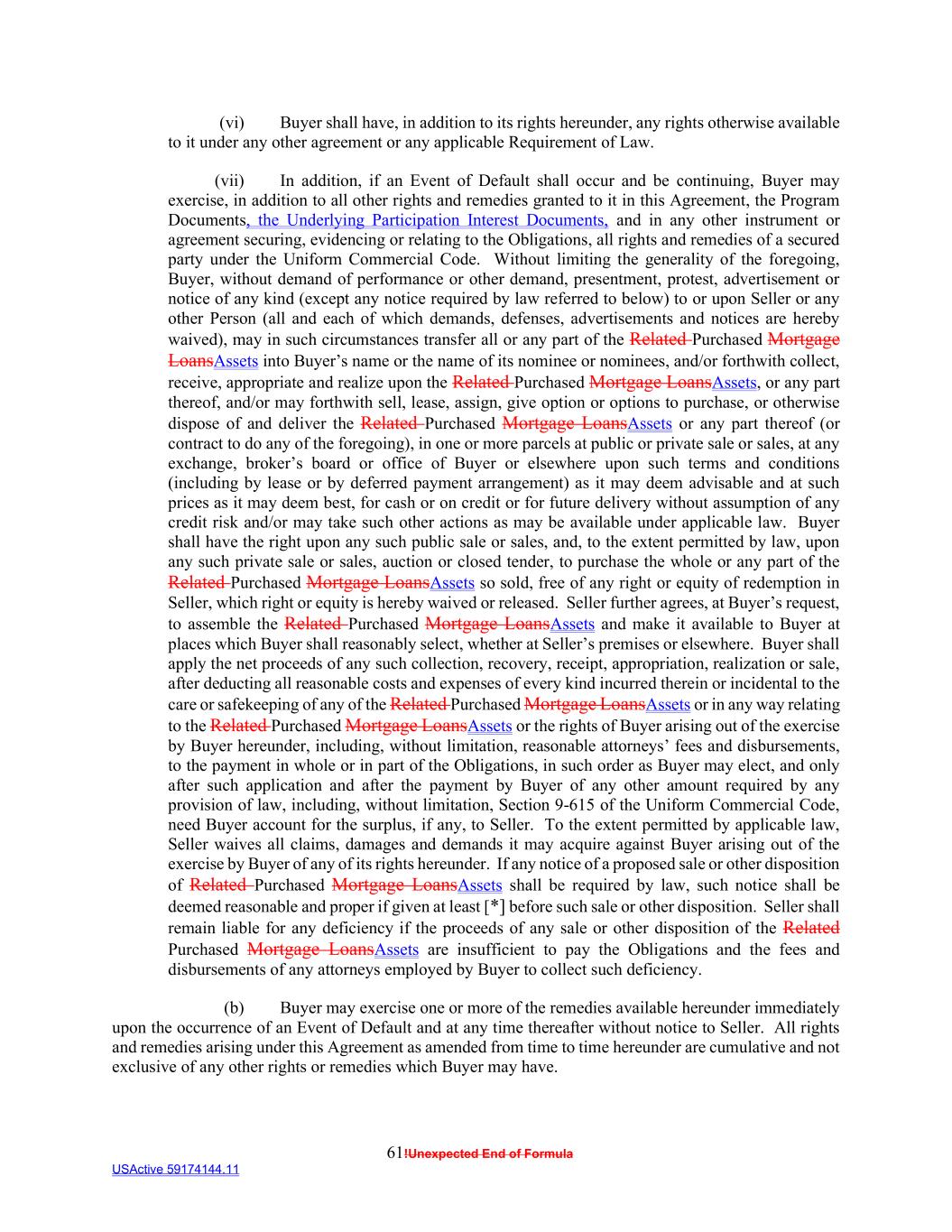 61!Unexpected End of Formula USActive 59174144.11 (vi) Buyer shall have, in addition to its rights hereunder, any rights otherwise available to it under any other agreement or any applicable Requirement of Law. (vii) In addition, if an Event of Default shall occur and be continuing, Buyer may exercise, in addition to all other rights and remedies granted to it in this Agreement, the Program Documents, the Underlying Participation Interest Documents, and in any other instrument or agreement securing, evidencing or relating to the Obligations, all rights and remedies of a secured party under the Uniform Commercial Code. Without limiting the generality of the foregoing, Buyer, without demand of performance or other demand, presentment, protest, advertisement or notice of any kind (except any notice required by law referred to below) to or upon Seller or any other Person (all and each of which demands, defenses, advertisements and notices are hereby waived), may in such circumstances transfer all or any part of the Related Purchased Mortgage LoansAssets into Buyer’s name or the name of its nominee or nominees, and/or forthwith collect, receive, appropriate and realize upon the Related Purchased Mortgage LoansAssets, or any part thereof, and/or may forthwith sell, lease, assign, give option or options to purchase, or otherwise dispose of and deliver the Related Purchased Mortgage LoansAssets or any part thereof (or contract to do any of the foregoing), in one or more parcels at public or private sale or sales, at any exchange, broker’s board or office of Buyer or elsewhere upon such terms and conditions (including by lease or by deferred payment arrangement) as it may deem advisable and at such prices as it may deem best, for cash or on credit or for future delivery without assumption of any credit risk and/or may take such other actions as may be available under applicable law. Buyer shall have the right upon any such public sale or sales, and, to the extent permitted by law, upon any such private sale or sales, auction or closed tender, to purchase the whole or any part of the Related Purchased Mortgage LoansAssets so sold, free of any right or equity of redemption in Seller, which right or equity is hereby waived or released. Seller further agrees, at Buyer’s request, to assemble the Related Purchased Mortgage LoansAssets and make it available to Buyer at places which Buyer shall reasonably select, whether at Seller’s premises or elsewhere. Buyer shall apply the net proceeds of any such collection, recovery, receipt, appropriation, realization or sale, after deducting all reasonable costs and expenses of every kind incurred therein or incidental to the care or safekeeping of any of the Related Purchased Mortgage LoansAssets or in any way relating to the Related Purchased Mortgage LoansAssets or the rights of Buyer arising out of the exercise by Buyer hereunder, including, without limitation, reasonable attorneys’ fees and disbursements, to the payment in whole or in part of the Obligations, in such order as Buyer may elect, and only after such application and after the payment by Buyer of any other amount required by any provision of law, including, without limitation, Section 9-615 of the Uniform Commercial Code, need Buyer account for the surplus, if any, to Seller. To the extent permitted by applicable law, Seller waives all claims, damages and demands it may acquire against Buyer arising out of the exercise by Buyer of any of its rights hereunder. If any notice of a proposed sale or other disposition of Related Purchased Mortgage LoansAssets shall be required by law, such notice shall be deemed reasonable and proper if given at least [*] before such sale or other disposition. Seller shall remain liable for any deficiency if the proceeds of any sale or other disposition of the Related Purchased Mortgage LoansAssets are insufficient to pay the Obligations and the fees and disbursements of any attorneys employed by Buyer to collect such deficiency. (b) Buyer may exercise one or more of the remedies available hereunder immediately upon the occurrence of an Event of Default and at any time thereafter without notice to Seller. All rights and remedies arising under this Agreement as amended from time to time hereunder are cumulative and not exclusive of any other rights or remedies which Buyer may have.