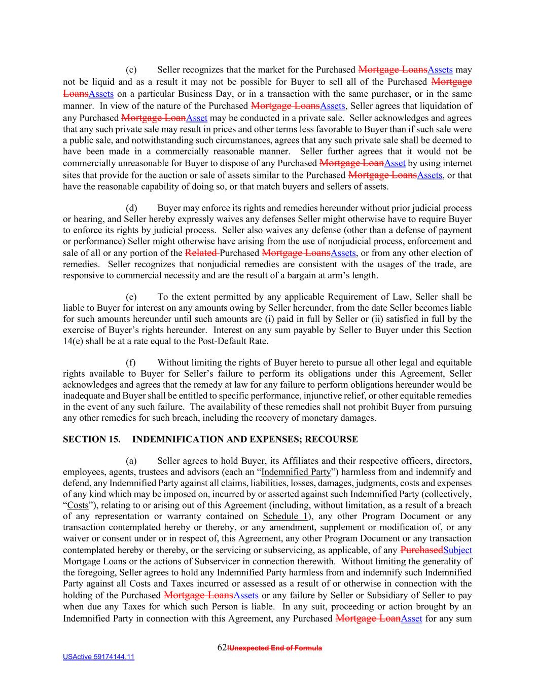 62!Unexpected End of Formula USActive 59174144.11 (c) Seller recognizes that the market for the Purchased Mortgage LoansAssets may not be liquid and as a result it may not be possible for Buyer to sell all of the Purchased Mortgage LoansAssets on a particular Business Day, or in a transaction with the same purchaser, or in the same manner. In view of the nature of the Purchased Mortgage LoansAssets, Seller agrees that liquidation of any Purchased Mortgage LoanAsset may be conducted in a private sale. Seller acknowledges and agrees that any such private sale may result in prices and other terms less favorable to Buyer than if such sale were a public sale, and notwithstanding such circumstances, agrees that any such private sale shall be deemed to have been made in a commercially reasonable manner. Seller further agrees that it would not be commercially unreasonable for Buyer to dispose of any Purchased Mortgage LoanAsset by using internet sites that provide for the auction or sale of assets similar to the Purchased Mortgage LoansAssets, or that have the reasonable capability of doing so, or that match buyers and sellers of assets. (d) Buyer may enforce its rights and remedies hereunder without prior judicial process or hearing, and Seller hereby expressly waives any defenses Seller might otherwise have to require Buyer to enforce its rights by judicial process. Seller also waives any defense (other than a defense of payment or performance) Seller might otherwise have arising from the use of nonjudicial process, enforcement and sale of all or any portion of the Related Purchased Mortgage LoansAssets, or from any other election of remedies. Seller recognizes that nonjudicial remedies are consistent with the usages of the trade, are responsive to commercial necessity and are the result of a bargain at arm’s length. (e) To the extent permitted by any applicable Requirement of Law, Seller shall be liable to Buyer for interest on any amounts owing by Seller hereunder, from the date Seller becomes liable for such amounts hereunder until such amounts are (i) paid in full by Seller or (ii) satisfied in full by the exercise of Buyer’s rights hereunder. Interest on any sum payable by Seller to Buyer under this Section 14(e) shall be at a rate equal to the Post-Default Rate. (f) Without limiting the rights of Buyer hereto to pursue all other legal and equitable rights available to Buyer for Seller’s failure to perform its obligations under this Agreement, Seller acknowledges and agrees that the remedy at law for any failure to perform obligations hereunder would be inadequate and Buyer shall be entitled to specific performance, injunctive relief, or other equitable remedies in the event of any such failure. The availability of these remedies shall not prohibit Buyer from pursuing any other remedies for such breach, including the recovery of monetary damages. SECTION 15. INDEMNIFICATION AND EXPENSES; RECOURSE (a) Seller agrees to hold Buyer, its Affiliates and their respective officers, directors, employees, agents, trustees and advisors (each an “Indemnified Party”) harmless from and indemnify and defend, any Indemnified Party against all claims, liabilities, losses, damages, judgments, costs and expenses of any kind which may be imposed on, incurred by or asserted against such Indemnified Party (collectively, “Costs”), relating to or arising out of this Agreement (including, without limitation, as a result of a breach of any representation or warranty contained on Schedule 1), any other Program Document or any transaction contemplated hereby or thereby, or any amendment, supplement or modification of, or any waiver or consent under or in respect of, this Agreement, any other Program Document or any transaction contemplated hereby or thereby, or the servicing or subservicing, as applicable, of any PurchasedSubject Mortgage Loans or the actions of Subservicer in connection therewith. Without limiting the generality of the foregoing, Seller agrees to hold any Indemnified Party harmless from and indemnify such Indemnified Party against all Costs and Taxes incurred or assessed as a result of or otherwise in connection with the holding of the Purchased Mortgage LoansAssets or any failure by Seller or Subsidiary of Seller to pay when due any Taxes for which such Person is liable. In any suit, proceeding or action brought by an Indemnified Party in connection with this Agreement, any Purchased Mortgage LoanAsset for any sum