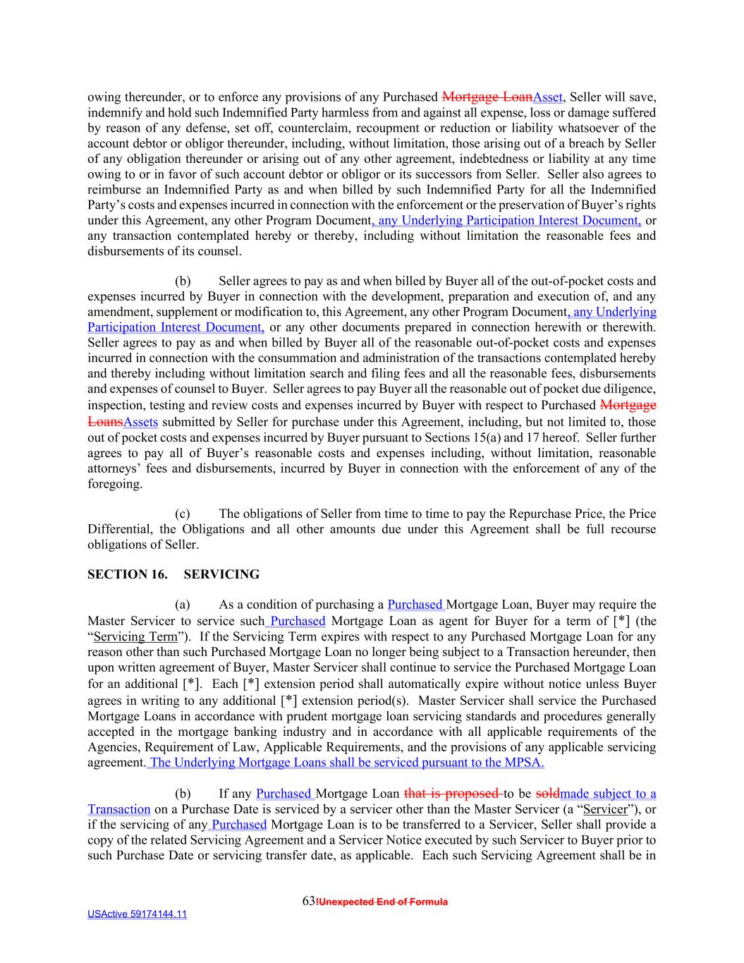 63!Unexpected End of Formula USActive 59174144.11 owing thereunder, or to enforce any provisions of any Purchased Mortgage LoanAsset, Seller will save, indemnify and hold such Indemnified Party harmless from and against all expense, loss or damage suffered by reason of any defense, set off, counterclaim, recoupment or reduction or liability whatsoever of the account debtor or obligor thereunder, including, without limitation, those arising out of a breach by Seller of any obligation thereunder or arising out of any other agreement, indebtedness or liability at any time owing to or in favor of such account debtor or obligor or its successors from Seller. Seller also agrees to reimburse an Indemnified Party as and when billed by such Indemnified Party for all the Indemnified Party’s costs and expenses incurred in connection with the enforcement or the preservation of Buyer’s rights under this Agreement, any other Program Document, any Underlying Participation Interest Document, or any transaction contemplated hereby or thereby, including without limitation the reasonable fees and disbursements of its counsel. (b) Seller agrees to pay as and when billed by Buyer all of the out-of-pocket costs and expenses incurred by Buyer in connection with the development, preparation and execution of, and any amendment, supplement or modification to, this Agreement, any other Program Document, any Underlying Participation Interest Document, or any other documents prepared in connection herewith or therewith. Seller agrees to pay as and when billed by Buyer all of the reasonable out-of-pocket costs and expenses incurred in connection with the consummation and administration of the transactions contemplated hereby and thereby including without limitation search and filing fees and all the reasonable fees, disbursements and expenses of counsel to Buyer. Seller agrees to pay Buyer all the reasonable out of pocket due diligence, inspection, testing and review costs and expenses incurred by Buyer with respect to Purchased Mortgage LoansAssets submitted by Seller for purchase under this Agreement, including, but not limited to, those out of pocket costs and expenses incurred by Buyer pursuant to Sections 15(a) and 17 hereof. Seller further agrees to pay all of Buyer’s reasonable costs and expenses including, without limitation, reasonable attorneys’ fees and disbursements, incurred by Buyer in connection with the enforcement of any of the foregoing. (c) The obligations of Seller from time to time to pay the Repurchase Price, the Price Differential, the Obligations and all other amounts due under this Agreement shall be full recourse obligations of Seller. SECTION 16. SERVICING (a) As a condition of purchasing a Purchased Mortgage Loan, Buyer may require the Master Servicer to service such Purchased Mortgage Loan as agent for Buyer for a term of [*] (the “Servicing Term”). If the Servicing Term expires with respect to any Purchased Mortgage Loan for any reason other than such Purchased Mortgage Loan no longer being subject to a Transaction hereunder, then upon written agreement of Buyer, Master Servicer shall continue to service the Purchased Mortgage Loan for an additional [*]. Each [*] extension period shall automatically expire without notice unless Buyer agrees in writing to any additional [*] extension period(s). Master Servicer shall service the Purchased Mortgage Loans in accordance with prudent mortgage loan servicing standards and procedures generally accepted in the mortgage banking industry and in accordance with all applicable requirements of the Agencies, Requirement of Law, Applicable Requirements, and the provisions of any applicable servicing agreement. The Underlying Mortgage Loans shall be serviced pursuant to the MPSA. (b) If any Purchased Mortgage Loan that is proposed to be soldmade subject to a Transaction on a Purchase Date is serviced by a servicer other than the Master Servicer (a “Servicer”), or if the servicing of any Purchased Mortgage Loan is to be transferred to a Servicer, Seller shall provide a copy of the related Servicing Agreement and a Servicer Notice executed by such Servicer to Buyer prior to such Purchase Date or servicing transfer date, as applicable. Each such Servicing Agreement shall be in