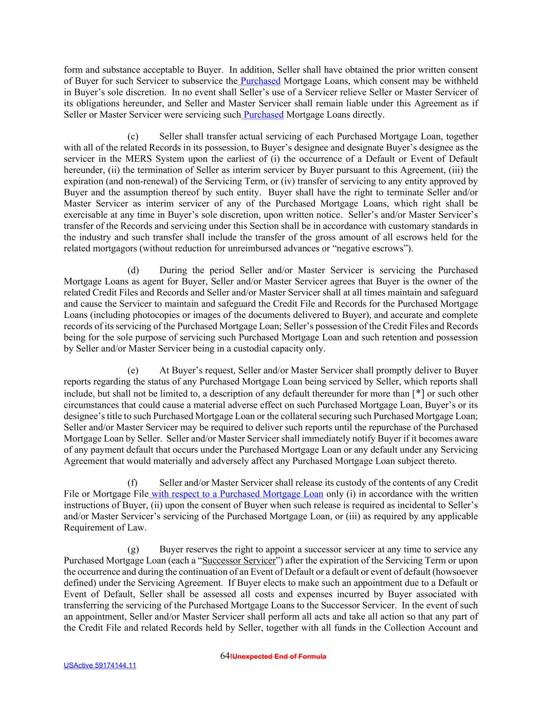 64!Unexpected End of Formula USActive 59174144.11 form and substance acceptable to Buyer. In addition, Seller shall have obtained the prior written consent of Buyer for such Servicer to subservice the Purchased Mortgage Loans, which consent may be withheld in Buyer’s sole discretion. In no event shall Seller’s use of a Servicer relieve Seller or Master Servicer of its obligations hereunder, and Seller and Master Servicer shall remain liable under this Agreement as if Seller or Master Servicer were servicing such Purchased Mortgage Loans directly. (c) Seller shall transfer actual servicing of each Purchased Mortgage Loan, together with all of the related Records in its possession, to Buyer’s designee and designate Buyer’s designee as the servicer in the MERS System upon the earliest of (i) the occurrence of a Default or Event of Default hereunder, (ii) the termination of Seller as interim servicer by Buyer pursuant to this Agreement, (iii) the expiration (and non-renewal) of the Servicing Term, or (iv) transfer of servicing to any entity approved by Buyer and the assumption thereof by such entity. Buyer shall have the right to terminate Seller and/or Master Servicer as interim servicer of any of the Purchased Mortgage Loans, which right shall be exercisable at any time in Buyer’s sole discretion, upon written notice. Seller’s and/or Master Servicer’s transfer of the Records and servicing under this Section shall be in accordance with customary standards in the industry and such transfer shall include the transfer of the gross amount of all escrows held for the related mortgagors (without reduction for unreimbursed advances or “negative escrows”). (d) During the period Seller and/or Master Servicer is servicing the Purchased Mortgage Loans as agent for Buyer, Seller and/or Master Servicer agrees that Buyer is the owner of the related Credit Files and Records and Seller and/or Master Servicer shall at all times maintain and safeguard and cause the Servicer to maintain and safeguard the Credit File and Records for the Purchased Mortgage Loans (including photocopies or images of the documents delivered to Buyer), and accurate and complete records of its servicing of the Purchased Mortgage Loan; Seller’s possession of the Credit Files and Records being for the sole purpose of servicing such Purchased Mortgage Loan and such retention and possession by Seller and/or Master Servicer being in a custodial capacity only. (e) At Buyer’s request, Seller and/or Master Servicer shall promptly deliver to Buyer reports regarding the status of any Purchased Mortgage Loan being serviced by Seller, which reports shall include, but shall not be limited to, a description of any default thereunder for more than [*] or such other circumstances that could cause a material adverse effect on such Purchased Mortgage Loan, Buyer’s or its designee’s title to such Purchased Mortgage Loan or the collateral securing such Purchased Mortgage Loan; Seller and/or Master Servicer may be required to deliver such reports until the repurchase of the Purchased Mortgage Loan by Seller. Seller and/or Master Servicer shall immediately notify Buyer if it becomes aware of any payment default that occurs under the Purchased Mortgage Loan or any default under any Servicing Agreement that would materially and adversely affect any Purchased Mortgage Loan subject thereto. (f) Seller and/or Master Servicer shall release its custody of the contents of any Credit File or Mortgage File with respect to a Purchased Mortgage Loan only (i) in accordance with the written instructions of Buyer, (ii) upon the consent of Buyer when such release is required as incidental to Seller’s and/or Master Servicer’s servicing of the Purchased Mortgage Loan, or (iii) as required by any applicable Requirement of Law. (g) Buyer reserves the right to appoint a successor servicer at any time to service any Purchased Mortgage Loan (each a “Successor Servicer”) after the expiration of the Servicing Term or upon the occurrence and during the continuation of an Event of Default or a default or event of default (howsoever defined) under the Servicing Agreement. If Buyer elects to make such an appointment due to a Default or Event of Default, Seller shall be assessed all costs and expenses incurred by Buyer associated with transferring the servicing of the Purchased Mortgage Loans to the Successor Servicer. In the event of such an appointment, Seller and/or Master Servicer shall perform all acts and take all action so that any part of the Credit File and related Records held by Seller, together with all funds in the Collection Account and