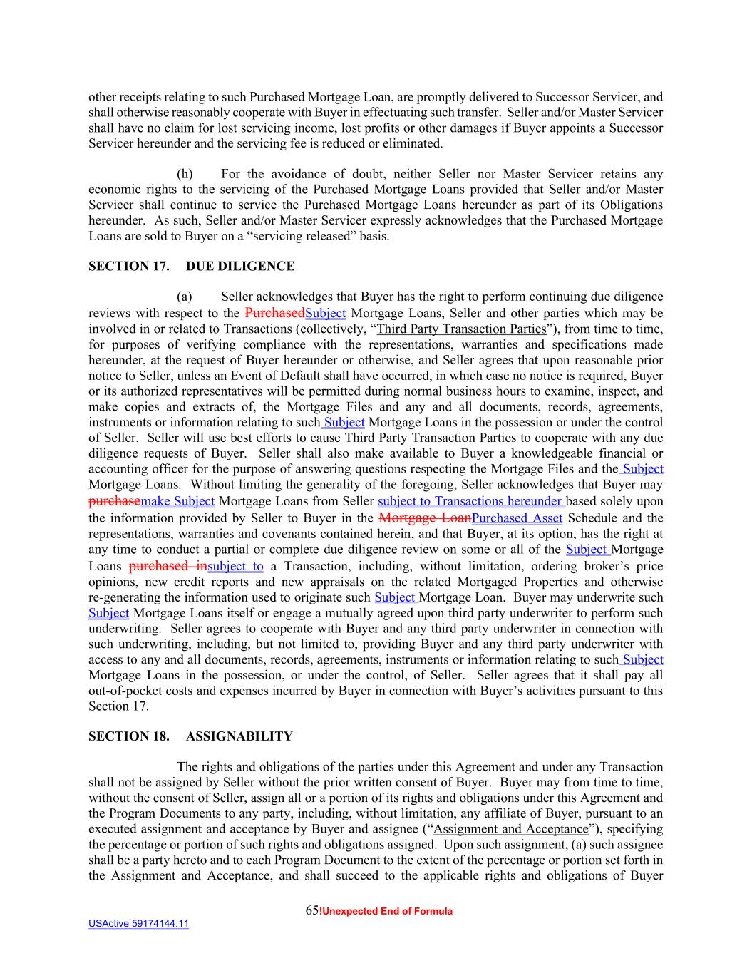 65!Unexpected End of Formula USActive 59174144.11 other receipts relating to such Purchased Mortgage Loan, are promptly delivered to Successor Servicer, and shall otherwise reasonably cooperate with Buyer in effectuating such transfer. Seller and/or Master Servicer shall have no claim for lost servicing income, lost profits or other damages if Buyer appoints a Successor Servicer hereunder and the servicing fee is reduced or eliminated. (h) For the avoidance of doubt, neither Seller nor Master Servicer retains any economic rights to the servicing of the Purchased Mortgage Loans provided that Seller and/or Master Servicer shall continue to service the Purchased Mortgage Loans hereunder as part of its Obligations hereunder. As such, Seller and/or Master Servicer expressly acknowledges that the Purchased Mortgage Loans are sold to Buyer on a “servicing released” basis. SECTION 17. DUE DILIGENCE (a) Seller acknowledges that Buyer has the right to perform continuing due diligence reviews with respect to the PurchasedSubject Mortgage Loans, Seller and other parties which may be involved in or related to Transactions (collectively, “Third Party Transaction Parties”), from time to time, for purposes of verifying compliance with the representations, warranties and specifications made hereunder, at the request of Buyer hereunder or otherwise, and Seller agrees that upon reasonable prior notice to Seller, unless an Event of Default shall have occurred, in which case no notice is required, Buyer or its authorized representatives will be permitted during normal business hours to examine, inspect, and make copies and extracts of, the Mortgage Files and any and all documents, records, agreements, instruments or information relating to such Subject Mortgage Loans in the possession or under the control of Seller. Seller will use best efforts to cause Third Party Transaction Parties to cooperate with any due diligence requests of Buyer. Seller shall also make available to Buyer a knowledgeable financial or accounting officer for the purpose of answering questions respecting the Mortgage Files and the Subject Mortgage Loans. Without limiting the generality of the foregoing, Seller acknowledges that Buyer may purchasemake Subject Mortgage Loans from Seller subject to Transactions hereunder based solely upon the information provided by Seller to Buyer in the Mortgage LoanPurchased Asset Schedule and the representations, warranties and covenants contained herein, and that Buyer, at its option, has the right at any time to conduct a partial or complete due diligence review on some or all of the Subject Mortgage Loans purchased insubject to a Transaction, including, without limitation, ordering broker’s price opinions, new credit reports and new appraisals on the related Mortgaged Properties and otherwise re-generating the information used to originate such Subject Mortgage Loan. Buyer may underwrite such Subject Mortgage Loans itself or engage a mutually agreed upon third party underwriter to perform such underwriting. Seller agrees to cooperate with Buyer and any third party underwriter in connection with such underwriting, including, but not limited to, providing Buyer and any third party underwriter with access to any and all documents, records, agreements, instruments or information relating to such Subject Mortgage Loans in the possession, or under the control, of Seller. Seller agrees that it shall pay all out-of-pocket costs and expenses incurred by Buyer in connection with Buyer’s activities pursuant to this Section 17. SECTION 18. ASSIGNABILITY The rights and obligations of the parties under this Agreement and under any Transaction shall not be assigned by Seller without the prior written consent of Buyer. Buyer may from time to time, without the consent of Seller, assign all or a portion of its rights and obligations under this Agreement and the Program Documents to any party, including, without limitation, any affiliate of Buyer, pursuant to an executed assignment and acceptance by Buyer and assignee (“Assignment and Acceptance”), specifying the percentage or portion of such rights and obligations assigned. Upon such assignment, (a) such assignee shall be a party hereto and to each Program Document to the extent of the percentage or portion set forth in the Assignment and Acceptance, and shall succeed to the applicable rights and obligations of Buyer