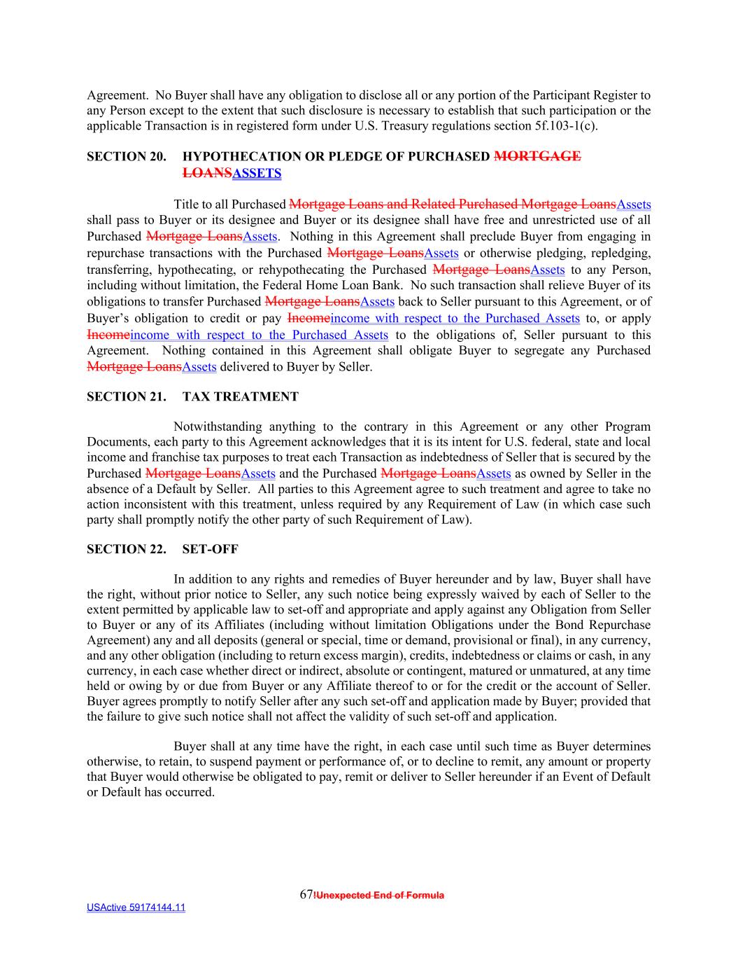 67!Unexpected End of Formula USActive 59174144.11 Agreement. No Buyer shall have any obligation to disclose all or any portion of the Participant Register to any Person except to the extent that such disclosure is necessary to establish that such participation or the applicable Transaction is in registered form under U.S. Treasury regulations section 5f.103-1(c). SECTION 20. HYPOTHECATION OR PLEDGE OF PURCHASED MORTGAGE LOANSASSETS Title to all Purchased Mortgage Loans and Related Purchased Mortgage LoansAssets shall pass to Buyer or its designee and Buyer or its designee shall have free and unrestricted use of all Purchased Mortgage LoansAssets. Nothing in this Agreement shall preclude Buyer from engaging in repurchase transactions with the Purchased Mortgage LoansAssets or otherwise pledging, repledging, transferring, hypothecating, or rehypothecating the Purchased Mortgage LoansAssets to any Person, including without limitation, the Federal Home Loan Bank. No such transaction shall relieve Buyer of its obligations to transfer Purchased Mortgage LoansAssets back to Seller pursuant to this Agreement, or of Buyer’s obligation to credit or pay Incomeincome with respect to the Purchased Assets to, or apply Incomeincome with respect to the Purchased Assets to the obligations of, Seller pursuant to this Agreement. Nothing contained in this Agreement shall obligate Buyer to segregate any Purchased Mortgage LoansAssets delivered to Buyer by Seller. SECTION 21. TAX TREATMENT Notwithstanding anything to the contrary in this Agreement or any other Program Documents, each party to this Agreement acknowledges that it is its intent for U.S. federal, state and local income and franchise tax purposes to treat each Transaction as indebtedness of Seller that is secured by the Purchased Mortgage LoansAssets and the Purchased Mortgage LoansAssets as owned by Seller in the absence of a Default by Seller. All parties to this Agreement agree to such treatment and agree to take no action inconsistent with this treatment, unless required by any Requirement of Law (in which case such party shall promptly notify the other party of such Requirement of Law). SECTION 22. SET-OFF In addition to any rights and remedies of Buyer hereunder and by law, Buyer shall have the right, without prior notice to Seller, any such notice being expressly waived by each of Seller to the extent permitted by applicable law to set-off and appropriate and apply against any Obligation from Seller to Buyer or any of its Affiliates (including without limitation Obligations under the Bond Repurchase Agreement) any and all deposits (general or special, time or demand, provisional or final), in any currency, and any other obligation (including to return excess margin), credits, indebtedness or claims or cash, in any currency, in each case whether direct or indirect, absolute or contingent, matured or unmatured, at any time held or owing by or due from Buyer or any Affiliate thereof to or for the credit or the account of Seller. Buyer agrees promptly to notify Seller after any such set-off and application made by Buyer; provided that the failure to give such notice shall not affect the validity of such set-off and application. Buyer shall at any time have the right, in each case until such time as Buyer determines otherwise, to retain, to suspend payment or performance of, or to decline to remit, any amount or property that Buyer would otherwise be obligated to pay, remit or deliver to Seller hereunder if an Event of Default or Default has occurred.