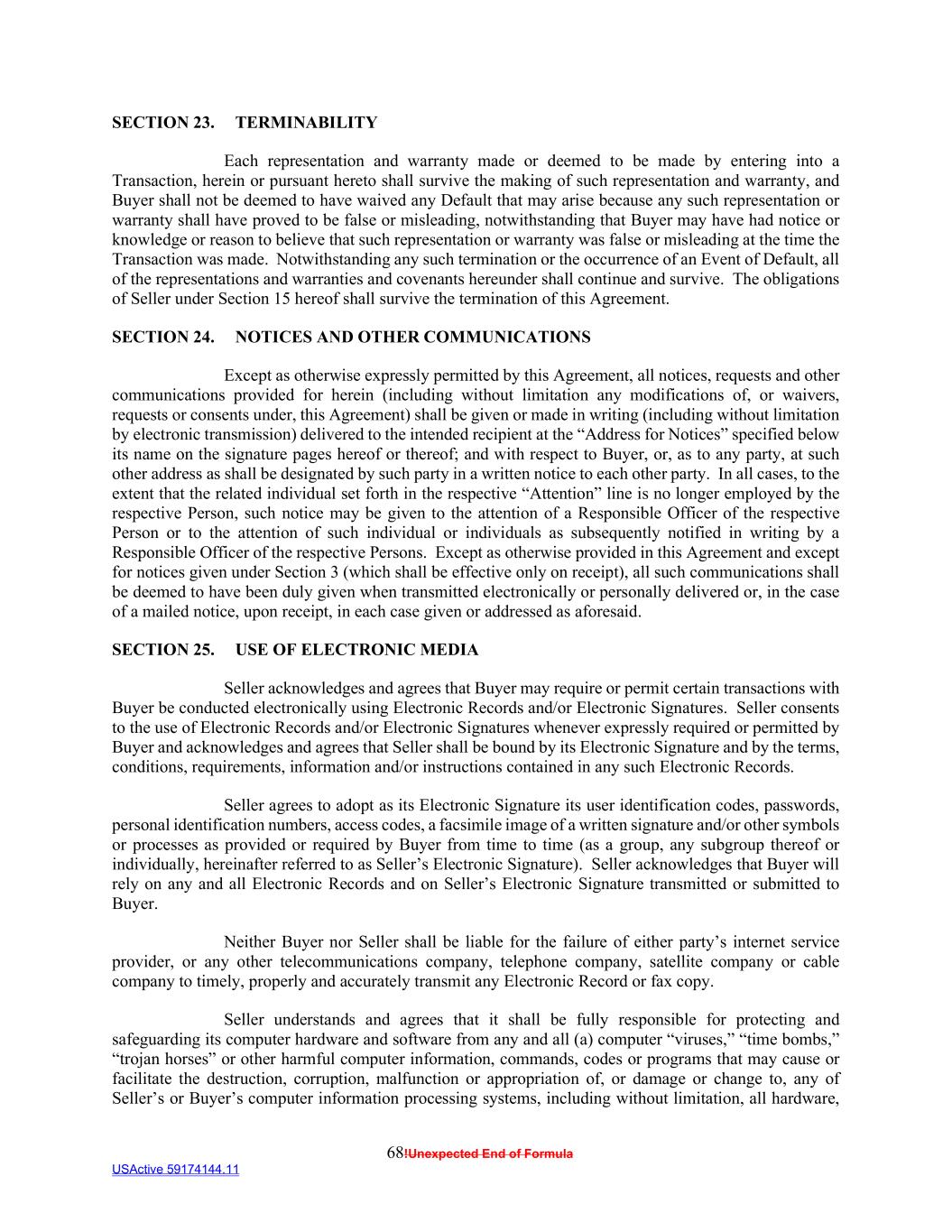 68!Unexpected End of Formula USActive 59174144.11 SECTION 23. TERMINABILITY Each representation and warranty made or deemed to be made by entering into a Transaction, herein or pursuant hereto shall survive the making of such representation and warranty, and Buyer shall not be deemed to have waived any Default that may arise because any such representation or warranty shall have proved to be false or misleading, notwithstanding that Buyer may have had notice or knowledge or reason to believe that such representation or warranty was false or misleading at the time the Transaction was made. Notwithstanding any such termination or the occurrence of an Event of Default, all of the representations and warranties and covenants hereunder shall continue and survive. The obligations of Seller under Section 15 hereof shall survive the termination of this Agreement. SECTION 24. NOTICES AND OTHER COMMUNICATIONS Except as otherwise expressly permitted by this Agreement, all notices, requests and other communications provided for herein (including without limitation any modifications of, or waivers, requests or consents under, this Agreement) shall be given or made in writing (including without limitation by electronic transmission) delivered to the intended recipient at the “Address for Notices” specified below its name on the signature pages hereof or thereof; and with respect to Buyer, or, as to any party, at such other address as shall be designated by such party in a written notice to each other party. In all cases, to the extent that the related individual set forth in the respective “Attention” line is no longer employed by the respective Person, such notice may be given to the attention of a Responsible Officer of the respective Person or to the attention of such individual or individuals as subsequently notified in writing by a Responsible Officer of the respective Persons. Except as otherwise provided in this Agreement and except for notices given under Section 3 (which shall be effective only on receipt), all such communications shall be deemed to have been duly given when transmitted electronically or personally delivered or, in the case of a mailed notice, upon receipt, in each case given or addressed as aforesaid. SECTION 25. USE OF ELECTRONIC MEDIA Seller acknowledges and agrees that Buyer may require or permit certain transactions with Buyer be conducted electronically using Electronic Records and/or Electronic Signatures. Seller consents to the use of Electronic Records and/or Electronic Signatures whenever expressly required or permitted by Buyer and acknowledges and agrees that Seller shall be bound by its Electronic Signature and by the terms, conditions, requirements, information and/or instructions contained in any such Electronic Records. Seller agrees to adopt as its Electronic Signature its user identification codes, passwords, personal identification numbers, access codes, a facsimile image of a written signature and/or other symbols or processes as provided or required by Buyer from time to time (as a group, any subgroup thereof or individually, hereinafter referred to as Seller’s Electronic Signature). Seller acknowledges that Buyer will rely on any and all Electronic Records and on Seller’s Electronic Signature transmitted or submitted to Buyer. Neither Buyer nor Seller shall be liable for the failure of either party’s internet service provider, or any other telecommunications company, telephone company, satellite company or cable company to timely, properly and accurately transmit any Electronic Record or fax copy. Seller understands and agrees that it shall be fully responsible for protecting and safeguarding its computer hardware and software from any and all (a) computer “viruses,” “time bombs,” “trojan horses” or other harmful computer information, commands, codes or programs that may cause or facilitate the destruction, corruption, malfunction or appropriation of, or damage or change to, any of Seller’s or Buyer’s computer information processing systems, including without limitation, all hardware,
