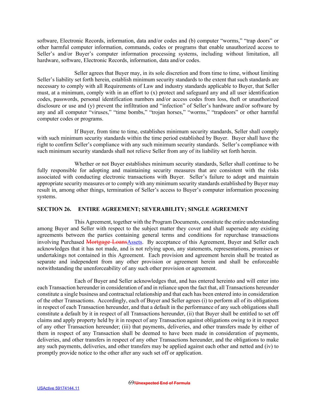 69!Unexpected End of Formula USActive 59174144.11 software, Electronic Records, information, data and/or codes and (b) computer “worms,” “trap doors” or other harmful computer information, commands, codes or programs that enable unauthorized access to Seller’s and/or Buyer’s computer information processing systems, including without limitation, all hardware, software, Electronic Records, information, data and/or codes. Seller agrees that Buyer may, in its sole discretion and from time to time, without limiting Seller’s liability set forth herein, establish minimum security standards to the extent that such standards are necessary to comply with all Requirements of Law and industry standards applicable to Buyer, that Seller must, at a minimum, comply with in an effort to (x) protect and safeguard any and all user identification codes, passwords, personal identification numbers and/or access codes from loss, theft or unauthorized disclosure or use and (y) prevent the infiltration and “infection” of Seller’s hardware and/or software by any and all computer “viruses,” “time bombs,” “trojan horses,” “worms,” “trapdoors” or other harmful computer codes or programs. If Buyer, from time to time, establishes minimum security standards, Seller shall comply with such minimum security standards within the time period established by Buyer. Buyer shall have the right to confirm Seller’s compliance with any such minimum security standards. Seller’s compliance with such minimum security standards shall not relieve Seller from any of its liability set forth herein. Whether or not Buyer establishes minimum security standards, Seller shall continue to be fully responsible for adopting and maintaining security measures that are consistent with the risks associated with conducting electronic transactions with Buyer. Seller’s failure to adopt and maintain appropriate security measures or to comply with any minimum security standards established by Buyer may result in, among other things, termination of Seller’s access to Buyer’s computer information processing systems. SECTION 26. ENTIRE AGREEMENT; SEVERABILITY; SINGLE AGREEMENT This Agreement, together with the Program Documents, constitute the entire understanding among Buyer and Seller with respect to the subject matter they cover and shall supersede any existing agreements between the parties containing general terms and conditions for repurchase transactions involving Purchased Mortgage LoansAssets. By acceptance of this Agreement, Buyer and Seller each acknowledges that it has not made, and is not relying upon, any statements, representations, promises or undertakings not contained in this Agreement. Each provision and agreement herein shall be treated as separate and independent from any other provision or agreement herein and shall be enforceable notwithstanding the unenforceability of any such other provision or agreement. Each of Buyer and Seller acknowledges that, and has entered hereinto and will enter into each Transaction hereunder in consideration of and in reliance upon the fact that, all Transactions hereunder constitute a single business and contractual relationship and that each has been entered into in consideration of the other Transactions. Accordingly, each of Buyer and Seller agrees (i) to perform all of its obligations in respect of each Transaction hereunder, and that a default in the performance of any such obligations shall constitute a default by it in respect of all Transactions hereunder, (ii) that Buyer shall be entitled to set off claims and apply property held by it in respect of any Transaction against obligations owing to it in respect of any other Transaction hereunder; (iii) that payments, deliveries, and other transfers made by either of them in respect of any Transaction shall be deemed to have been made in consideration of payments, deliveries, and other transfers in respect of any other Transactions hereunder, and the obligations to make any such payments, deliveries, and other transfers may be applied against each other and netted and (iv) to promptly provide notice to the other after any such set off or application.