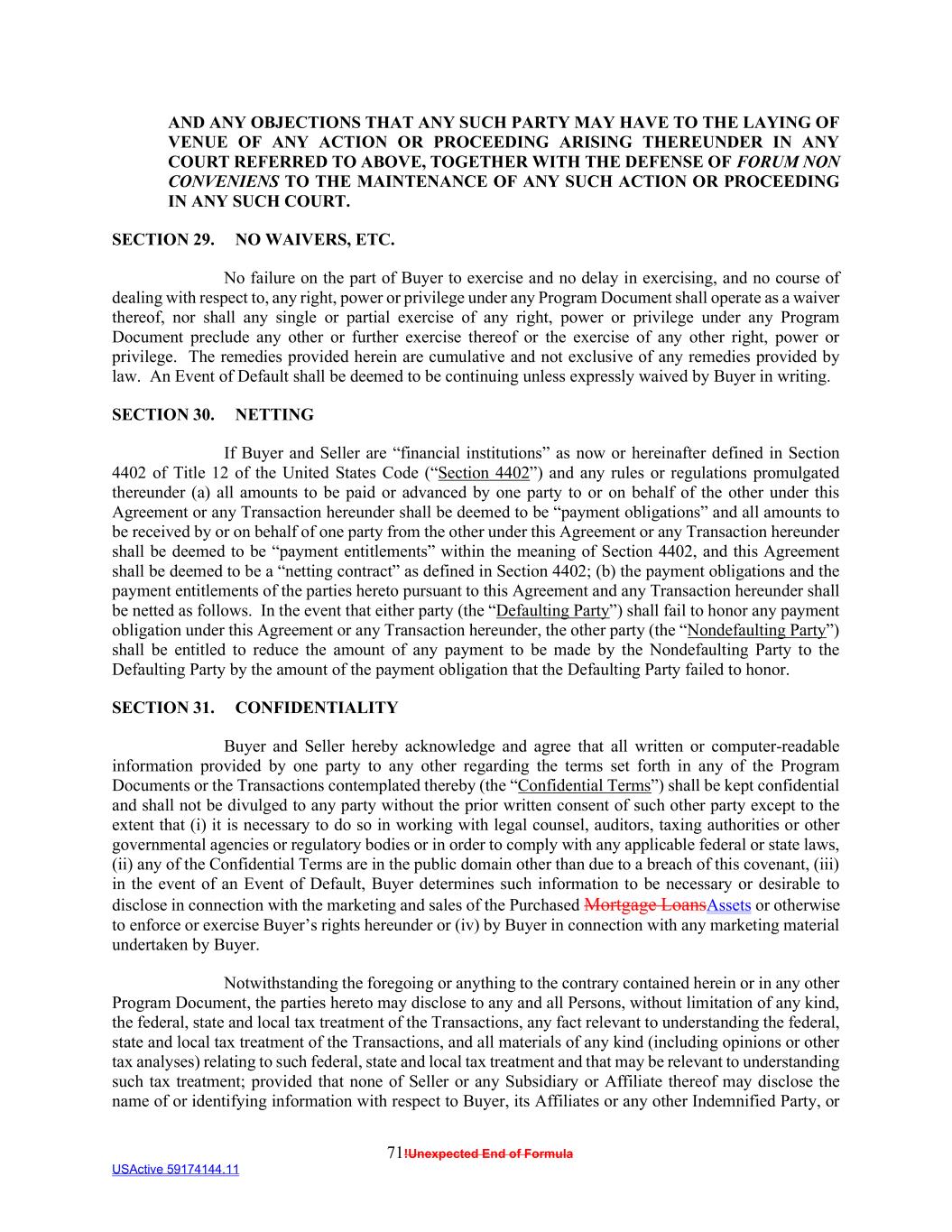 71!Unexpected End of Formula USActive 59174144.11 AND ANY OBJECTIONS THAT ANY SUCH PARTY MAY HAVE TO THE LAYING OF VENUE OF ANY ACTION OR PROCEEDING ARISING THEREUNDER IN ANY COURT REFERRED TO ABOVE, TOGETHER WITH THE DEFENSE OF FORUM NON CONVENIENS TO THE MAINTENANCE OF ANY SUCH ACTION OR PROCEEDING IN ANY SUCH COURT. SECTION 29. NO WAIVERS, ETC. No failure on the part of Buyer to exercise and no delay in exercising, and no course of dealing with respect to, any right, power or privilege under any Program Document shall operate as a waiver thereof, nor shall any single or partial exercise of any right, power or privilege under any Program Document preclude any other or further exercise thereof or the exercise of any other right, power or privilege. The remedies provided herein are cumulative and not exclusive of any remedies provided by law. An Event of Default shall be deemed to be continuing unless expressly waived by Buyer in writing. SECTION 30. NETTING If Buyer and Seller are “financial institutions” as now or hereinafter defined in Section 4402 of Title 12 of the United States Code (“Section 4402”) and any rules or regulations promulgated thereunder (a) all amounts to be paid or advanced by one party to or on behalf of the other under this Agreement or any Transaction hereunder shall be deemed to be “payment obligations” and all amounts to be received by or on behalf of one party from the other under this Agreement or any Transaction hereunder shall be deemed to be “payment entitlements” within the meaning of Section 4402, and this Agreement shall be deemed to be a “netting contract” as defined in Section 4402; (b) the payment obligations and the payment entitlements of the parties hereto pursuant to this Agreement and any Transaction hereunder shall be netted as follows. In the event that either party (the “Defaulting Party”) shall fail to honor any payment obligation under this Agreement or any Transaction hereunder, the other party (the “Nondefaulting Party”) shall be entitled to reduce the amount of any payment to be made by the Nondefaulting Party to the Defaulting Party by the amount of the payment obligation that the Defaulting Party failed to honor. SECTION 31. CONFIDENTIALITY Buyer and Seller hereby acknowledge and agree that all written or computer-readable information provided by one party to any other regarding the terms set forth in any of the Program Documents or the Transactions contemplated thereby (the “Confidential Terms”) shall be kept confidential and shall not be divulged to any party without the prior written consent of such other party except to the extent that (i) it is necessary to do so in working with legal counsel, auditors, taxing authorities or other governmental agencies or regulatory bodies or in order to comply with any applicable federal or state laws, (ii) any of the Confidential Terms are in the public domain other than due to a breach of this covenant, (iii) in the event of an Event of Default, Buyer determines such information to be necessary or desirable to disclose in connection with the marketing and sales of the Purchased Mortgage LoansAssets or otherwise to enforce or exercise Buyer’s rights hereunder or (iv) by Buyer in connection with any marketing material undertaken by Buyer. Notwithstanding the foregoing or anything to the contrary contained herein or in any other Program Document, the parties hereto may disclose to any and all Persons, without limitation of any kind, the federal, state and local tax treatment of the Transactions, any fact relevant to understanding the federal, state and local tax treatment of the Transactions, and all materials of any kind (including opinions or other tax analyses) relating to such federal, state and local tax treatment and that may be relevant to understanding such tax treatment; provided that none of Seller or any Subsidiary or Affiliate thereof may disclose the name of or identifying information with respect to Buyer, its Affiliates or any other Indemnified Party, or