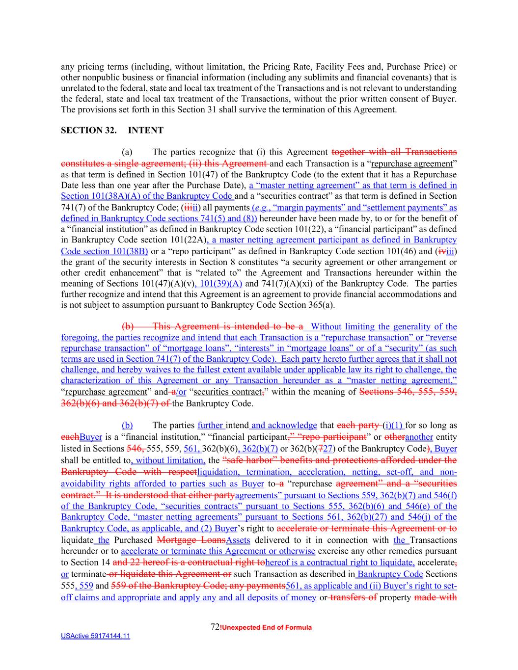 72!Unexpected End of Formula USActive 59174144.11 any pricing terms (including, without limitation, the Pricing Rate, Facility Fees and, Purchase Price) or other nonpublic business or financial information (including any sublimits and financial covenants) that is unrelated to the federal, state and local tax treatment of the Transactions and is not relevant to understanding the federal, state and local tax treatment of the Transactions, without the prior written consent of Buyer. The provisions set forth in this Section 31 shall survive the termination of this Agreement. SECTION 32. INTENT (a) The parties recognize that (i) this Agreement together with all Transactions constitutes a single agreement; (ii) this Agreement and each Transaction is a “repurchase agreement” as that term is defined in Section 101(47) of the Bankruptcy Code (to the extent that it has a Repurchase Date less than one year after the Purchase Date), a “master netting agreement” as that term is defined in Section 101(38A)(A) of the Bankruptcy Code and a “securities contract” as that term is defined in Section 741(7) of the Bankruptcy Code; (iiiii) all payments (e.g., “margin payments” and “settlement payments” as defined in Bankruptcy Code sections 741(5) and (8)) hereunder have been made by, to or for the benefit of a “financial institution” as defined in Bankruptcy Code section 101(22), a “financial participant” as defined in Bankruptcy Code section 101(22A), a master netting agreement participant as defined in Bankruptcy Code section 101(38B) or a “repo participant” as defined in Bankruptcy Code section 101(46) and (iviii) the grant of the security interests in Section 8 constitutes “a security agreement or other arrangement or other credit enhancement” that is “related to” the Agreement and Transactions hereunder within the meaning of Sections 101(47)(A)(v), 101(39)(A) and 741(7)(A)(xi) of the Bankruptcy Code. The parties further recognize and intend that this Agreement is an agreement to provide financial accommodations and is not subject to assumption pursuant to Bankruptcy Code Section 365(a). (b) This Agreement is intended to be a Without limiting the generality of the foregoing, the parties recognize and intend that each Transaction is a “repurchase transaction” or “reverse repurchase transaction” of “mortgage loans”, “interests” in “mortgage loans” or of a “security” (as such terms are used in Section 741(7) of the Bankruptcy Code). Each party hereto further agrees that it shall not challenge, and hereby waives to the fullest extent available under applicable law its right to challenge, the characterization of this Agreement or any Transaction hereunder as a “master netting agreement,” “repurchase agreement” and a/or “securities contract,” within the meaning of Sections 546, 555, 559, 362(b)(6) and 362(b)(7) of the Bankruptcy Code. (b) The parties further intend and acknowledge that each party (i)(1) for so long as eachBuyer is a “financial institution,” “financial participant,” “repo participant” or otheranother entity listed in Sections 546, 555, 559, 561, 362(b)(6), 362(b)(7) or 362(b)(727) of the Bankruptcy Code), Buyer shall be entitled to, without limitation, the “safe harbor” benefits and protections afforded under the Bankruptcy Code with respectliquidation, termination, acceleration, netting, set-off, and non- avoidability rights afforded to parties such as Buyer to a “repurchase agreement” and a “securities contract.” It is understood that either partyagreements” pursuant to Sections 559, 362(b)(7) and 546(f) of the Bankruptcy Code, “securities contracts” pursuant to Sections 555, 362(b)(6) and 546(e) of the Bankruptcy Code, “master netting agreements” pursuant to Sections 561, 362(b)(27) and 546(j) of the Bankruptcy Code, as applicable, and (2) Buyer’s right to accelerate or terminate this Agreement or to liquidate the Purchased Mortgage LoansAssets delivered to it in connection with the Transactions hereunder or to accelerate or terminate this Agreement or otherwise exercise any other remedies pursuant to Section 14 and 22 hereof is a contractual right tohereof is a contractual right to liquidate, accelerate, or terminate or liquidate this Agreement or such Transaction as described in Bankruptcy Code Sections 555, 559 and 559 of the Bankruptcy Code; any payments561, as applicable and (ii) Buyer’s right to set- off claims and appropriate and apply any and all deposits of money or transfers of property made with