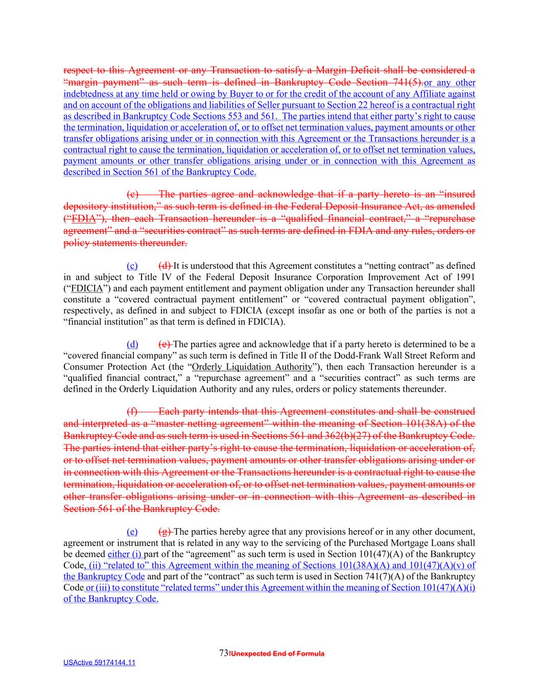 73!Unexpected End of Formula USActive 59174144.11 respect to this Agreement or any Transaction to satisfy a Margin Deficit shall be considered a “margin payment” as such term is defined in Bankruptcy Code Section 741(5).or any other indebtedness at any time held or owing by Buyer to or for the credit of the account of any Affiliate against and on account of the obligations and liabilities of Seller pursuant to Section 22 hereof is a contractual right as described in Bankruptcy Code Sections 553 and 561. The parties intend that either party’s right to cause the termination, liquidation or acceleration of, or to offset net termination values, payment amounts or other transfer obligations arising under or in connection with this Agreement or the Transactions hereunder is a contractual right to cause the termination, liquidation or acceleration of, or to offset net termination values, payment amounts or other transfer obligations arising under or in connection with this Agreement as described in Section 561 of the Bankruptcy Code. (c) The parties agree and acknowledge that if a party hereto is an “insured depository institution,” as such term is defined in the Federal Deposit Insurance Act, as amended (“FDIA”), then each Transaction hereunder is a “qualified financial contract,” a “repurchase agreement” and a “securities contract” as such terms are defined in FDIA and any rules, orders or policy statements thereunder. (c) (d) It is understood that this Agreement constitutes a “netting contract” as defined in and subject to Title IV of the Federal Deposit Insurance Corporation Improvement Act of 1991 (“FDICIA”) and each payment entitlement and payment obligation under any Transaction hereunder shall constitute a “covered contractual payment entitlement” or “covered contractual payment obligation”, respectively, as defined in and subject to FDICIA (except insofar as one or both of the parties is not a “financial institution” as that term is defined in FDICIA). (d) (e) The parties agree and acknowledge that if a party hereto is determined to be a “covered financial company” as such term is defined in Title II of the Dodd-Frank Wall Street Reform and Consumer Protection Act (the “Orderly Liquidation Authority”), then each Transaction hereunder is a “qualified financial contract,” a “repurchase agreement” and a “securities contract” as such terms are defined in the Orderly Liquidation Authority and any rules, orders or policy statements thereunder. (f) Each party intends that this Agreement constitutes and shall be construed and interpreted as a “master netting agreement” within the meaning of Section 101(38A) of the Bankruptcy Code and as such term is used in Sections 561 and 362(b)(27) of the Bankruptcy Code. The parties intend that either party’s right to cause the termination, liquidation or acceleration of, or to offset net termination values, payment amounts or other transfer obligations arising under or in connection with this Agreement or the Transactions hereunder is a contractual right to cause the termination, liquidation or acceleration of, or to offset net termination values, payment amounts or other transfer obligations arising under or in connection with this Agreement as described in Section 561 of the Bankruptcy Code. (e) (g) The parties hereby agree that any provisions hereof or in any other document, agreement or instrument that is related in any way to the servicing of the Purchased Mortgage Loans shall be deemed either (i) part of the “agreement” as such term is used in Section 101(47)(A) of the Bankruptcy Code, (ii) “related to” this Agreement within the meaning of Sections 101(38A)(A) and 101(47)(A)(v) of the Bankruptcy Code and part of the “contract” as such term is used in Section 741(7)(A) of the Bankruptcy Code or (iii) to constitute “related terms” under this Agreement within the meaning of Section 101(47)(A)(i) of the Bankruptcy Code.
