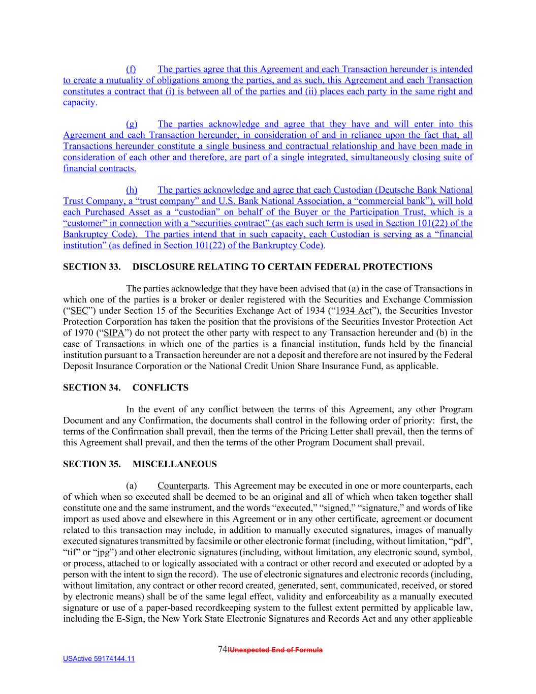74!Unexpected End of Formula USActive 59174144.11 (f) The parties agree that this Agreement and each Transaction hereunder is intended to create a mutuality of obligations among the parties, and as such, this Agreement and each Transaction constitutes a contract that (i) is between all of the parties and (ii) places each party in the same right and capacity. (g) The parties acknowledge and agree that they have and will enter into this Agreement and each Transaction hereunder, in consideration of and in reliance upon the fact that, all Transactions hereunder constitute a single business and contractual relationship and have been made in consideration of each other and therefore, are part of a single integrated, simultaneously closing suite of financial contracts. (h) The parties acknowledge and agree that each Custodian (Deutsche Bank National Trust Company, a “trust company” and U.S. Bank National Association, a “commercial bank”), will hold each Purchased Asset as a “custodian” on behalf of the Buyer or the Participation Trust, which is a “customer” in connection with a “securities contract” (as each such term is used in Section 101(22) of the Bankruptcy Code). The parties intend that in such capacity, each Custodian is serving as a “financial institution” (as defined in Section 101(22) of the Bankruptcy Code). SECTION 33. DISCLOSURE RELATING TO CERTAIN FEDERAL PROTECTIONS The parties acknowledge that they have been advised that (a) in the case of Transactions in which one of the parties is a broker or dealer registered with the Securities and Exchange Commission (“SEC”) under Section 15 of the Securities Exchange Act of 1934 (“1934 Act”), the Securities Investor Protection Corporation has taken the position that the provisions of the Securities Investor Protection Act of 1970 (“SIPA”) do not protect the other party with respect to any Transaction hereunder and (b) in the case of Transactions in which one of the parties is a financial institution, funds held by the financial institution pursuant to a Transaction hereunder are not a deposit and therefore are not insured by the Federal Deposit Insurance Corporation or the National Credit Union Share Insurance Fund, as applicable. SECTION 34. CONFLICTS In the event of any conflict between the terms of this Agreement, any other Program Document and any Confirmation, the documents shall control in the following order of priority: first, the terms of the Confirmation shall prevail, then the terms of the Pricing Letter shall prevail, then the terms of this Agreement shall prevail, and then the terms of the other Program Document shall prevail. SECTION 35. MISCELLANEOUS (a) Counterparts. This Agreement may be executed in one or more counterparts, each of which when so executed shall be deemed to be an original and all of which when taken together shall constitute one and the same instrument, and the words “executed,” “signed,” “signature,” and words of like import as used above and elsewhere in this Agreement or in any other certificate, agreement or document related to this transaction may include, in addition to manually executed signatures, images of manually executed signatures transmitted by facsimile or other electronic format (including, without limitation, “pdf”, “tif” or “jpg”) and other electronic signatures (including, without limitation, any electronic sound, symbol, or process, attached to or logically associated with a contract or other record and executed or adopted by a person with the intent to sign the record). The use of electronic signatures and electronic records (including, without limitation, any contract or other record created, generated, sent, communicated, received, or stored by electronic means) shall be of the same legal effect, validity and enforceability as a manually executed signature or use of a paper-based recordkeeping system to the fullest extent permitted by applicable law, including the E-Sign, the New York State Electronic Signatures and Records Act and any other applicable