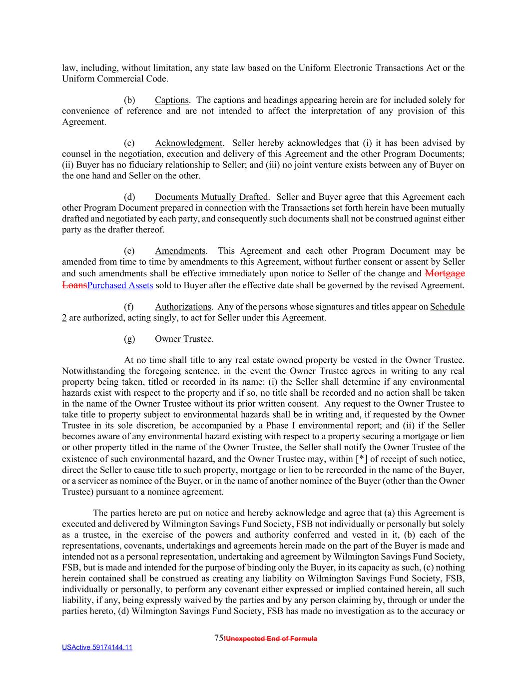75!Unexpected End of Formula USActive 59174144.11 law, including, without limitation, any state law based on the Uniform Electronic Transactions Act or the Uniform Commercial Code. (b) Captions. The captions and headings appearing herein are for included solely for convenience of reference and are not intended to affect the interpretation of any provision of this Agreement. (c) Acknowledgment. Seller hereby acknowledges that (i) it has been advised by counsel in the negotiation, execution and delivery of this Agreement and the other Program Documents; (ii) Buyer has no fiduciary relationship to Seller; and (iii) no joint venture exists between any of Buyer on the one hand and Seller on the other. (d) Documents Mutually Drafted. Seller and Buyer agree that this Agreement each other Program Document prepared in connection with the Transactions set forth herein have been mutually drafted and negotiated by each party, and consequently such documents shall not be construed against either party as the drafter thereof. (e) Amendments. This Agreement and each other Program Document may be amended from time to time by amendments to this Agreement, without further consent or assent by Seller and such amendments shall be effective immediately upon notice to Seller of the change and Mortgage LoansPurchased Assets sold to Buyer after the effective date shall be governed by the revised Agreement. (f) Authorizations. Any of the persons whose signatures and titles appear on Schedule 2 are authorized, acting singly, to act for Seller under this Agreement. (g) Owner Trustee. At no time shall title to any real estate owned property be vested in the Owner Trustee. Notwithstanding the foregoing sentence, in the event the Owner Trustee agrees in writing to any real property being taken, titled or recorded in its name: (i) the Seller shall determine if any environmental hazards exist with respect to the property and if so, no title shall be recorded and no action shall be taken in the name of the Owner Trustee without its prior written consent. Any request to the Owner Trustee to take title to property subject to environmental hazards shall be in writing and, if requested by the Owner Trustee in its sole discretion, be accompanied by a Phase I environmental report; and (ii) if the Seller becomes aware of any environmental hazard existing with respect to a property securing a mortgage or lien or other property titled in the name of the Owner Trustee, the Seller shall notify the Owner Trustee of the existence of such environmental hazard, and the Owner Trustee may, within [*] of receipt of such notice, direct the Seller to cause title to such property, mortgage or lien to be rerecorded in the name of the Buyer, or a servicer as nominee of the Buyer, or in the name of another nominee of the Buyer (other than the Owner Trustee) pursuant to a nominee agreement. The parties hereto are put on notice and hereby acknowledge and agree that (a) this Agreement is executed and delivered by Wilmington Savings Fund Society, FSB not individually or personally but solely as a trustee, in the exercise of the powers and authority conferred and vested in it, (b) each of the representations, covenants, undertakings and agreements herein made on the part of the Buyer is made and intended not as a personal representation, undertaking and agreement by Wilmington Savings Fund Society, FSB, but is made and intended for the purpose of binding only the Buyer, in its capacity as such, (c) nothing herein contained shall be construed as creating any liability on Wilmington Savings Fund Society, FSB, individually or personally, to perform any covenant either expressed or implied contained herein, all such liability, if any, being expressly waived by the parties and by any person claiming by, through or under the parties hereto, (d) Wilmington Savings Fund Society, FSB has made no investigation as to the accuracy or