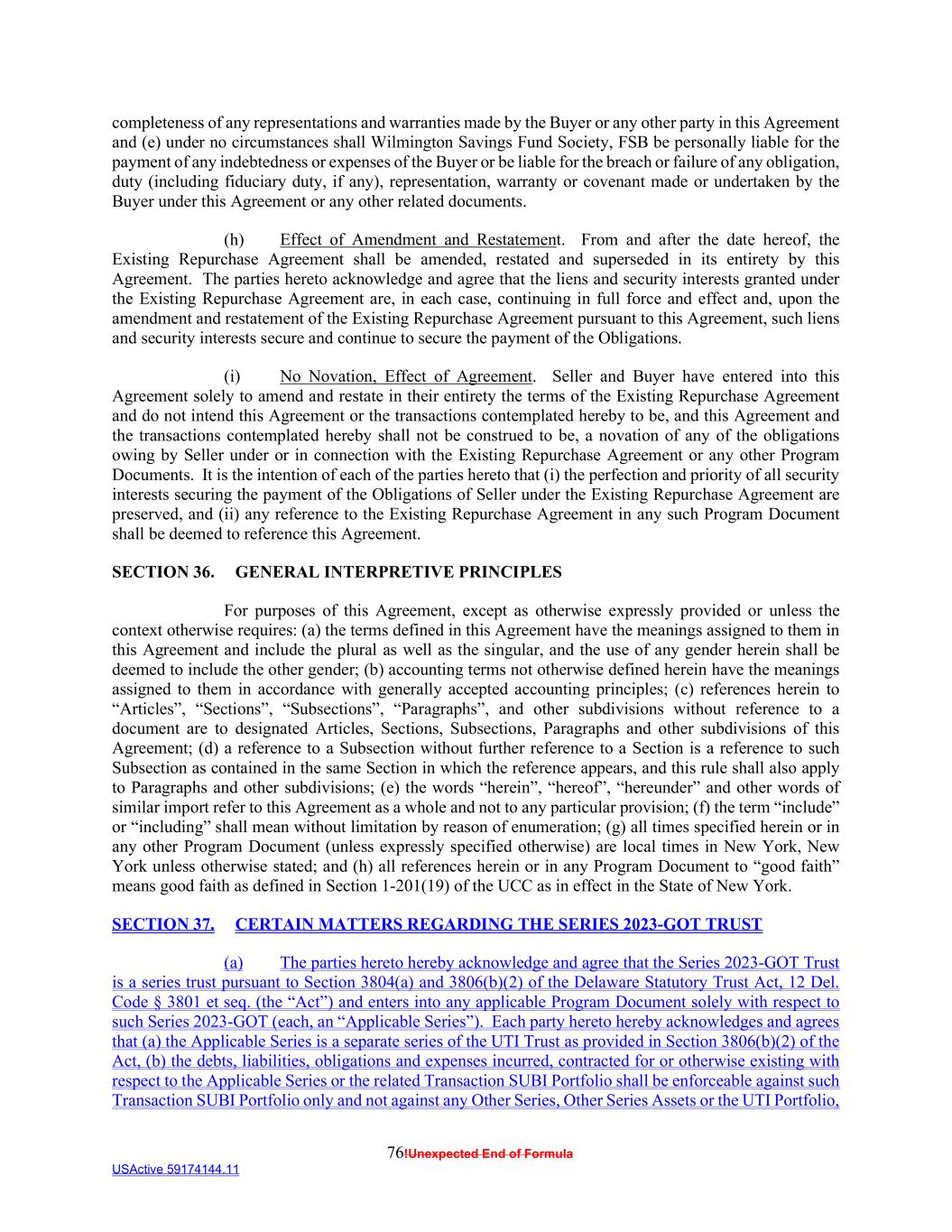 76!Unexpected End of Formula USActive 59174144.11 completeness of any representations and warranties made by the Buyer or any other party in this Agreement and (e) under no circumstances shall Wilmington Savings Fund Society, FSB be personally liable for the payment of any indebtedness or expenses of the Buyer or be liable for the breach or failure of any obligation, duty (including fiduciary duty, if any), representation, warranty or covenant made or undertaken by the Buyer under this Agreement or any other related documents. (h) Effect of Amendment and Restatement. From and after the date hereof, the Existing Repurchase Agreement shall be amended, restated and superseded in its entirety by this Agreement. The parties hereto acknowledge and agree that the liens and security interests granted under the Existing Repurchase Agreement are, in each case, continuing in full force and effect and, upon the amendment and restatement of the Existing Repurchase Agreement pursuant to this Agreement, such liens and security interests secure and continue to secure the payment of the Obligations. (i) No Novation, Effect of Agreement. Seller and Buyer have entered into this Agreement solely to amend and restate in their entirety the terms of the Existing Repurchase Agreement and do not intend this Agreement or the transactions contemplated hereby to be, and this Agreement and the transactions contemplated hereby shall not be construed to be, a novation of any of the obligations owing by Seller under or in connection with the Existing Repurchase Agreement or any other Program Documents. It is the intention of each of the parties hereto that (i) the perfection and priority of all security interests securing the payment of the Obligations of Seller under the Existing Repurchase Agreement are preserved, and (ii) any reference to the Existing Repurchase Agreement in any such Program Document shall be deemed to reference this Agreement. SECTION 36. GENERAL INTERPRETIVE PRINCIPLES For purposes of this Agreement, except as otherwise expressly provided or unless the context otherwise requires: (a) the terms defined in this Agreement have the meanings assigned to them in this Agreement and include the plural as well as the singular, and the use of any gender herein shall be deemed to include the other gender; (b) accounting terms not otherwise defined herein have the meanings assigned to them in accordance with generally accepted accounting principles; (c) references herein to “Articles”, “Sections”, “Subsections”, “Paragraphs”, and other subdivisions without reference to a document are to designated Articles, Sections, Subsections, Paragraphs and other subdivisions of this Agreement; (d) a reference to a Subsection without further reference to a Section is a reference to such Subsection as contained in the same Section in which the reference appears, and this rule shall also apply to Paragraphs and other subdivisions; (e) the words “herein”, “hereof”, “hereunder” and other words of similar import refer to this Agreement as a whole and not to any particular provision; (f) the term “include” or “including” shall mean without limitation by reason of enumeration; (g) all times specified herein or in any other Program Document (unless expressly specified otherwise) are local times in New York, New York unless otherwise stated; and (h) all references herein or in any Program Document to “good faith” means good faith as defined in Section 1-201(19) of the UCC as in effect in the State of New York. SECTION 37. CERTAIN MATTERS REGARDING THE SERIES 2023-GOT TRUST (a) The parties hereto hereby acknowledge and agree that the Series 2023-GOT Trust is a series trust pursuant to Section 3804(a) and 3806(b)(2) of the Delaware Statutory Trust Act, 12 Del. Code § 3801 et seq. (the “Act”) and enters into any applicable Program Document solely with respect to such Series 2023-GOT (each, an “Applicable Series”). Each party hereto hereby acknowledges and agrees that (a) the Applicable Series is a separate series of the UTI Trust as provided in Section 3806(b)(2) of the Act, (b) the debts, liabilities, obligations and expenses incurred, contracted for or otherwise existing with respect to the Applicable Series or the related Transaction SUBI Portfolio shall be enforceable against such Transaction SUBI Portfolio only and not against any Other Series, Other Series Assets or the UTI Portfolio,