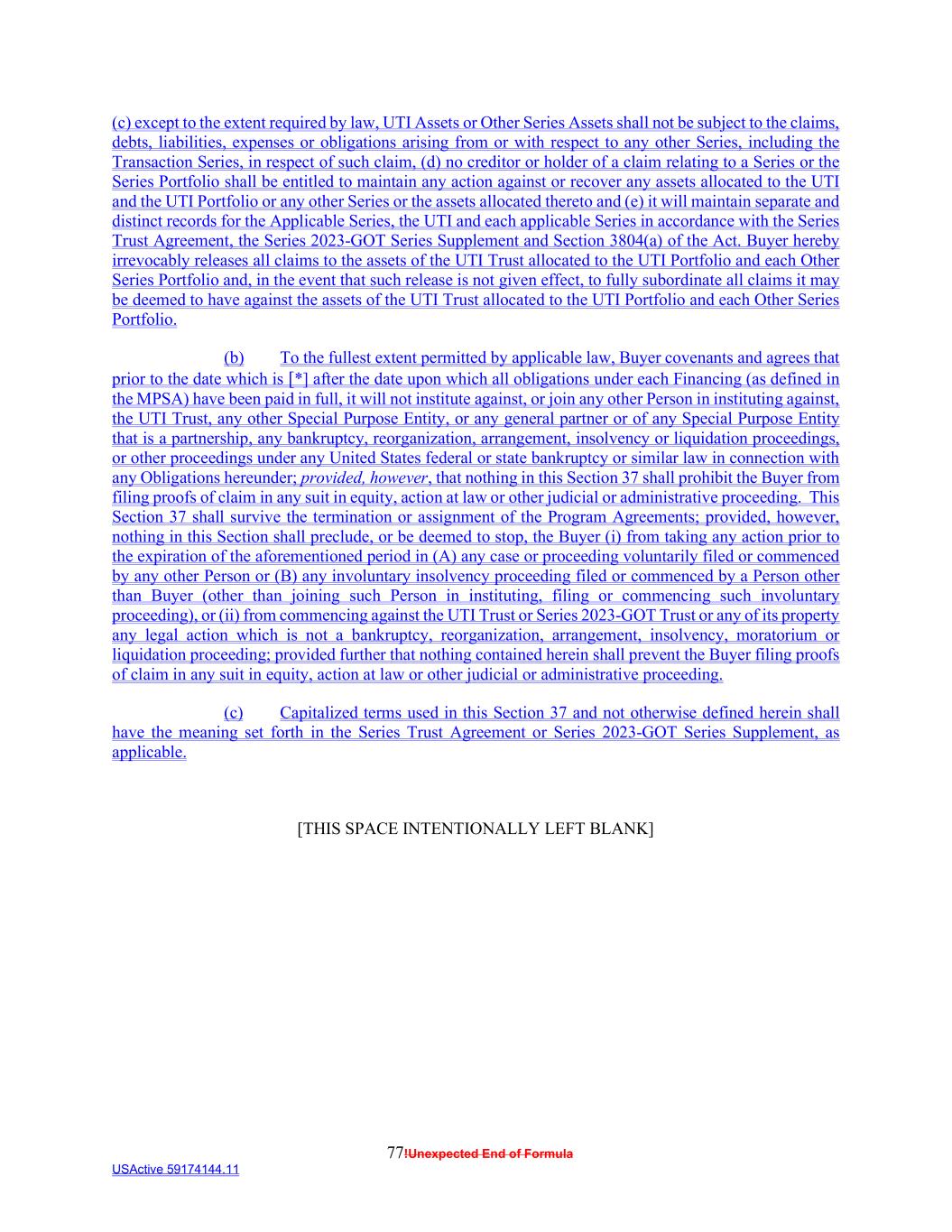 77!Unexpected End of Formula USActive 59174144.11 (c) except to the extent required by law, UTI Assets or Other Series Assets shall not be subject to the claims, debts, liabilities, expenses or obligations arising from or with respect to any other Series, including the Transaction Series, in respect of such claim, (d) no creditor or holder of a claim relating to a Series or the Series Portfolio shall be entitled to maintain any action against or recover any assets allocated to the UTI and the UTI Portfolio or any other Series or the assets allocated thereto and (e) it will maintain separate and distinct records for the Applicable Series, the UTI and each applicable Series in accordance with the Series Trust Agreement, the Series 2023-GOT Series Supplement and Section 3804(a) of the Act. Buyer hereby irrevocably releases all claims to the assets of the UTI Trust allocated to the UTI Portfolio and each Other Series Portfolio and, in the event that such release is not given effect, to fully subordinate all claims it may be deemed to have against the assets of the UTI Trust allocated to the UTI Portfolio and each Other Series Portfolio. (b) To the fullest extent permitted by applicable law, Buyer covenants and agrees that prior to the date which is [*] after the date upon which all obligations under each Financing (as defined in the MPSA) have been paid in full, it will not institute against, or join any other Person in instituting against, the UTI Trust, any other Special Purpose Entity, or any general partner or of any Special Purpose Entity that is a partnership, any bankruptcy, reorganization, arrangement, insolvency or liquidation proceedings, or other proceedings under any United States federal or state bankruptcy or similar law in connection with any Obligations hereunder; provided, however, that nothing in this Section 37 shall prohibit the Buyer from filing proofs of claim in any suit in equity, action at law or other judicial or administrative proceeding. This Section 37 shall survive the termination or assignment of the Program Agreements; provided, however, nothing in this Section shall preclude, or be deemed to stop, the Buyer (i) from taking any action prior to the expiration of the aforementioned period in (A) any case or proceeding voluntarily filed or commenced by any other Person or (B) any involuntary insolvency proceeding filed or commenced by a Person other than Buyer (other than joining such Person in instituting, filing or commencing such involuntary proceeding), or (ii) from commencing against the UTI Trust or Series 2023-GOT Trust or any of its property any legal action which is not a bankruptcy, reorganization, arrangement, insolvency, moratorium or liquidation proceeding; provided further that nothing contained herein shall prevent the Buyer filing proofs of claim in any suit in equity, action at law or other judicial or administrative proceeding. (c) Capitalized terms used in this Section 37 and not otherwise defined herein shall have the meaning set forth in the Series Trust Agreement or Series 2023-GOT Series Supplement, as applicable. [THIS SPACE INTENTIONALLY LEFT BLANK]