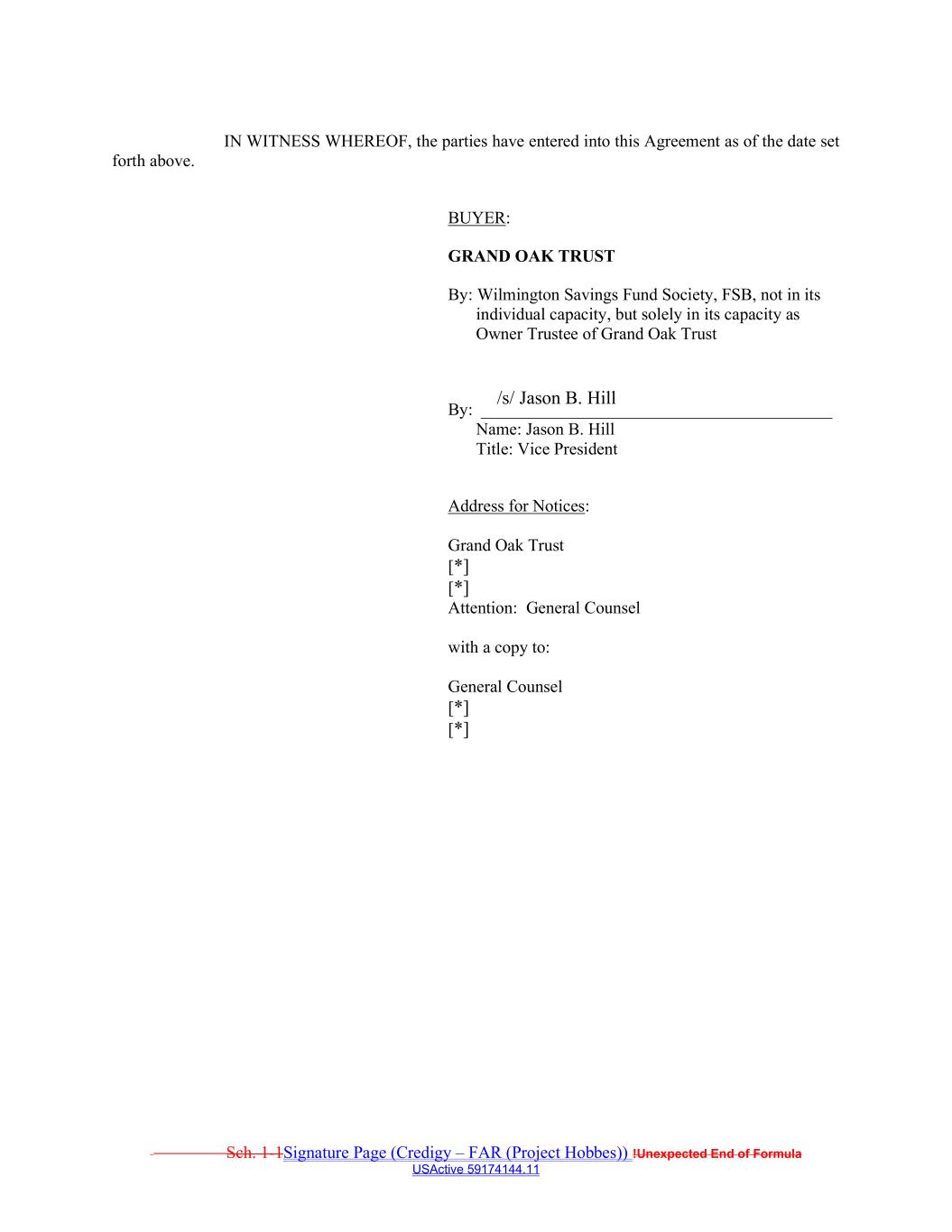 Sch. 1-1Signature Page (Credigy – FAR (Project Hobbes)) !Unexpected End of Formula USActive 59174144.11 /s/ Jason B. Hill IN WITNESS WHEREOF, the parties have entered into this Agreement as of the date set forth above. BUYER: GRAND OAK TRUST By: Wilmington Savings Fund Society, FSB, not in its individual capacity, but solely in its capacity as Owner Trustee of Grand Oak Trust By: _________________________________________ Name: Jason B. Hill Title: Vice President Address for Notices: Grand Oak Trust [*] [*] Attention: General Counsel with a copy to: General Counsel [*] [*]
