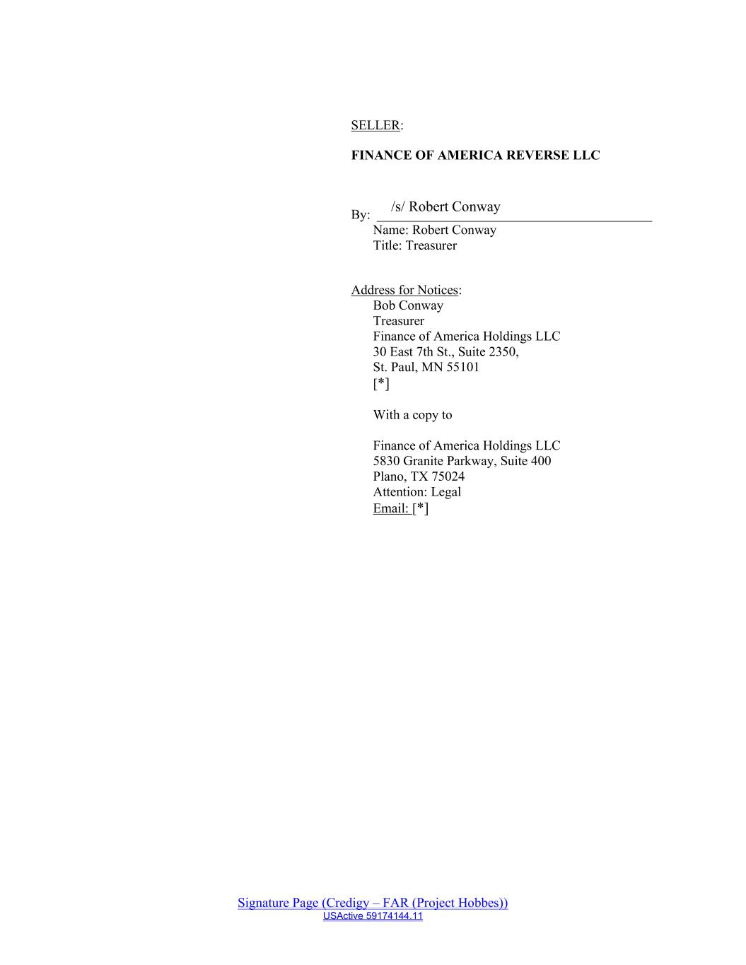 Signature Page (Credigy – FAR (Project Hobbes)) USActive 59174144.11 /s/ Robert Conway SELLER: FINANCE OF AMERICA REVERSE LLC By: _________________________________________ Name: Robert Conway Title: Treasurer Address for Notices: Bob Conway Treasurer Finance of America Holdings LLC 30 East 7th St., Suite 2350, St. Paul, MN 55101 [*] With a copy to Finance of America Holdings LLC 5830 Granite Parkway, Suite 400 Plano, TX 75024 Attention: Legal Email: [*]