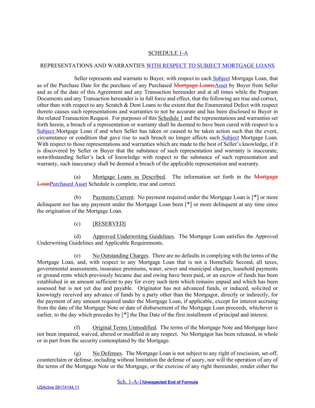 Sch. 1-A-1!Unexpected End of Formula USActive 59174144.11 SCHEDULE 1-A REPRESENTATIONS AND WARRANTIES WITH RESPECT TO SUBJECT MORTGAGE LOANS Seller represents and warrants to Buyer, with respect to each Subject Mortgage Loan, that as of the Purchase Date for the purchase of any Purchased Mortgage LoansAsset by Buyer from Seller and as of the date of this Agreement and any Transaction hereunder and at all times while the Program Documents and any Transaction hereunder is in full force and effect, that the following are true and correct, other than with respect to any Scratch & Dent Loans to the extent that the Enumerated Defect with respect thereto causes such representations and warranties to not be accurate and has been disclosed to Buyer in the related Transaction Request. For purposes of this Schedule 1 and the representations and warranties set forth herein, a breach of a representation or warranty shall be deemed to have been cured with respect to a Subject Mortgage Loan if and when Seller has taken or caused to be taken action such that the event, circumstance or condition that gave rise to such breach no longer affects such Subject Mortgage Loan. With respect to those representations and warranties which are made to the best of Seller’s knowledge, if it is discovered by Seller or Buyer that the substance of such representation and warranty is inaccurate, notwithstanding Seller’s lack of knowledge with respect to the substance of such representation and warranty, such inaccuracy shall be deemed a breach of the applicable representation and warranty. (a) Mortgage Loans as Described. The information set forth in the Mortgage LoanPurchased Asset Schedule is complete, true and correct. (b) Payments Current. No payment required under the Mortgage Loan is [*] or more delinquent nor has any payment under the Mortgage Loan been [*] or more delinquent at any time since the origination of the Mortgage Loan. (c) [RESERVED] (d) Approved Underwriting Guidelines. The Mortgage Loan satisfies the Approved Underwriting Guidelines and Applicable Requirements. (e) No Outstanding Charges. There are no defaults in complying with the terms of the Mortgage Loan, and, with respect to any Mortgage Loan that is not a HomeSafe Second, all taxes, governmental assessments, insurance premiums, water, sewer and municipal charges, leasehold payments or ground rents which previously became due and owing have been paid, or an escrow of funds has been established in an amount sufficient to pay for every such item which remains unpaid and which has been assessed but is not yet due and payable. Originator has not advanced funds, or induced, solicited or knowingly received any advance of funds by a party other than the Mortgagor, directly or indirectly, for the payment of any amount required under the Mortgage Loan, if applicable, except for interest accruing from the date of the Mortgage Note or date of disbursement of the Mortgage Loan proceeds, whichever is earlier, to the day which precedes by [*] the Due Date of the first installment of principal and interest. (f) Original Terms Unmodified. The terms of the Mortgage Note and Mortgage have not been impaired, waived, altered or modified in any respect. No Mortgagor has been released, in whole or in part from the security contemplated by the Mortgage. (g) No Defenses. The Mortgage Loan is not subject to any right of rescission, set-off, counterclaim or defense, including without limitation the defense of usury, nor will the operation of any of the terms of the Mortgage Note or the Mortgage, or the exercise of any right thereunder, render either the