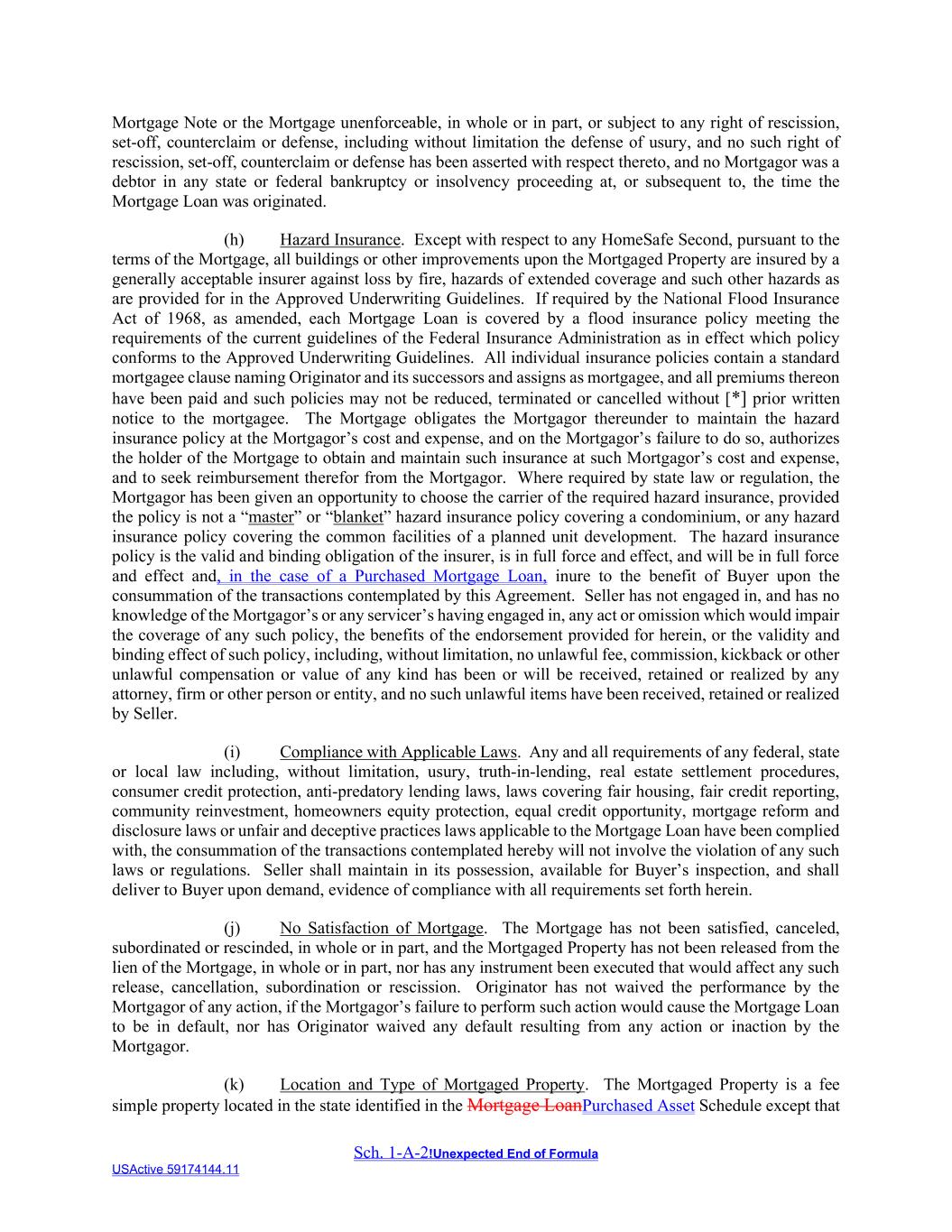 Sch. 1-A-2!Unexpected End of Formula USActive 59174144.11 Mortgage Note or the Mortgage unenforceable, in whole or in part, or subject to any right of rescission, set-off, counterclaim or defense, including without limitation the defense of usury, and no such right of rescission, set-off, counterclaim or defense has been asserted with respect thereto, and no Mortgagor was a debtor in any state or federal bankruptcy or insolvency proceeding at, or subsequent to, the time the Mortgage Loan was originated. (h) Hazard Insurance. Except with respect to any HomeSafe Second, pursuant to the terms of the Mortgage, all buildings or other improvements upon the Mortgaged Property are insured by a generally acceptable insurer against loss by fire, hazards of extended coverage and such other hazards as are provided for in the Approved Underwriting Guidelines. If required by the National Flood Insurance Act of 1968, as amended, each Mortgage Loan is covered by a flood insurance policy meeting the requirements of the current guidelines of the Federal Insurance Administration as in effect which policy conforms to the Approved Underwriting Guidelines. All individual insurance policies contain a standard mortgagee clause naming Originator and its successors and assigns as mortgagee, and all premiums thereon have been paid and such policies may not be reduced, terminated or cancelled without [*] prior written notice to the mortgagee. The Mortgage obligates the Mortgagor thereunder to maintain the hazard insurance policy at the Mortgagor’s cost and expense, and on the Mortgagor’s failure to do so, authorizes the holder of the Mortgage to obtain and maintain such insurance at such Mortgagor’s cost and expense, and to seek reimbursement therefor from the Mortgagor. Where required by state law or regulation, the Mortgagor has been given an opportunity to choose the carrier of the required hazard insurance, provided the policy is not a “master” or “blanket” hazard insurance policy covering a condominium, or any hazard insurance policy covering the common facilities of a planned unit development. The hazard insurance policy is the valid and binding obligation of the insurer, is in full force and effect, and will be in full force and effect and, in the case of a Purchased Mortgage Loan, inure to the benefit of Buyer upon the consummation of the transactions contemplated by this Agreement. Seller has not engaged in, and has no knowledge of the Mortgagor’s or any servicer’s having engaged in, any act or omission which would impair the coverage of any such policy, the benefits of the endorsement provided for herein, or the validity and binding effect of such policy, including, without limitation, no unlawful fee, commission, kickback or other unlawful compensation or value of any kind has been or will be received, retained or realized by any attorney, firm or other person or entity, and no such unlawful items have been received, retained or realized by Seller. (i) Compliance with Applicable Laws. Any and all requirements of any federal, state or local law including, without limitation, usury, truth-in-lending, real estate settlement procedures, consumer credit protection, anti-predatory lending laws, laws covering fair housing, fair credit reporting, community reinvestment, homeowners equity protection, equal credit opportunity, mortgage reform and disclosure laws or unfair and deceptive practices laws applicable to the Mortgage Loan have been complied with, the consummation of the transactions contemplated hereby will not involve the violation of any such laws or regulations. Seller shall maintain in its possession, available for Buyer’s inspection, and shall deliver to Buyer upon demand, evidence of compliance with all requirements set forth herein. (j) No Satisfaction of Mortgage. The Mortgage has not been satisfied, canceled, subordinated or rescinded, in whole or in part, and the Mortgaged Property has not been released from the lien of the Mortgage, in whole or in part, nor has any instrument been executed that would affect any such release, cancellation, subordination or rescission. Originator has not waived the performance by the Mortgagor of any action, if the Mortgagor’s failure to perform such action would cause the Mortgage Loan to be in default, nor has Originator waived any default resulting from any action or inaction by the Mortgagor. (k) Location and Type of Mortgaged Property. The Mortgaged Property is a fee simple property located in the state identified in the Mortgage LoanPurchased Asset Schedule except that