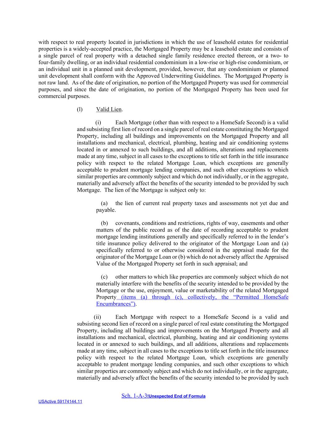 Sch. 1-A-3!Unexpected End of Formula USActive 59174144.11 with respect to real property located in jurisdictions in which the use of leasehold estates for residential properties is a widely-accepted practice, the Mortgaged Property may be a leasehold estate and consists of a single parcel of real property with a detached single family residence erected thereon, or a two- to four-family dwelling, or an individual residential condominium in a low-rise or high-rise condominium, or an individual unit in a planned unit development, provided, however, that any condominium or planned unit development shall conform with the Approved Underwriting Guidelines. The Mortgaged Property is not raw land. As of the date of origination, no portion of the Mortgaged Property was used for commercial purposes, and since the date of origination, no portion of the Mortgaged Property has been used for commercial purposes. (l) Valid Lien. (i) Each Mortgage (other than with respect to a HomeSafe Second) is a valid and subsisting first lien of record on a single parcel of real estate constituting the Mortgaged Property, including all buildings and improvements on the Mortgaged Property and all installations and mechanical, electrical, plumbing, heating and air conditioning systems located in or annexed to such buildings, and all additions, alterations and replacements made at any time, subject in all cases to the exceptions to title set forth in the title insurance policy with respect to the related Mortgage Loan, which exceptions are generally acceptable to prudent mortgage lending companies, and such other exceptions to which similar properties are commonly subject and which do not individually, or in the aggregate, materially and adversely affect the benefits of the security intended to be provided by such Mortgage. The lien of the Mortgage is subject only to: (a) the lien of current real property taxes and assessments not yet due and payable. (b) covenants, conditions and restrictions, rights of way, easements and other matters of the public record as of the date of recording acceptable to prudent mortgage lending institutions generally and specifically referred to in the lender’s title insurance policy delivered to the originator of the Mortgage Loan and (a) specifically referred to or otherwise considered in the appraisal made for the originator of the Mortgage Loan or (b) which do not adversely affect the Appraised Value of the Mortgaged Property set forth in such appraisal; and (c) other matters to which like properties are commonly subject which do not materially interfere with the benefits of the security intended to be provided by the Mortgage or the use, enjoyment, value or marketability of the related Mortgaged Property (items (a) through (c), collectively, the “Permitted HomeSafe Encumbrances”). (ii) Each Mortgage with respect to a HomeSafe Second is a valid and subsisting second lien of record on a single parcel of real estate constituting the Mortgaged Property, including all buildings and improvements on the Mortgaged Property and all installations and mechanical, electrical, plumbing, heating and air conditioning systems located in or annexed to such buildings, and all additions, alterations and replacements made at any time, subject in all cases to the exceptions to title set forth in the title insurance policy with respect to the related Mortgage Loan, which exceptions are generally acceptable to prudent mortgage lending companies, and such other exceptions to which similar properties are commonly subject and which do not individually, or in the aggregate, materially and adversely affect the benefits of the security intended to be provided by such