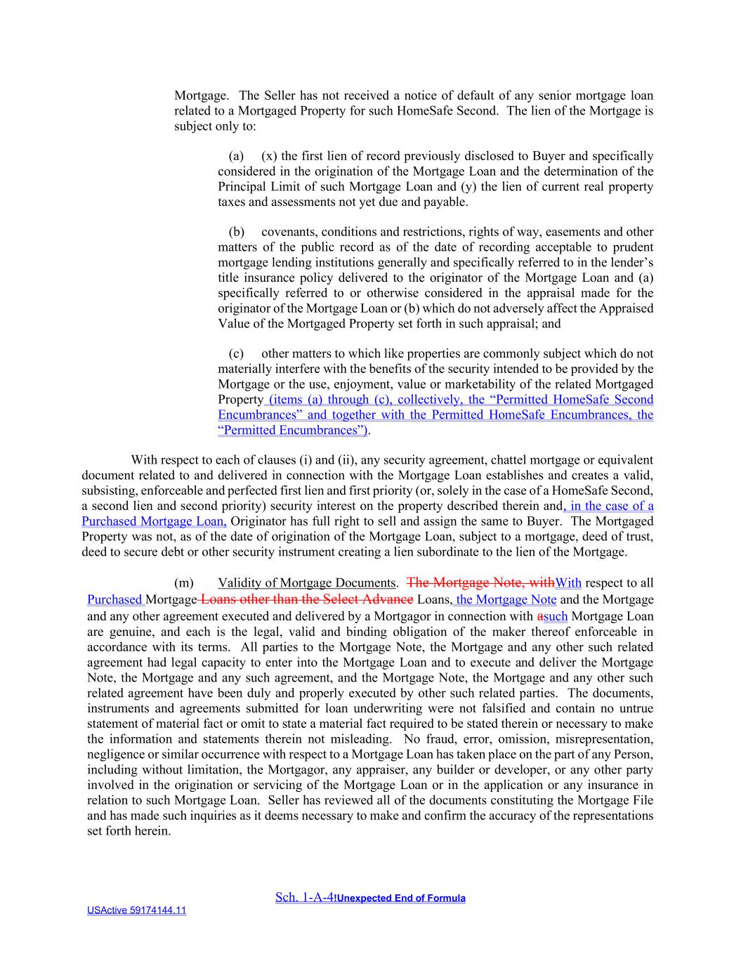 Sch. 1-A-4!Unexpected End of Formula USActive 59174144.11 Mortgage. The Seller has not received a notice of default of any senior mortgage loan related to a Mortgaged Property for such HomeSafe Second. The lien of the Mortgage is subject only to: (a) (x) the first lien of record previously disclosed to Buyer and specifically considered in the origination of the Mortgage Loan and the determination of the Principal Limit of such Mortgage Loan and (y) the lien of current real property taxes and assessments not yet due and payable. (b) covenants, conditions and restrictions, rights of way, easements and other matters of the public record as of the date of recording acceptable to prudent mortgage lending institutions generally and specifically referred to in the lender’s title insurance policy delivered to the originator of the Mortgage Loan and (a) specifically referred to or otherwise considered in the appraisal made for the originator of the Mortgage Loan or (b) which do not adversely affect the Appraised Value of the Mortgaged Property set forth in such appraisal; and (c) other matters to which like properties are commonly subject which do not materially interfere with the benefits of the security intended to be provided by the Mortgage or the use, enjoyment, value or marketability of the related Mortgaged Property (items (a) through (c), collectively, the “Permitted HomeSafe Second Encumbrances” and together with the Permitted HomeSafe Encumbrances, the “Permitted Encumbrances”). With respect to each of clauses (i) and (ii), any security agreement, chattel mortgage or equivalent document related to and delivered in connection with the Mortgage Loan establishes and creates a valid, subsisting, enforceable and perfected first lien and first priority (or, solely in the case of a HomeSafe Second, a second lien and second priority) security interest on the property described therein and, in the case of a Purchased Mortgage Loan, Originator has full right to sell and assign the same to Buyer. The Mortgaged Property was not, as of the date of origination of the Mortgage Loan, subject to a mortgage, deed of trust, deed to secure debt or other security instrument creating a lien subordinate to the lien of the Mortgage. (m) Validity of Mortgage Documents. The Mortgage Note, withWith respect to all Purchased Mortgage Loans other than the Select Advance Loans, the Mortgage Note and the Mortgage and any other agreement executed and delivered by a Mortgagor in connection with asuch Mortgage Loan are genuine, and each is the legal, valid and binding obligation of the maker thereof enforceable in accordance with its terms. All parties to the Mortgage Note, the Mortgage and any other such related agreement had legal capacity to enter into the Mortgage Loan and to execute and deliver the Mortgage Note, the Mortgage and any such agreement, and the Mortgage Note, the Mortgage and any other such related agreement have been duly and properly executed by other such related parties. The documents, instruments and agreements submitted for loan underwriting were not falsified and contain no untrue statement of material fact or omit to state a material fact required to be stated therein or necessary to make the information and statements therein not misleading. No fraud, error, omission, misrepresentation, negligence or similar occurrence with respect to a Mortgage Loan has taken place on the part of any Person, including without limitation, the Mortgagor, any appraiser, any builder or developer, or any other party involved in the origination or servicing of the Mortgage Loan or in the application or any insurance in relation to such Mortgage Loan. Seller has reviewed all of the documents constituting the Mortgage File and has made such inquiries as it deems necessary to make and confirm the accuracy of the representations set forth herein.