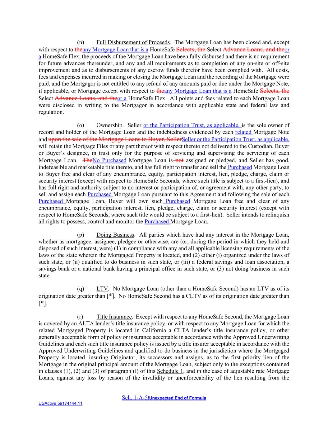 Sch. 1-A-5!Unexpected End of Formula USActive 59174144.11 (n) Full Disbursement of Proceeds. The Mortgage Loan has been closed and, except with respect to theany Mortgage Loan that is a HomeSafe Selects, the Select Advance Loans, and theor a HomeSafe Flex, the proceeds of the Mortgage Loan have been fully disbursed and there is no requirement for future advances thereunder, and any and all requirements as to completion of any on-site or off-site improvement and as to disbursements of any escrow funds therefor have been complied with. All costs, fees and expenses incurred in making or closing the Mortgage Loan and the recording of the Mortgage were paid, and the Mortgagor is not entitled to any refund of any amounts paid or due under the Mortgage Note, if applicable, or Mortgage except with respect to theany Mortgage Loan that is a HomeSafe Selects, the Select Advance Loans, and theor a HomeSafe Flex. All points and fees related to each Mortgage Loan were disclosed in writing to the Mortgagor in accordance with applicable state and federal law and regulation. (o) Ownership. Seller or the Participation Trust, as applicable, is the sole owner of record and holder of the Mortgage Loan and the indebtedness evidenced by each related Mortgage Note and upon the sale of the Mortgage Loans to Buyer, SellerSeller or the Participation Trust, as applicable, will retain the Mortgage Files or any part thereof with respect thereto not delivered to the Custodian, Buyer or Buyer’s designee, in trust only for the purpose of servicing and supervising the servicing of each Mortgage Loan. TheNo Purchased Mortgage Loan is not assigned or pledged, and Seller has good, indefeasible and marketable title thereto, and has full right to transfer and sell the Purchased Mortgage Loan to Buyer free and clear of any encumbrance, equity, participation interest, lien, pledge, charge, claim or security interest (except with respect to HomeSafe Seconds, where such title is subject to a first-lien), and has full right and authority subject to no interest or participation of, or agreement with, any other party, to sell and assign each Purchased Mortgage Loan pursuant to this Agreement and following the sale of each Purchased Mortgage Loan, Buyer will own such Purchased Mortgage Loan free and clear of any encumbrance, equity, participation interest, lien, pledge, charge, claim or security interest (except with respect to HomeSafe Seconds, where such title would be subject to a first-lien). Seller intends to relinquish all rights to possess, control and monitor the Purchased Mortgage Loan. (p) Doing Business. All parties which have had any interest in the Mortgage Loan, whether as mortgagee, assignee, pledgee or otherwise, are (or, during the period in which they held and disposed of such interest, were) (1) in compliance with any and all applicable licensing requirements of the laws of the state wherein the Mortgaged Property is located, and (2) either (i) organized under the laws of such state, or (ii) qualified to do business in such state, or (iii) a federal savings and loan association, a savings bank or a national bank having a principal office in such state, or (3) not doing business in such state. (q) LTV. No Mortgage Loan (other than a HomeSafe Second) has an LTV as of its origination date greater than [*]. No HomeSafe Second has a CLTV as of its origination date greater than [*]. (r) Title Insurance. Except with respect to any HomeSafe Second, the Mortgage Loan is covered by an ALTA lender’s title insurance policy, or with respect to any Mortgage Loan for which the related Mortgaged Property is located in California a CLTA lender’s title insurance policy, or other generally acceptable form of policy or insurance acceptable in accordance with the Approved Underwriting Guidelines and each such title insurance policy is issued by a title insurer acceptable in accordance with the Approved Underwriting Guidelines and qualified to do business in the jurisdiction where the Mortgaged Property is located, insuring Originator, its successors and assigns, as to the first priority lien of the Mortgage in the original principal amount of the Mortgage Loan, subject only to the exceptions contained in clauses (1), (2) and (3) of paragraph (l) of this Schedule 1, and in the case of adjustable rate Mortgage Loans, against any loss by reason of the invalidity or unenforceability of the lien resulting from the
