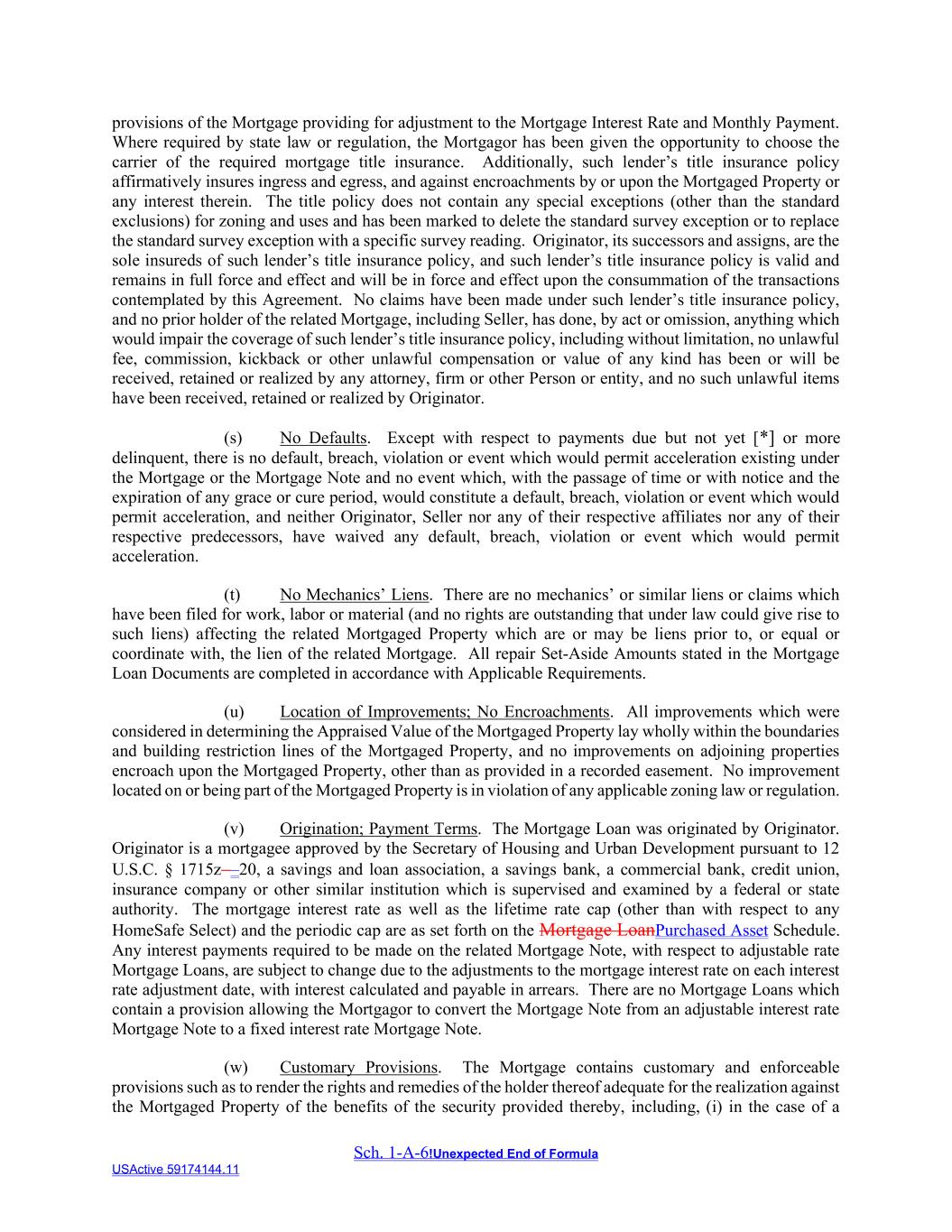 Sch. 1-A-6!Unexpected End of Formula USActive 59174144.11 provisions of the Mortgage providing for adjustment to the Mortgage Interest Rate and Monthly Payment. Where required by state law or regulation, the Mortgagor has been given the opportunity to choose the carrier of the required mortgage title insurance. Additionally, such lender’s title insurance policy affirmatively insures ingress and egress, and against encroachments by or upon the Mortgaged Property or any interest therein. The title policy does not contain any special exceptions (other than the standard exclusions) for zoning and uses and has been marked to delete the standard survey exception or to replace the standard survey exception with a specific survey reading. Originator, its successors and assigns, are the sole insureds of such lender’s title insurance policy, and such lender’s title insurance policy is valid and remains in full force and effect and will be in force and effect upon the consummation of the transactions contemplated by this Agreement. No claims have been made under such lender’s title insurance policy, and no prior holder of the related Mortgage, including Seller, has done, by act or omission, anything which would impair the coverage of such lender’s title insurance policy, including without limitation, no unlawful fee, commission, kickback or other unlawful compensation or value of any kind has been or will be received, retained or realized by any attorney, firm or other Person or entity, and no such unlawful items have been received, retained or realized by Originator. (s) No Defaults. Except with respect to payments due but not yet [*] or more delinquent, there is no default, breach, violation or event which would permit acceleration existing under the Mortgage or the Mortgage Note and no event which, with the passage of time or with notice and the expiration of any grace or cure period, would constitute a default, breach, violation or event which would permit acceleration, and neither Originator, Seller nor any of their respective affiliates nor any of their respective predecessors, have waived any default, breach, violation or event which would permit acceleration. (t) No Mechanics’ Liens. There are no mechanics’ or similar liens or claims which have been filed for work, labor or material (and no rights are outstanding that under law could give rise to such liens) affecting the related Mortgaged Property which are or may be liens prior to, or equal or coordinate with, the lien of the related Mortgage. All repair Set-Aside Amounts stated in the Mortgage Loan Documents are completed in accordance with Applicable Requirements. (u) Location of Improvements; No Encroachments. All improvements which were considered in determining the Appraised Value of the Mortgaged Property lay wholly within the boundaries and building restriction lines of the Mortgaged Property, and no improvements on adjoining properties encroach upon the Mortgaged Property, other than as provided in a recorded easement. No improvement located on or being part of the Mortgaged Property is in violation of any applicable zoning law or regulation. (v) Origination; Payment Terms. The Mortgage Loan was originated by Originator. Originator is a mortgagee approved by the Secretary of Housing and Urban Development pursuant to 12 U.S.C. § 1715z––20, a savings and loan association, a savings bank, a commercial bank, credit union, insurance company or other similar institution which is supervised and examined by a federal or state authority. The mortgage interest rate as well as the lifetime rate cap (other than with respect to any HomeSafe Select) and the periodic cap are as set forth on the Mortgage LoanPurchased Asset Schedule. Any interest payments required to be made on the related Mortgage Note, with respect to adjustable rate Mortgage Loans, are subject to change due to the adjustments to the mortgage interest rate on each interest rate adjustment date, with interest calculated and payable in arrears. There are no Mortgage Loans which contain a provision allowing the Mortgagor to convert the Mortgage Note from an adjustable interest rate Mortgage Note to a fixed interest rate Mortgage Note. (w) Customary Provisions. The Mortgage contains customary and enforceable provisions such as to render the rights and remedies of the holder thereof adequate for the realization against the Mortgaged Property of the benefits of the security provided thereby, including, (i) in the case of a