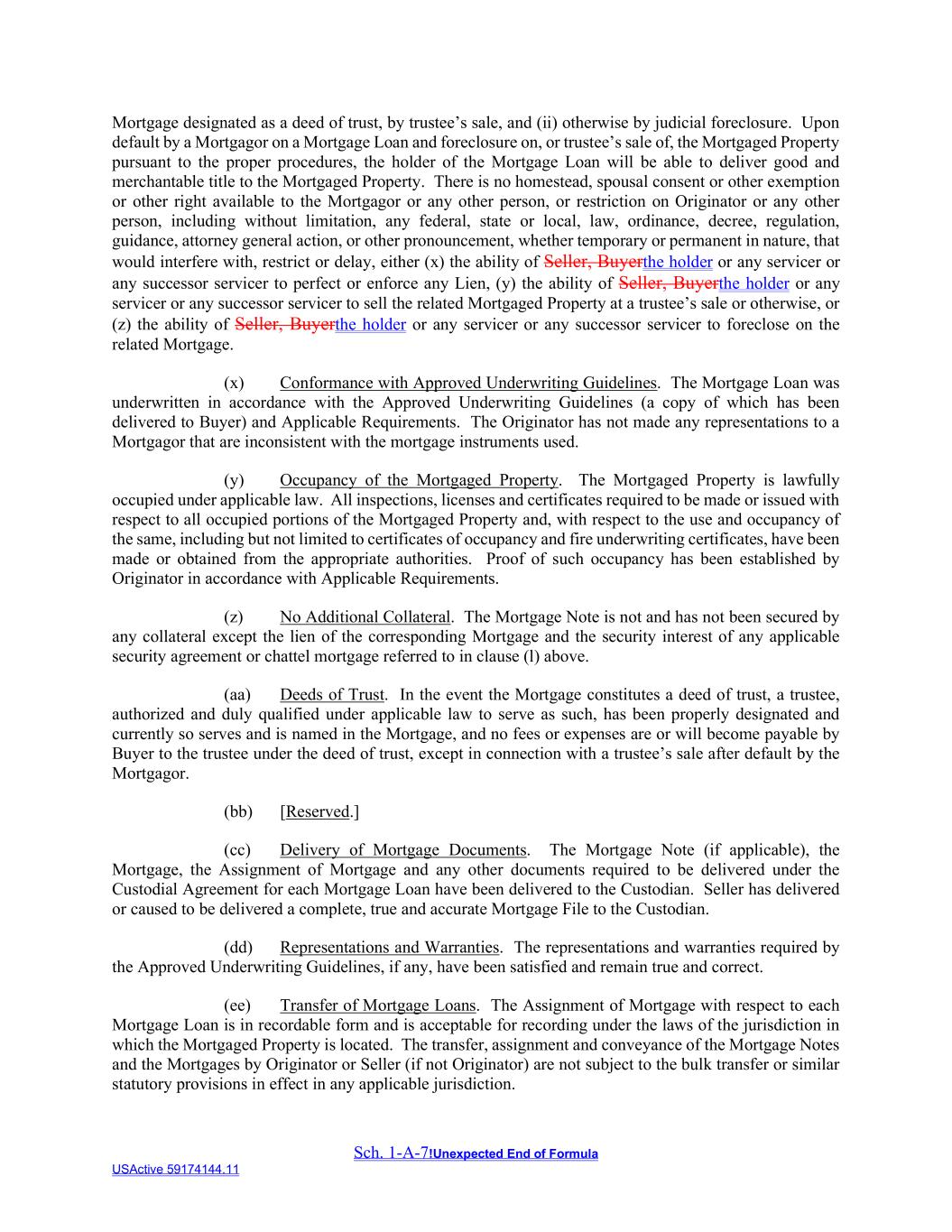 Sch. 1-A-7!Unexpected End of Formula USActive 59174144.11 Mortgage designated as a deed of trust, by trustee’s sale, and (ii) otherwise by judicial foreclosure. Upon default by a Mortgagor on a Mortgage Loan and foreclosure on, or trustee’s sale of, the Mortgaged Property pursuant to the proper procedures, the holder of the Mortgage Loan will be able to deliver good and merchantable title to the Mortgaged Property. There is no homestead, spousal consent or other exemption or other right available to the Mortgagor or any other person, or restriction on Originator or any other person, including without limitation, any federal, state or local, law, ordinance, decree, regulation, guidance, attorney general action, or other pronouncement, whether temporary or permanent in nature, that would interfere with, restrict or delay, either (x) the ability of Seller, Buyerthe holder or any servicer or any successor servicer to perfect or enforce any Lien, (y) the ability of Seller, Buyerthe holder or any servicer or any successor servicer to sell the related Mortgaged Property at a trustee’s sale or otherwise, or (z) the ability of Seller, Buyerthe holder or any servicer or any successor servicer to foreclose on the related Mortgage. (x) Conformance with Approved Underwriting Guidelines. The Mortgage Loan was underwritten in accordance with the Approved Underwriting Guidelines (a copy of which has been delivered to Buyer) and Applicable Requirements. The Originator has not made any representations to a Mortgagor that are inconsistent with the mortgage instruments used. (y) Occupancy of the Mortgaged Property. The Mortgaged Property is lawfully occupied under applicable law. All inspections, licenses and certificates required to be made or issued with respect to all occupied portions of the Mortgaged Property and, with respect to the use and occupancy of the same, including but not limited to certificates of occupancy and fire underwriting certificates, have been made or obtained from the appropriate authorities. Proof of such occupancy has been established by Originator in accordance with Applicable Requirements. (z) No Additional Collateral. The Mortgage Note is not and has not been secured by any collateral except the lien of the corresponding Mortgage and the security interest of any applicable security agreement or chattel mortgage referred to in clause (l) above. (aa) Deeds of Trust. In the event the Mortgage constitutes a deed of trust, a trustee, authorized and duly qualified under applicable law to serve as such, has been properly designated and currently so serves and is named in the Mortgage, and no fees or expenses are or will become payable by Buyer to the trustee under the deed of trust, except in connection with a trustee’s sale after default by the Mortgagor. (bb) [Reserved.] (cc) Delivery of Mortgage Documents. The Mortgage Note (if applicable), the Mortgage, the Assignment of Mortgage and any other documents required to be delivered under the Custodial Agreement for each Mortgage Loan have been delivered to the Custodian. Seller has delivered or caused to be delivered a complete, true and accurate Mortgage File to the Custodian. (dd) Representations and Warranties. The representations and warranties required by the Approved Underwriting Guidelines, if any, have been satisfied and remain true and correct. (ee) Transfer of Mortgage Loans. The Assignment of Mortgage with respect to each Mortgage Loan is in recordable form and is acceptable for recording under the laws of the jurisdiction in which the Mortgaged Property is located. The transfer, assignment and conveyance of the Mortgage Notes and the Mortgages by Originator or Seller (if not Originator) are not subject to the bulk transfer or similar statutory provisions in effect in any applicable jurisdiction.