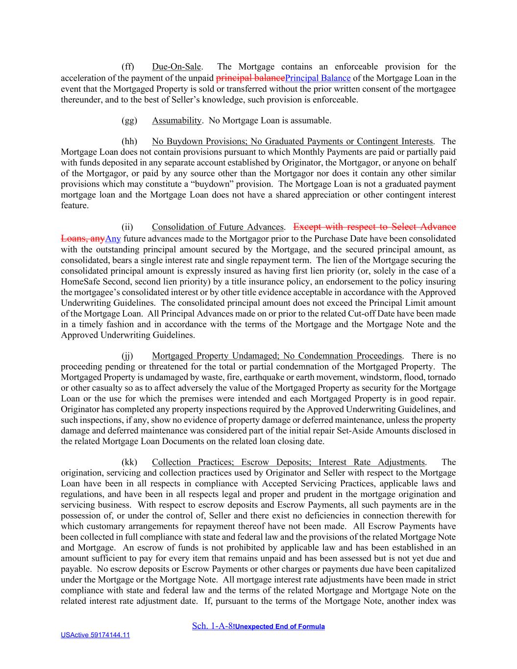 Sch. 1-A-8!Unexpected End of Formula USActive 59174144.11 (ff) Due-On-Sale. The Mortgage contains an enforceable provision for the acceleration of the payment of the unpaid principal balancePrincipal Balance of the Mortgage Loan in the event that the Mortgaged Property is sold or transferred without the prior written consent of the mortgagee thereunder, and to the best of Seller’s knowledge, such provision is enforceable. (gg) Assumability. No Mortgage Loan is assumable. (hh) No Buydown Provisions; No Graduated Payments or Contingent Interests. The Mortgage Loan does not contain provisions pursuant to which Monthly Payments are paid or partially paid with funds deposited in any separate account established by Originator, the Mortgagor, or anyone on behalf of the Mortgagor, or paid by any source other than the Mortgagor nor does it contain any other similar provisions which may constitute a “buydown” provision. The Mortgage Loan is not a graduated payment mortgage loan and the Mortgage Loan does not have a shared appreciation or other contingent interest feature. (ii) Consolidation of Future Advances. Except with respect to Select Advance Loans, anyAny future advances made to the Mortgagor prior to the Purchase Date have been consolidated with the outstanding principal amount secured by the Mortgage, and the secured principal amount, as consolidated, bears a single interest rate and single repayment term. The lien of the Mortgage securing the consolidated principal amount is expressly insured as having first lien priority (or, solely in the case of a HomeSafe Second, second lien priority) by a title insurance policy, an endorsement to the policy insuring the mortgagee’s consolidated interest or by other title evidence acceptable in accordance with the Approved Underwriting Guidelines. The consolidated principal amount does not exceed the Principal Limit amount of the Mortgage Loan. All Principal Advances made on or prior to the related Cut-off Date have been made in a timely fashion and in accordance with the terms of the Mortgage and the Mortgage Note and the Approved Underwriting Guidelines. (jj) Mortgaged Property Undamaged; No Condemnation Proceedings. There is no proceeding pending or threatened for the total or partial condemnation of the Mortgaged Property. The Mortgaged Property is undamaged by waste, fire, earthquake or earth movement, windstorm, flood, tornado or other casualty so as to affect adversely the value of the Mortgaged Property as security for the Mortgage Loan or the use for which the premises were intended and each Mortgaged Property is in good repair. Originator has completed any property inspections required by the Approved Underwriting Guidelines, and such inspections, if any, show no evidence of property damage or deferred maintenance, unless the property damage and deferred maintenance was considered part of the initial repair Set-Aside Amounts disclosed in the related Mortgage Loan Documents on the related loan closing date. (kk) Collection Practices; Escrow Deposits; Interest Rate Adjustments. The origination, servicing and collection practices used by Originator and Seller with respect to the Mortgage Loan have been in all respects in compliance with Accepted Servicing Practices, applicable laws and regulations, and have been in all respects legal and proper and prudent in the mortgage origination and servicing business. With respect to escrow deposits and Escrow Payments, all such payments are in the possession of, or under the control of, Seller and there exist no deficiencies in connection therewith for which customary arrangements for repayment thereof have not been made. All Escrow Payments have been collected in full compliance with state and federal law and the provisions of the related Mortgage Note and Mortgage. An escrow of funds is not prohibited by applicable law and has been established in an amount sufficient to pay for every item that remains unpaid and has been assessed but is not yet due and payable. No escrow deposits or Escrow Payments or other charges or payments due have been capitalized under the Mortgage or the Mortgage Note. All mortgage interest rate adjustments have been made in strict compliance with state and federal law and the terms of the related Mortgage and Mortgage Note on the related interest rate adjustment date. If, pursuant to the terms of the Mortgage Note, another index was