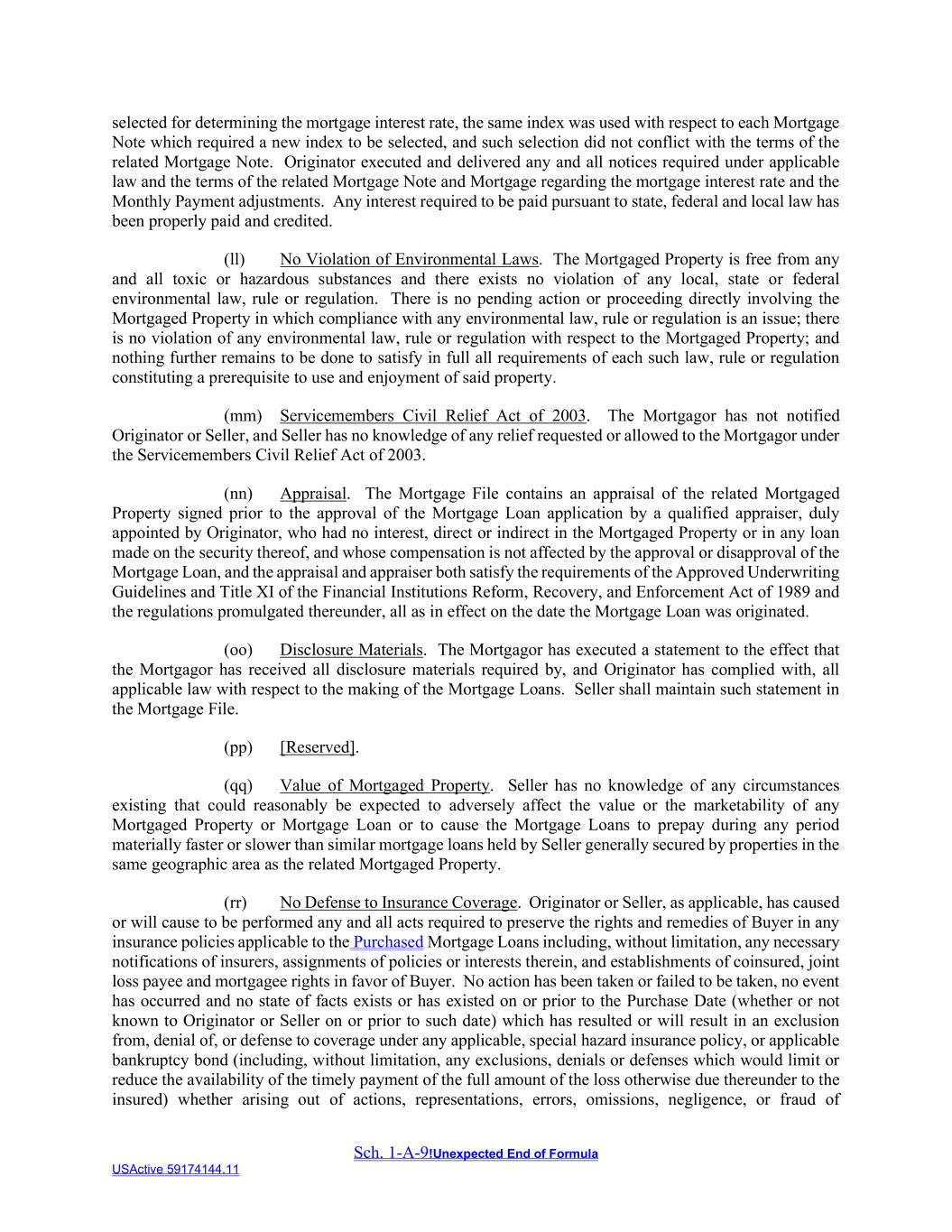 Sch. 1-A-9!Unexpected End of Formula USActive 59174144.11 selected for determining the mortgage interest rate, the same index was used with respect to each Mortgage Note which required a new index to be selected, and such selection did not conflict with the terms of the related Mortgage Note. Originator executed and delivered any and all notices required under applicable law and the terms of the related Mortgage Note and Mortgage regarding the mortgage interest rate and the Monthly Payment adjustments. Any interest required to be paid pursuant to state, federal and local law has been properly paid and credited. (ll) No Violation of Environmental Laws. The Mortgaged Property is free from any and all toxic or hazardous substances and there exists no violation of any local, state or federal environmental law, rule or regulation. There is no pending action or proceeding directly involving the Mortgaged Property in which compliance with any environmental law, rule or regulation is an issue; there is no violation of any environmental law, rule or regulation with respect to the Mortgaged Property; and nothing further remains to be done to satisfy in full all requirements of each such law, rule or regulation constituting a prerequisite to use and enjoyment of said property. (mm) Servicemembers Civil Relief Act of 2003. The Mortgagor has not notified Originator or Seller, and Seller has no knowledge of any relief requested or allowed to the Mortgagor under the Servicemembers Civil Relief Act of 2003. (nn) Appraisal. The Mortgage File contains an appraisal of the related Mortgaged Property signed prior to the approval of the Mortgage Loan application by a qualified appraiser, duly appointed by Originator, who had no interest, direct or indirect in the Mortgaged Property or in any loan made on the security thereof, and whose compensation is not affected by the approval or disapproval of the Mortgage Loan, and the appraisal and appraiser both satisfy the requirements of the Approved Underwriting Guidelines and Title XI of the Financial Institutions Reform, Recovery, and Enforcement Act of 1989 and the regulations promulgated thereunder, all as in effect on the date the Mortgage Loan was originated. (oo) Disclosure Materials. The Mortgagor has executed a statement to the effect that the Mortgagor has received all disclosure materials required by, and Originator has complied with, all applicable law with respect to the making of the Mortgage Loans. Seller shall maintain such statement in the Mortgage File. (pp) [Reserved]. (qq) Value of Mortgaged Property. Seller has no knowledge of any circumstances existing that could reasonably be expected to adversely affect the value or the marketability of any Mortgaged Property or Mortgage Loan or to cause the Mortgage Loans to prepay during any period materially faster or slower than similar mortgage loans held by Seller generally secured by properties in the same geographic area as the related Mortgaged Property. (rr) No Defense to Insurance Coverage. Originator or Seller, as applicable, has caused or will cause to be performed any and all acts required to preserve the rights and remedies of Buyer in any insurance policies applicable to the Purchased Mortgage Loans including, without limitation, any necessary notifications of insurers, assignments of policies or interests therein, and establishments of coinsured, joint loss payee and mortgagee rights in favor of Buyer. No action has been taken or failed to be taken, no event has occurred and no state of facts exists or has existed on or prior to the Purchase Date (whether or not known to Originator or Seller on or prior to such date) which has resulted or will result in an exclusion from, denial of, or defense to coverage under any applicable, special hazard insurance policy, or applicable bankruptcy bond (including, without limitation, any exclusions, denials or defenses which would limit or reduce the availability of the timely payment of the full amount of the loss otherwise due thereunder to the insured) whether arising out of actions, representations, errors, omissions, negligence, or fraud of
