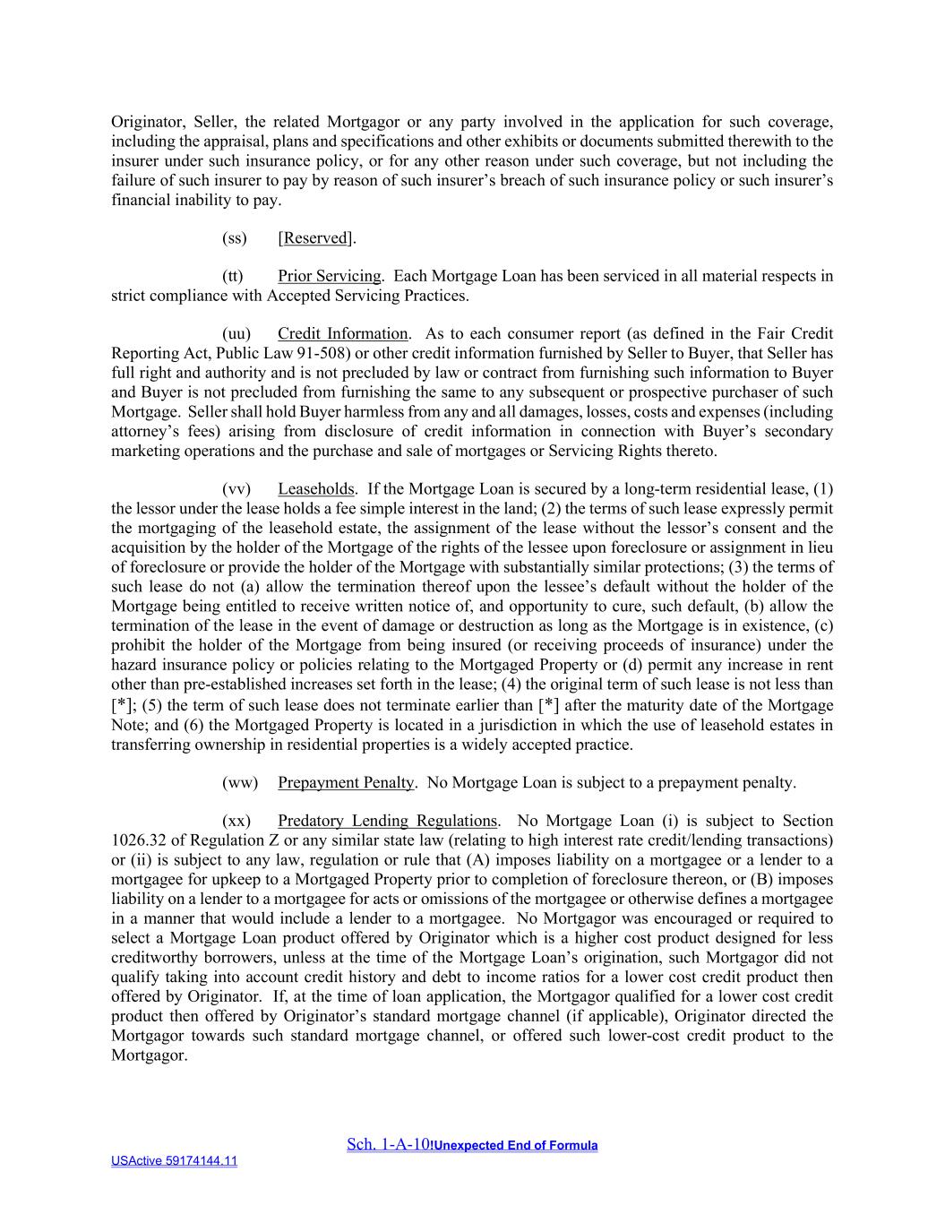 Sch. 1-A-10!Unexpected End of Formula USActive 59174144.11 Originator, Seller, the related Mortgagor or any party involved in the application for such coverage, including the appraisal, plans and specifications and other exhibits or documents submitted therewith to the insurer under such insurance policy, or for any other reason under such coverage, but not including the failure of such insurer to pay by reason of such insurer’s breach of such insurance policy or such insurer’s financial inability to pay. (ss) [Reserved]. (tt) Prior Servicing. Each Mortgage Loan has been serviced in all material respects in strict compliance with Accepted Servicing Practices. (uu) Credit Information. As to each consumer report (as defined in the Fair Credit Reporting Act, Public Law 91-508) or other credit information furnished by Seller to Buyer, that Seller has full right and authority and is not precluded by law or contract from furnishing such information to Buyer and Buyer is not precluded from furnishing the same to any subsequent or prospective purchaser of such Mortgage. Seller shall hold Buyer harmless from any and all damages, losses, costs and expenses (including attorney’s fees) arising from disclosure of credit information in connection with Buyer’s secondary marketing operations and the purchase and sale of mortgages or Servicing Rights thereto. (vv) Leaseholds. If the Mortgage Loan is secured by a long-term residential lease, (1) the lessor under the lease holds a fee simple interest in the land; (2) the terms of such lease expressly permit the mortgaging of the leasehold estate, the assignment of the lease without the lessor’s consent and the acquisition by the holder of the Mortgage of the rights of the lessee upon foreclosure or assignment in lieu of foreclosure or provide the holder of the Mortgage with substantially similar protections; (3) the terms of such lease do not (a) allow the termination thereof upon the lessee’s default without the holder of the Mortgage being entitled to receive written notice of, and opportunity to cure, such default, (b) allow the termination of the lease in the event of damage or destruction as long as the Mortgage is in existence, (c) prohibit the holder of the Mortgage from being insured (or receiving proceeds of insurance) under the hazard insurance policy or policies relating to the Mortgaged Property or (d) permit any increase in rent other than pre-established increases set forth in the lease; (4) the original term of such lease is not less than [*]; (5) the term of such lease does not terminate earlier than [*] after the maturity date of the Mortgage Note; and (6) the Mortgaged Property is located in a jurisdiction in which the use of leasehold estates in transferring ownership in residential properties is a widely accepted practice. (ww) Prepayment Penalty. No Mortgage Loan is subject to a prepayment penalty. (xx) Predatory Lending Regulations. No Mortgage Loan (i) is subject to Section 1026.32 of Regulation Z or any similar state law (relating to high interest rate credit/lending transactions) or (ii) is subject to any law, regulation or rule that (A) imposes liability on a mortgagee or a lender to a mortgagee for upkeep to a Mortgaged Property prior to completion of foreclosure thereon, or (B) imposes liability on a lender to a mortgagee for acts or omissions of the mortgagee or otherwise defines a mortgagee in a manner that would include a lender to a mortgagee. No Mortgagor was encouraged or required to select a Mortgage Loan product offered by Originator which is a higher cost product designed for less creditworthy borrowers, unless at the time of the Mortgage Loan’s origination, such Mortgagor did not qualify taking into account credit history and debt to income ratios for a lower cost credit product then offered by Originator. If, at the time of loan application, the Mortgagor qualified for a lower cost credit product then offered by Originator’s standard mortgage channel (if applicable), Originator directed the Mortgagor towards such standard mortgage channel, or offered such lower-cost credit product to the Mortgagor.