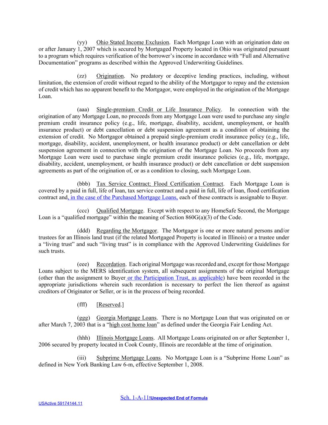 Sch. 1-A-11!Unexpected End of Formula USActive 59174144.11 (yy) Ohio Stated Income Exclusion. Each Mortgage Loan with an origination date on or after January 1, 2007 which is secured by Mortgaged Property located in Ohio was originated pursuant to a program which requires verification of the borrower’s income in accordance with “Full and Alternative Documentation” programs as described within the Approved Underwriting Guidelines. (zz) Origination. No predatory or deceptive lending practices, including, without limitation, the extension of credit without regard to the ability of the Mortgagor to repay and the extension of credit which has no apparent benefit to the Mortgagor, were employed in the origination of the Mortgage Loan. (aaa) Single-premium Credit or Life Insurance Policy. In connection with the origination of any Mortgage Loan, no proceeds from any Mortgage Loan were used to purchase any single premium credit insurance policy (e.g., life, mortgage, disability, accident, unemployment, or health insurance product) or debt cancellation or debt suspension agreement as a condition of obtaining the extension of credit. No Mortgagor obtained a prepaid single-premium credit insurance policy (e.g., life, mortgage, disability, accident, unemployment, or health insurance product) or debt cancellation or debt suspension agreement in connection with the origination of the Mortgage Loan. No proceeds from any Mortgage Loan were used to purchase single premium credit insurance policies (e.g., life, mortgage, disability, accident, unemployment, or health insurance product) or debt cancellation or debt suspension agreements as part of the origination of, or as a condition to closing, such Mortgage Loan. (bbb) Tax Service Contract; Flood Certification Contract. Each Mortgage Loan is covered by a paid in full, life of loan, tax service contract and a paid in full, life of loan, flood certification contract and, in the case of the Purchased Mortgage Loans, each of these contracts is assignable to Buyer. (ccc) Qualified Mortgage. Except with respect to any HomeSafe Second, the Mortgage Loan is a “qualified mortgage” within the meaning of Section 860G(a)(3) of the Code. (ddd) Regarding the Mortgagor. The Mortgagor is one or more natural persons and/or trustees for an Illinois land trust (if the related Mortgaged Property is located in Illinois) or a trustee under a “living trust” and such “living trust” is in compliance with the Approved Underwriting Guidelines for such trusts. (eee) Recordation. Each original Mortgage was recorded and, except for those Mortgage Loans subject to the MERS identification system, all subsequent assignments of the original Mortgage (other than the assignment to Buyer or the Participation Trust, as applicable) have been recorded in the appropriate jurisdictions wherein such recordation is necessary to perfect the lien thereof as against creditors of Originator or Seller, or is in the process of being recorded. (fff) [Reserved.] (ggg) Georgia Mortgage Loans. There is no Mortgage Loan that was originated on or after March 7, 2003 that is a “high cost home loan” as defined under the Georgia Fair Lending Act. (hhh) Illinois Mortgage Loans. All Mortgage Loans originated on or after September 1, 2006 secured by property located in Cook County, Illinois are recordable at the time of origination. (iii) Subprime Mortgage Loans. No Mortgage Loan is a “Subprime Home Loan” as defined in New York Banking Law 6-m, effective September 1, 2008.