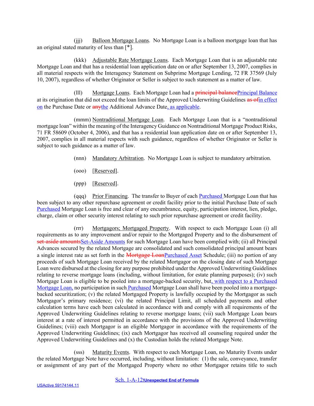 Sch. 1-A-12!Unexpected End of Formula USActive 59174144.11 (jjj) Balloon Mortgage Loans. No Mortgage Loan is a balloon mortgage loan that has an original stated maturity of less than [*]. (kkk) Adjustable Rate Mortgage Loans. Each Mortgage Loan that is an adjustable rate Mortgage Loan and that has a residential loan application date on or after September 13, 2007, complies in all material respects with the Interagency Statement on Subprime Mortgage Lending, 72 FR 37569 (July 10, 2007), regardless of whether Originator or Seller is subject to such statement as a matter of law. (lll) Mortgage Loans. Each Mortgage Loan had a principal balancePrincipal Balance at its origination that did not exceed the loan limits of the Approved Underwriting Guidelines as ofin effect on the Purchase Date or anythe Additional Advance Date, as applicable. (mmm) Nontraditional Mortgage Loan. Each Mortgage Loan that is a “nontraditional mortgage loan” within the meaning of the Interagency Guidance on Nontraditional Mortgage Product Risks, 71 FR 58609 (October 4, 2006), and that has a residential loan application date on or after September 13, 2007, complies in all material respects with such guidance, regardless of whether Originator or Seller is subject to such guidance as a matter of law. (nnn) Mandatory Arbitration. No Mortgage Loan is subject to mandatory arbitration. (ooo) [Reserved]. (ppp) [Reserved]. (qqq) Prior Financing. The transfer to Buyer of each Purchased Mortgage Loan that has been subject to any other repurchase agreement or credit facility prior to the initial Purchase Date of such Purchased Mortgage Loan is free and clear of any encumbrance, equity, participation interest, lien, pledge, charge, claim or other security interest relating to such prior repurchase agreement or credit facility. (rrr) Mortgagors; Mortgaged Property. With respect to each Mortgage Loan (i) all requirements as to any improvement and/or repair to the Mortgaged Property and to the disbursement of set-aside amountsSet-Aside Amounts for such Mortgage Loan have been complied with; (ii) all Principal Advances secured by the related Mortgage are consolidated and such consolidated principal amount bears a single interest rate as set forth in the Mortgage LoanPurchased Asset Schedule; (iii) no portion of any proceeds of such Mortgage Loan received by the related Mortgagor on the closing date of such Mortgage Loan were disbursed at the closing for any purpose prohibited under the Approved Underwriting Guidelines relating to reverse mortgage loans (including, without limitation, for estate planning purposes); (iv) such Mortgage Loan is eligible to be pooled into a mortgage-backed security, but, with respect to a Purchased Mortgage Loan, no participation in such Purchased Mortgage Loan shall have been pooled into a mortgage- backed securitization; (v) the related Mortgaged Property is lawfully occupied by the Mortgagor as such Mortgagor’s primary residence; (vi) the related Principal Limit, all scheduled payments and other calculation terms have each been calculated in accordance with and comply with all requirements of the Approved Underwriting Guidelines relating to reverse mortgage loans; (vii) such Mortgage Loan bears interest at a rate of interest permitted in accordance with the provisions of the Approved Underwriting Guidelines; (viii) each Mortgagor is an eligible Mortgagor in accordance with the requirements of the Approved Underwriting Guidelines; (ix) each Mortgagor has received all counseling required under the Approved Underwriting Guidelines and (x) the Custodian holds the related Mortgage Note. (sss) Maturity Events. With respect to each Mortgage Loan, no Maturity Events under the related Mortgage Note have occurred, including, without limitation: (1) the sale, conveyance, transfer or assignment of any part of the Mortgaged Property where no other Mortgagor retains title to such