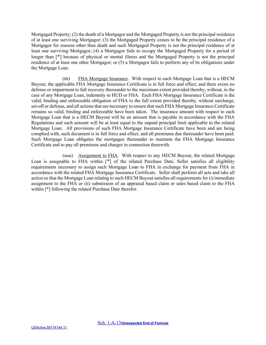 Sch. 1-A-13!Unexpected End of Formula USActive 59174144.11 Mortgaged Property; (2) the death of a Mortgagor and the Mortgaged Property is not the principal residence of at least one surviving Mortgagor; (3) the Mortgaged Property ceases to be the principal residence of a Mortgagor for reasons other than death and such Mortgaged Property is not the principal residence of at least one surviving Mortgagor; (4) a Mortgagor fails to occupy the Mortgaged Property for a period of longer than [*] because of physical or mental illness and the Mortgaged Property is not the principal residence of at least one other Mortgagor; or (5) a Mortgagor fails to perform any of its obligations under the Mortgage Loan. (ttt) FHA Mortgage Insurance. With respect to each Mortgage Loan that is a HECM Buyout, the applicable FHA Mortgage Insurance Certificate is in full force and effect, and there exists no defense or impairment to full recovery thereunder to the maximum extent provided thereby, without, in the case of any Mortgage Loan, indemnity to HUD or FHA. Each FHA Mortgage Insurance Certificate is the valid, binding and enforceable obligation of FHA to the full extent provided thereby, without surcharge, set-off or defense, and all actions that are necessary to ensure that such FHA Mortgage Insurance Certificate remains so valid, binding and enforceable have been taken. The insurance amount with respect to each Mortgage Loan that is a HECM Buyout will be an amount that is payable in accordance with the FHA Regulations and such amount will be at least equal to the unpaid principal limit applicable to the related Mortgage Loan. All provisions of such FHA Mortgage Insurance Certificate have been and are being complied with, such document is in full force and effect, and all premiums due thereunder have been paid. Such Mortgage Loan obligates the mortgagee thereunder to maintain the FHA Mortgage Insurance Certificate and to pay all premiums and charges in connection therewith. (uuu) Assignment to FHA. With respect to any HECM Buyout, the related Mortgage Loan is assignable to FHA within [*] of the related Purchase Date. Seller satisfies all eligibility requirements necessary to assign such Mortgage Loan to FHA in exchange for payment from FHA in accordance with the related FHA Mortgage Insurance Certificate. Seller shall perform all acts and take all action so that the Mortgage Loan relating to such HECM Buyout satisfies all requirements for (i) immediate assignment to the FHA or (ii) submission of an appraisal based claim or sales based claim to the FHA within [*] following the related Purchase Date therefor.