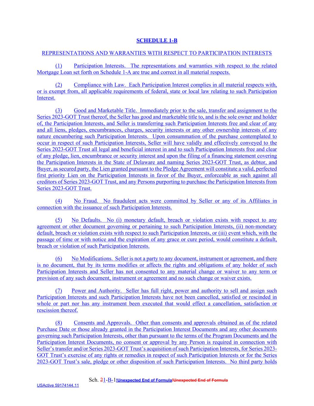 Sch. 21-B-1!Unexpected End of Formula!Unexpected End of Formula USActive 59174144.11 SCHEDULE 1-B REPRESENTATIONS AND WARRANTIES WITH RESPECT TO PARTICIPATION INTERESTS (1) Participation Interests. The representations and warranties with respect to the related Mortgage Loan set forth on Schedule 1-A are true and correct in all material respects. (2) Compliance with Law. Each Participation Interest complies in all material respects with, or is exempt from, all applicable requirements of federal, state or local law relating to such Participation Interest. (3) Good and Marketable Title. Immediately prior to the sale, transfer and assignment to the Series 2023-GOT Trust thereof, the Seller has good and marketable title to, and is the sole owner and holder of, the Participation Interests, and Seller is transferring such Participation Interests free and clear of any and all liens, pledges, encumbrances, charges, security interests or any other ownership interests of any nature encumbering such Participation Interests. Upon consummation of the purchase contemplated to occur in respect of such Participation Interests, Seller will have validly and effectively conveyed to the Series 2023-GOT Trust all legal and beneficial interest in and to such Participation Interests free and clear of any pledge, lien, encumbrance or security interest and upon the filing of a financing statement covering the Participation Interests in the State of Delaware and naming Series 2023-GOT Trust, as debtor, and Buyer, as secured party, the Lien granted pursuant to the Pledge Agreement will constitute a valid, perfected first priority Lien on the Participation Interests in favor of the Buyer, enforceable as such against all creditors of Series 2023-GOT Trust, and any Persons purporting to purchase the Participation Interests from Series 2023-GOT Trust. (4) No Fraud. No fraudulent acts were committed by Seller or any of its Affiliates in connection with the issuance of such Participation Interests. (5) No Defaults. No (i) monetary default, breach or violation exists with respect to any agreement or other document governing or pertaining to such Participation Interests, (ii) non-monetary default, breach or violation exists with respect to such Participation Interests, or (iii) event which, with the passage of time or with notice and the expiration of any grace or cure period, would constitute a default, breach or violation of such Participation Interests. (6) No Modifications. Seller is not a party to any document, instrument or agreement, and there is no document, that by its terms modifies or affects the rights and obligations of any holder of such Participation Interests and Seller has not consented to any material change or waiver to any term or provision of any such document, instrument or agreement and no such change or waiver exists. (7) Power and Authority. Seller has full right, power and authority to sell and assign such Participation Interests and such Participation Interests have not been cancelled, satisfied or rescinded in whole or part nor has any instrument been executed that would effect a cancellation, satisfaction or rescission thereof. (8) Consents and Approvals. Other than consents and approvals obtained as of the related Purchase Date or those already granted in the Participation Interest Documents and any other documents governing such Participation Interests, other than pursuant to the terms of the Program Documents and the Participation Interest Documents, no consent or approval by any Person is required in connection with Seller’s transfer and/or Series 2023-GOT Trust’s acquisition of such Participation Interests, for Series 2023- GOT Trust’s exercise of any rights or remedies in respect of such Participation Interests or for the Series 2023-GOT Trust’s sale, pledge or other disposition of such Participation Interests. No third party holds
