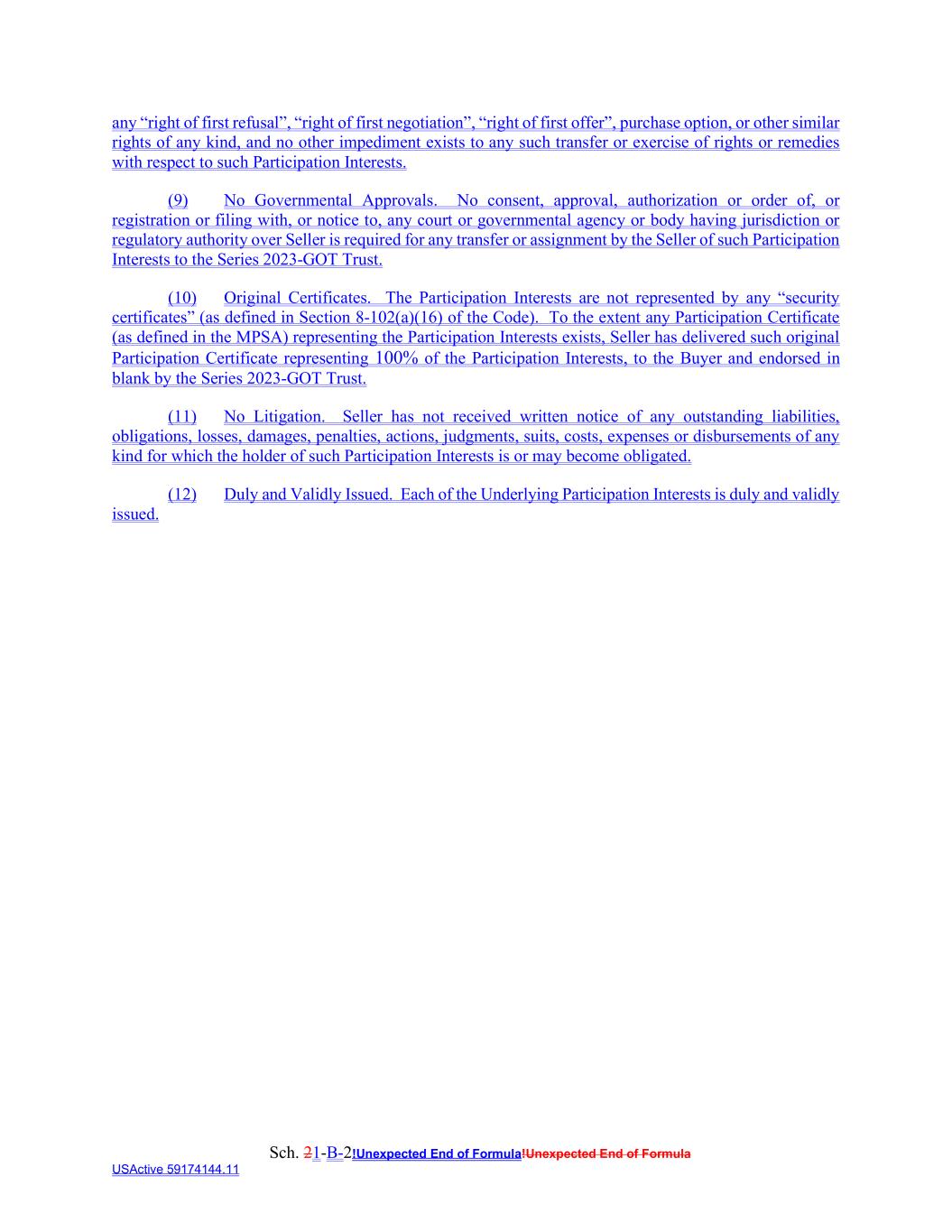 Sch. 21-B-2!Unexpected End of Formula!Unexpected End of Formula USActive 59174144.11 any “right of first refusal”, “right of first negotiation”, “right of first offer”, purchase option, or other similar rights of any kind, and no other impediment exists to any such transfer or exercise of rights or remedies with respect to such Participation Interests. (9) No Governmental Approvals. No consent, approval, authorization or order of, or registration or filing with, or notice to, any court or governmental agency or body having jurisdiction or regulatory authority over Seller is required for any transfer or assignment by the Seller of such Participation Interests to the Series 2023-GOT Trust. (10) Original Certificates. The Participation Interests are not represented by any “security certificates” (as defined in Section 8-102(a)(16) of the Code). To the extent any Participation Certificate (as defined in the MPSA) representing the Participation Interests exists, Seller has delivered such original Participation Certificate representing 100% of the Participation Interests, to the Buyer and endorsed in blank by the Series 2023-GOT Trust. (11) No Litigation. Seller has not received written notice of any outstanding liabilities, obligations, losses, damages, penalties, actions, judgments, suits, costs, expenses or disbursements of any kind for which the holder of such Participation Interests is or may become obligated. (12) Duly and Validly Issued. Each of the Underlying Participation Interests is duly and validly issued.