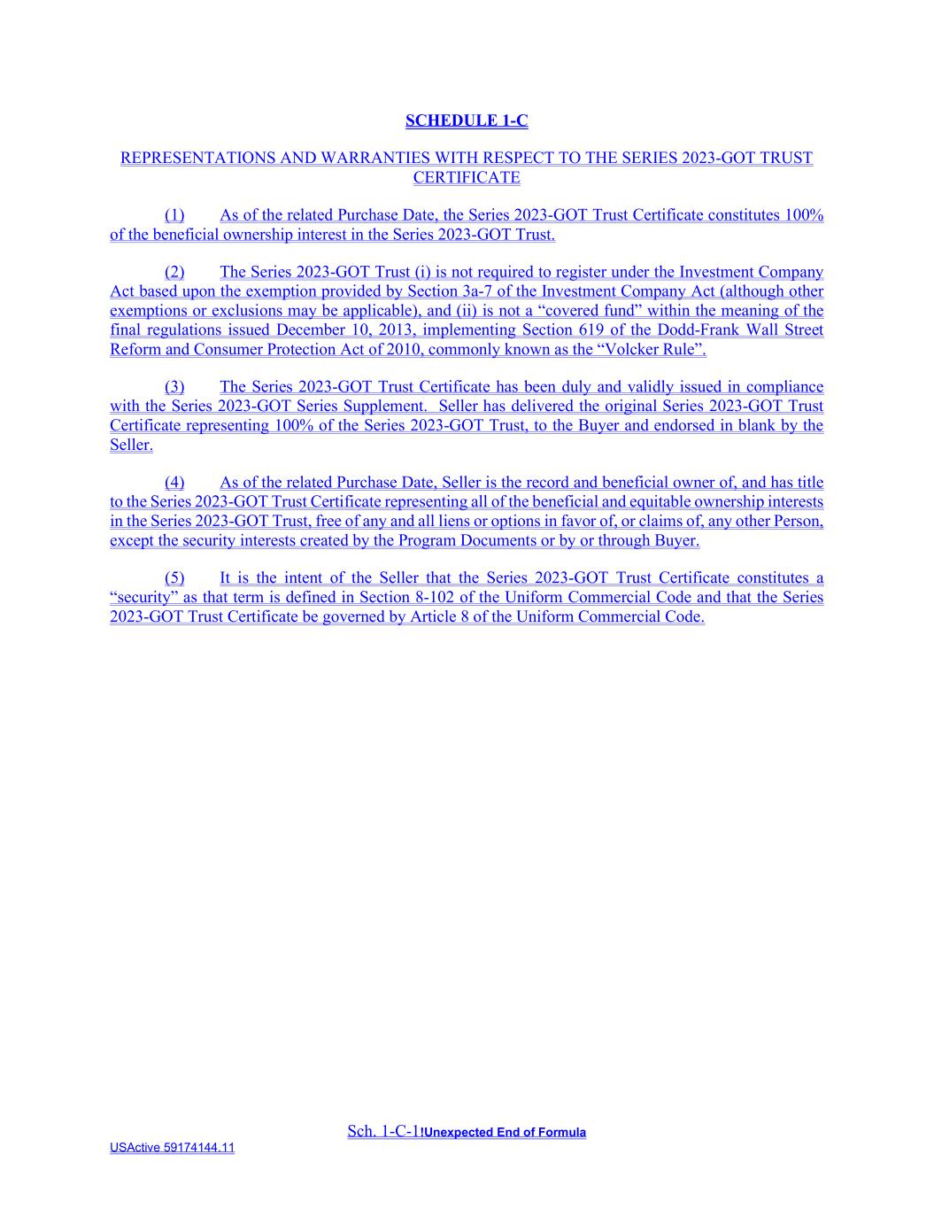 Sch. 1-C-1!Unexpected End of Formula USActive 59174144.11 SCHEDULE 1-C REPRESENTATIONS AND WARRANTIES WITH RESPECT TO THE SERIES 2023-GOT TRUST CERTIFICATE (1) As of the related Purchase Date, the Series 2023-GOT Trust Certificate constitutes 100% of the beneficial ownership interest in the Series 2023-GOT Trust. (2) The Series 2023-GOT Trust (i) is not required to register under the Investment Company Act based upon the exemption provided by Section 3a-7 of the Investment Company Act (although other exemptions or exclusions may be applicable), and (ii) is not a “covered fund” within the meaning of the final regulations issued December 10, 2013, implementing Section 619 of the Dodd-Frank Wall Street Reform and Consumer Protection Act of 2010, commonly known as the “Volcker Rule”. (3) The Series 2023-GOT Trust Certificate has been duly and validly issued in compliance with the Series 2023-GOT Series Supplement. Seller has delivered the original Series 2023-GOT Trust Certificate representing 100% of the Series 2023-GOT Trust, to the Buyer and endorsed in blank by the Seller. (4) As of the related Purchase Date, Seller is the record and beneficial owner of, and has title to the Series 2023-GOT Trust Certificate representing all of the beneficial and equitable ownership interests in the Series 2023-GOT Trust, free of any and all liens or options in favor of, or claims of, any other Person, except the security interests created by the Program Documents or by or through Buyer. (5) It is the intent of the Seller that the Series 2023-GOT Trust Certificate constitutes a “security” as that term is defined in Section 8-102 of the Uniform Commercial Code and that the Series 2023-GOT Trust Certificate be governed by Article 8 of the Uniform Commercial Code.