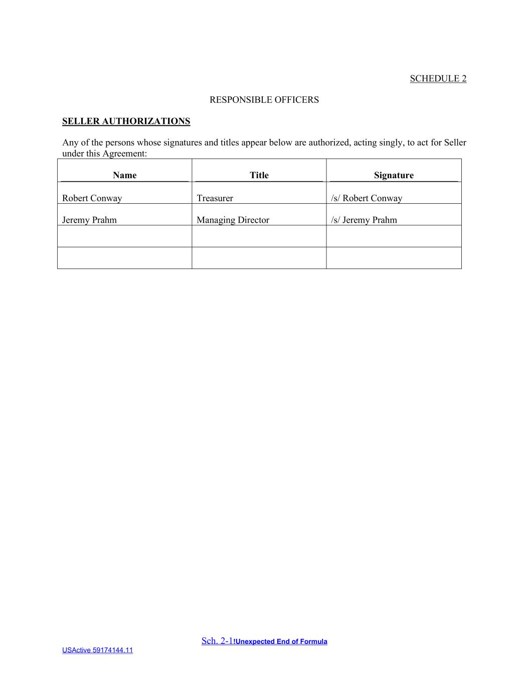 Sch. 2-1!Unexpected End of Formula USActive 59174144.11 SCHEDULE 2 RESPONSIBLE OFFICERS SELLER AUTHORIZATIONS Any of the persons whose signatures and titles appear below are authorized, acting singly, to act for Seller under this Agreement: Name Title Signature Robert Conway Treasurer /s/ Robert Conway Jeremy Prahm Managing Director /s/ Jeremy Prahm