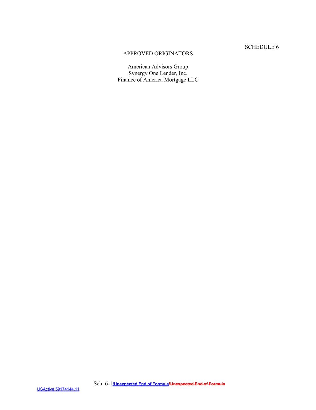 Sch. 6-1!Unexpected End of Formula!Unexpected End of Formula USActive 59174144.11 SCHEDULE 6 APPROVED ORIGINATORS American Advisors Group Synergy One Lender, Inc. Finance of America Mortgage LLC