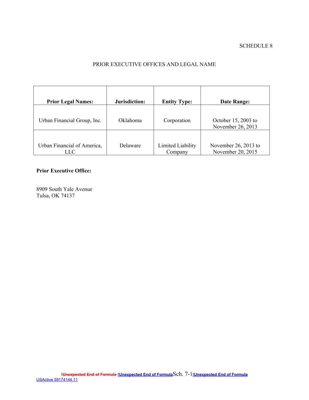 !Unexpected End of Formula !Unexpected End of FormulaSch. 7-1!Unexpected End of Formula USActive 59174144.11 SCHEDULE 8 PRIOR EXECUTIVE OFFICES AND LEGAL NAME Prior Legal Names: Jurisdiction: Entity Type: Date Range: Urban Financial Group, Inc. Oklahoma Corporation October 15, 2003 to November 26, 2013 Urban Financial of America, LLC Delaware Limited Liability Company November 26, 2013 to November 20, 2015 Prior Executive Office: 8909 South Yale Avenue Tulsa, OK 74137