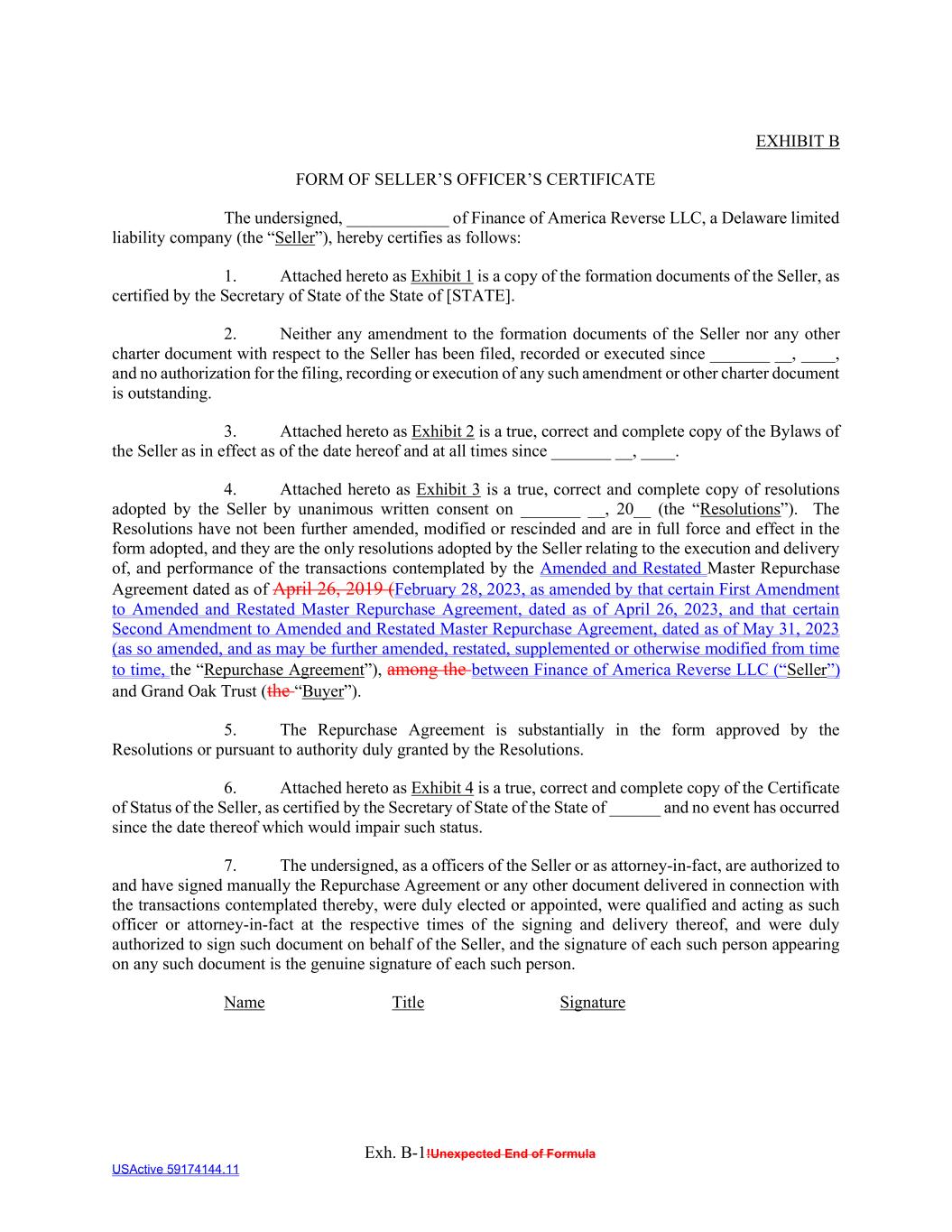 Exh. B-1!Unexpected End of Formula USActive 59174144.11 EXHIBIT B FORM OF SELLER’S OFFICER’S CERTIFICATE The undersigned, ____________ of Finance of America Reverse LLC, a Delaware limited liability company (the “Seller”), hereby certifies as follows: 1. Attached hereto as Exhibit 1 is a copy of the formation documents of the Seller, as certified by the Secretary of State of the State of [STATE]. 2. Neither any amendment to the formation documents of the Seller nor any other charter document with respect to the Seller has been filed, recorded or executed since _______ __, ____, and no authorization for the filing, recording or execution of any such amendment or other charter document is outstanding. 3. Attached hereto as Exhibit 2 is a true, correct and complete copy of the Bylaws of the Seller as in effect as of the date hereof and at all times since _______ __, ____. 4. Attached hereto as Exhibit 3 is a true, correct and complete copy of resolutions adopted by the Seller by unanimous written consent on _______ __, 20__ (the “Resolutions”). The Resolutions have not been further amended, modified or rescinded and are in full force and effect in the form adopted, and they are the only resolutions adopted by the Seller relating to the execution and delivery of, and performance of the transactions contemplated by the Amended and Restated Master Repurchase Agreement dated as of April 26, 2019 (February 28, 2023, as amended by that certain First Amendment to Amended and Restated Master Repurchase Agreement, dated as of April 26, 2023, and that certain Second Amendment to Amended and Restated Master Repurchase Agreement, dated as of May 31, 2023 (as so amended, and as may be further amended, restated, supplemented or otherwise modified from time to time, the “Repurchase Agreement”), among the between Finance of America Reverse LLC (“Seller”) and Grand Oak Trust (the “Buyer”). 5. The Repurchase Agreement is substantially in the form approved by the Resolutions or pursuant to authority duly granted by the Resolutions. 6. Attached hereto as Exhibit 4 is a true, correct and complete copy of the Certificate of Status of the Seller, as certified by the Secretary of State of the State of ______ and no event has occurred since the date thereof which would impair such status. 7. The undersigned, as a officers of the Seller or as attorney-in-fact, are authorized to and have signed manually the Repurchase Agreement or any other document delivered in connection with the transactions contemplated thereby, were duly elected or appointed, were qualified and acting as such officer or attorney-in-fact at the respective times of the signing and delivery thereof, and were duly authorized to sign such document on behalf of the Seller, and the signature of each such person appearing on any such document is the genuine signature of each such person. Name Title Signature