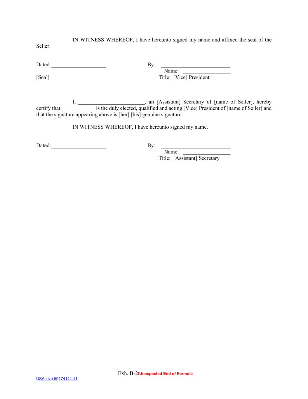 Exh. B-2!Unexpected End of Formula USActive 59174144.11 IN WITNESS WHEREOF, I have hereunto signed my name and affixed the seal of the Seller. Dated:____________________ [Seal] By: _________________________ Name: _________________ Title: [Vice] President I, ________________________, an [Assistant] Secretary of [name of Seller], hereby certify that ____________ is the duly elected, qualified and acting [Vice] President of [name of Seller] and that the signature appearing above is [her] [his] genuine signature. IN WITNESS WHEREOF, I have hereunto signed my name. Dated:____________________ By: _________________________ Name: _________________ Title: [Assistant] Secretary