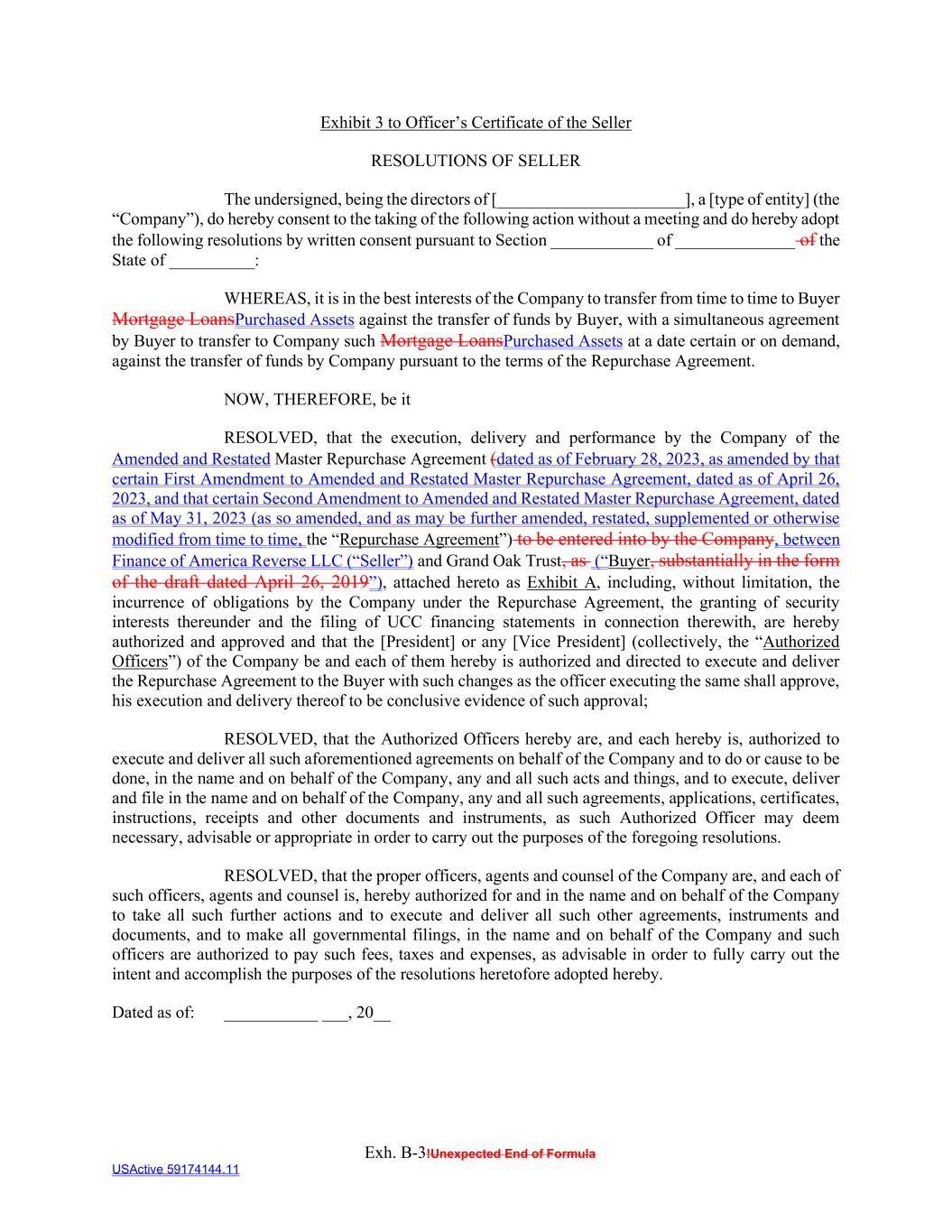 Exh. B-3!Unexpected End of Formula USActive 59174144.11 Exhibit 3 to Officer’s Certificate of the Seller RESOLUTIONS OF SELLER The undersigned, being the directors of [______________________], a [type of entity] (the “Company”), do hereby consent to the taking of the following action without a meeting and do hereby adopt the following resolutions by written consent pursuant to Section ____________ of ______________ of the State of __________: WHEREAS, it is in the best interests of the Company to transfer from time to time to Buyer Mortgage LoansPurchased Assets against the transfer of funds by Buyer, with a simultaneous agreement by Buyer to transfer to Company such Mortgage LoansPurchased Assets at a date certain or on demand, against the transfer of funds by Company pursuant to the terms of the Repurchase Agreement. NOW, THEREFORE, be it RESOLVED, that the execution, delivery and performance by the Company of the Amended and Restated Master Repurchase Agreement (dated as of February 28, 2023, as amended by that certain First Amendment to Amended and Restated Master Repurchase Agreement, dated as of April 26, 2023, and that certain Second Amendment to Amended and Restated Master Repurchase Agreement, dated as of May 31, 2023 (as so amended, and as may be further amended, restated, supplemented or otherwise modified from time to time, the “Repurchase Agreement”) to be entered into by the Company, between Finance of America Reverse LLC (“Seller”) and Grand Oak Trust, as (“Buyer, substantially in the form of the draft dated April 26, 2019”), attached hereto as Exhibit A, including, without limitation, the incurrence of obligations by the Company under the Repurchase Agreement, the granting of security interests thereunder and the filing of UCC financing statements in connection therewith, are hereby authorized and approved and that the [President] or any [Vice President] (collectively, the “Authorized Officers”) of the Company be and each of them hereby is authorized and directed to execute and deliver the Repurchase Agreement to the Buyer with such changes as the officer executing the same shall approve, his execution and delivery thereof to be conclusive evidence of such approval; RESOLVED, that the Authorized Officers hereby are, and each hereby is, authorized to execute and deliver all such aforementioned agreements on behalf of the Company and to do or cause to be done, in the name and on behalf of the Company, any and all such acts and things, and to execute, deliver and file in the name and on behalf of the Company, any and all such agreements, applications, certificates, instructions, receipts and other documents and instruments, as such Authorized Officer may deem necessary, advisable or appropriate in order to carry out the purposes of the foregoing resolutions. RESOLVED, that the proper officers, agents and counsel of the Company are, and each of such officers, agents and counsel is, hereby authorized for and in the name and on behalf of the Company to take all such further actions and to execute and deliver all such other agreements, instruments and documents, and to make all governmental filings, in the name and on behalf of the Company and such officers are authorized to pay such fees, taxes and expenses, as advisable in order to fully carry out the intent and accomplish the purposes of the resolutions heretofore adopted hereby. Dated as of: ___________ ___, 20__