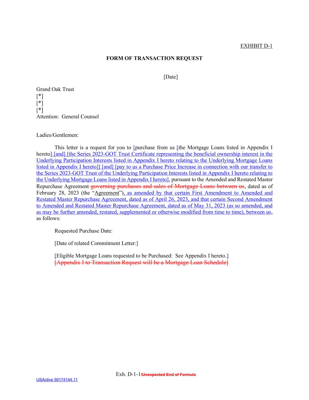 Exh. D-1-1!Unexpected End of Formula USActive 59174144.11 EXHIBIT D-1 FORM OF TRANSACTION REQUEST [Date] Grand Oak Trust [*] [*] [*] Attention: General Counsel Ladies/Gentlemen: This letter is a request for you to [purchase from us [the Mortgage Loans listed in Appendix I hereto] [and] [the Series 2023-GOT Trust Certificate representing the beneficial ownership interest in the Underlying Participation Interests listed in Appendix I hereto relating to the Underlying Mortgage Loans listed in Appendix I hereto]] [and] [pay to us a Purchase Price Increase in connection with our transfer to the Series 2023-GOT Trust of the Underlying Participation Interests listed in Appendix I hereto relating to the Underlying Mortgage Loans listed in Appendix I hereto], pursuant to the Amended and Restated Master Repurchase Agreement governing purchases and sales of Mortgage Loans between us, dated as of February 28, 2023 (the “Agreement”), as amended by that certain First Amendment to Amended and Restated Master Repurchase Agreement, dated as of April 26, 2023, and that certain Second Amendment to Amended and Restated Master Repurchase Agreement, dated as of May 31, 2023 (as so amended, and as may be further amended, restated, supplemented or otherwise modified from time to time), between us, as follows: Requested Purchase Date: [Date of related Commitment Letter:] [Eligible Mortgage Loans requested to be Purchased: See Appendix I hereto.] [Appendix I to Transaction Request will be a Mortgage Loan Schedule]