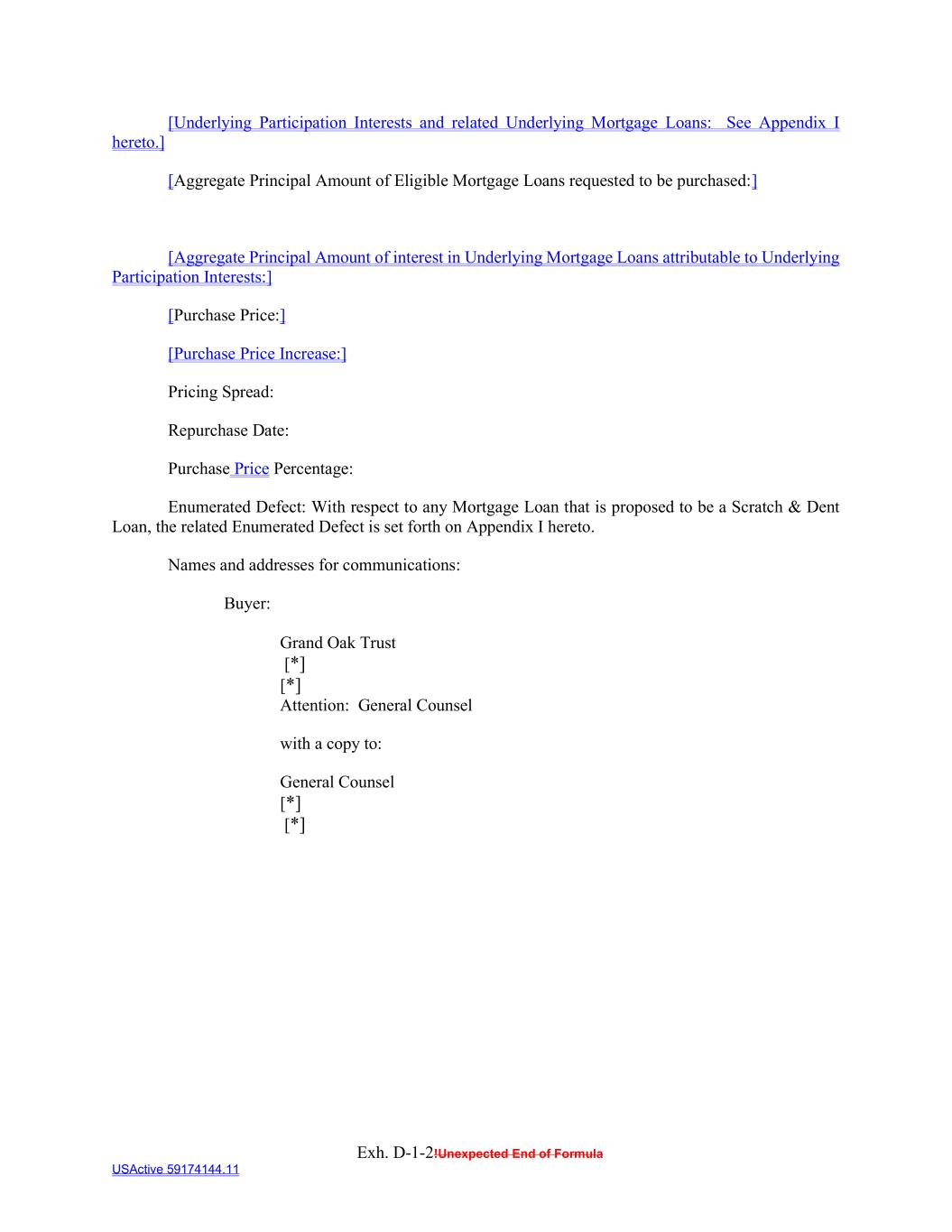 Exh. D-1-2!Unexpected End of Formula USActive 59174144.11 [Underlying Participation Interests and related Underlying Mortgage Loans: See Appendix I hereto.] [Aggregate Principal Amount of Eligible Mortgage Loans requested to be purchased:] [Aggregate Principal Amount of interest in Underlying Mortgage Loans attributable to Underlying Participation Interests:] [Purchase Price:] [Purchase Price Increase:] Pricing Spread: Repurchase Date: Purchase Price Percentage: Enumerated Defect: With respect to any Mortgage Loan that is proposed to be a Scratch & Dent Loan, the related Enumerated Defect is set forth on Appendix I hereto. Names and addresses for communications: Buyer: Grand Oak Trust [*] [*] Attention: General Counsel with a copy to: General Counsel [*] [*]